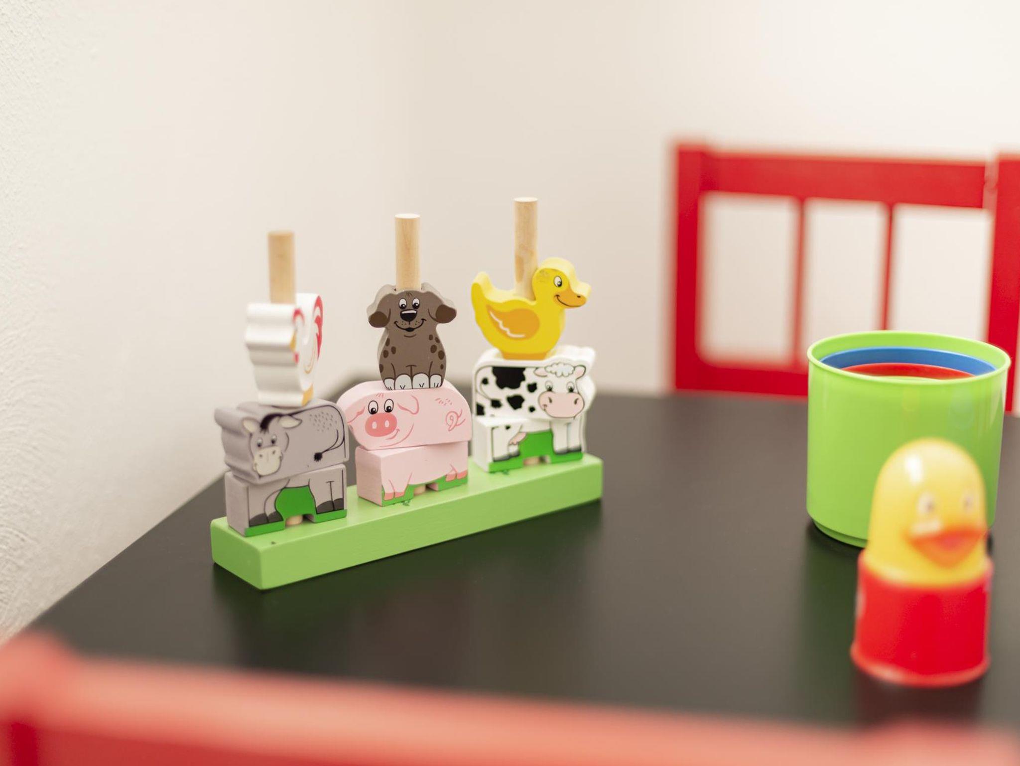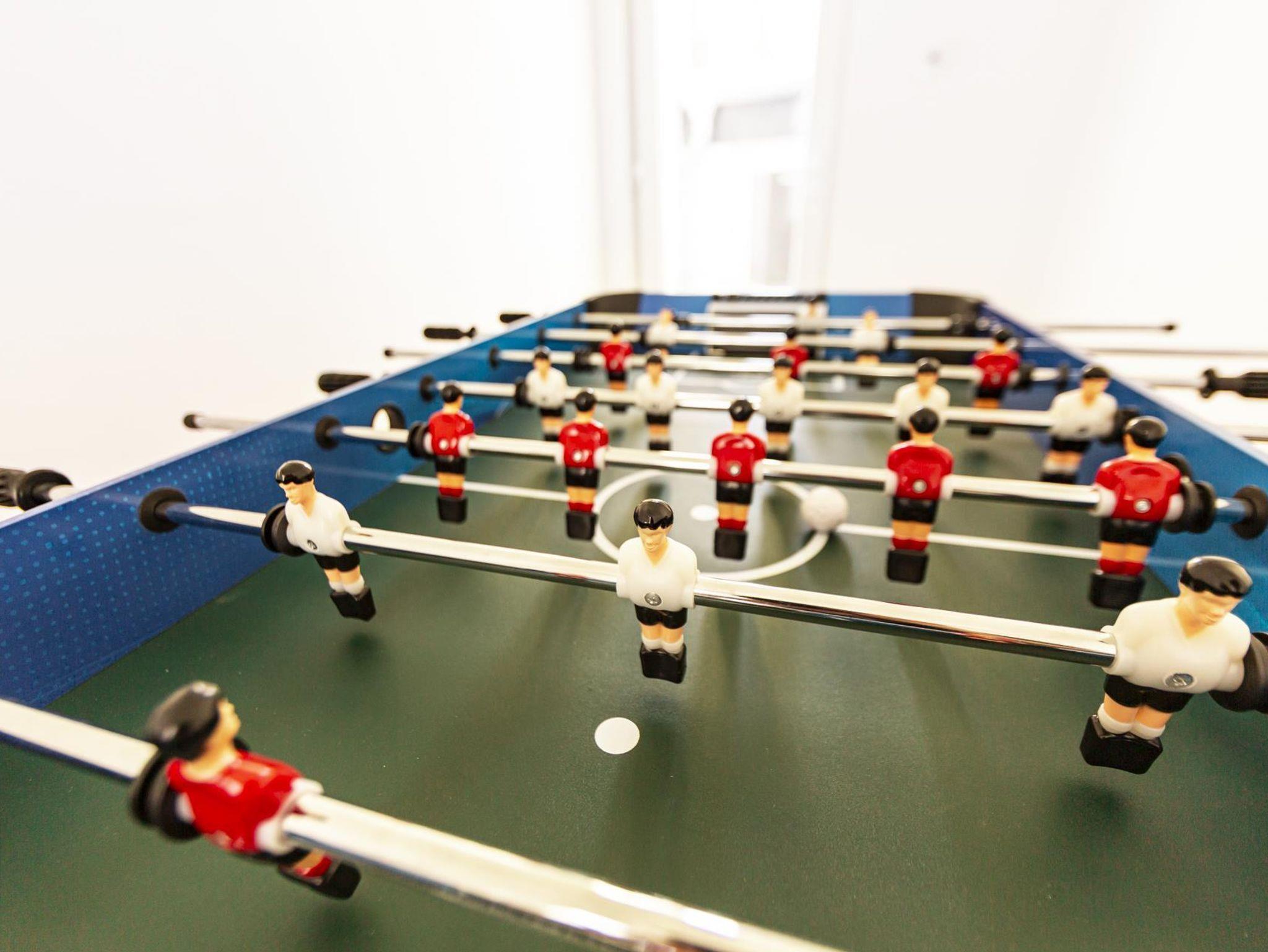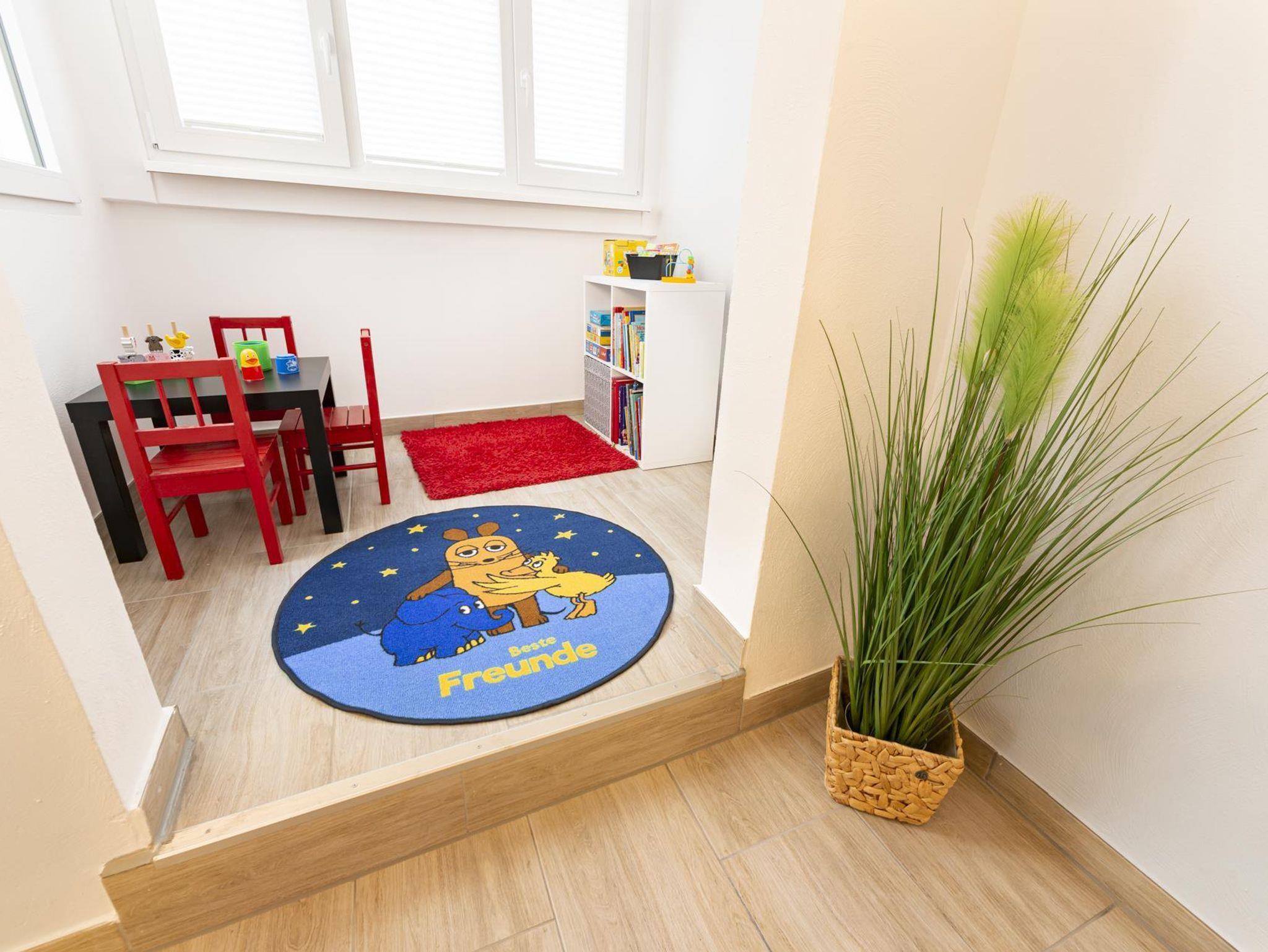 Für die Kleinen gibt es im EG einen gut ausgestatteten Spielbereich. Größere Kinder finden in dem Freizeitzimmer, das über den Lichthof erreicht wird, einen Tischkicker vor.