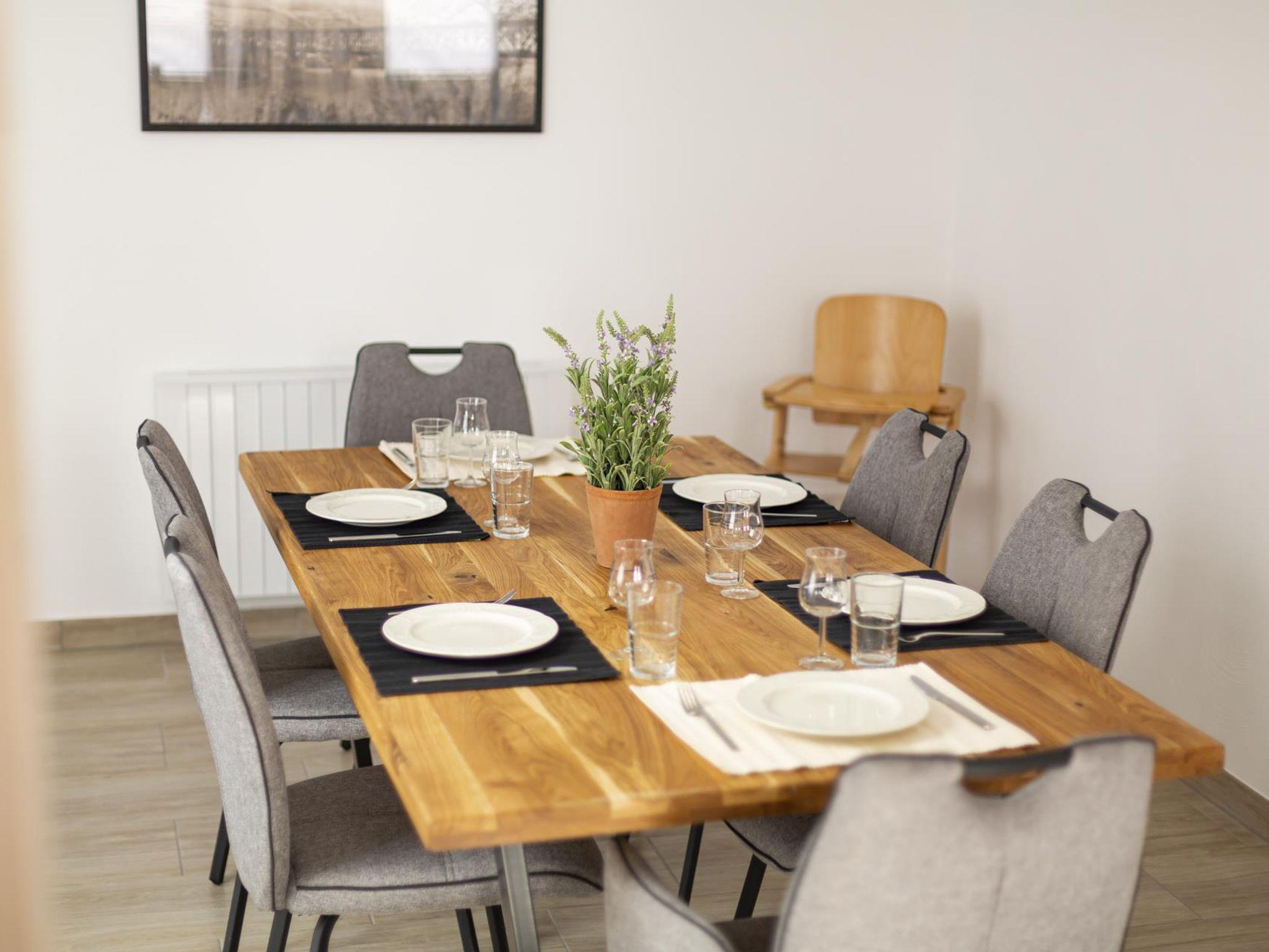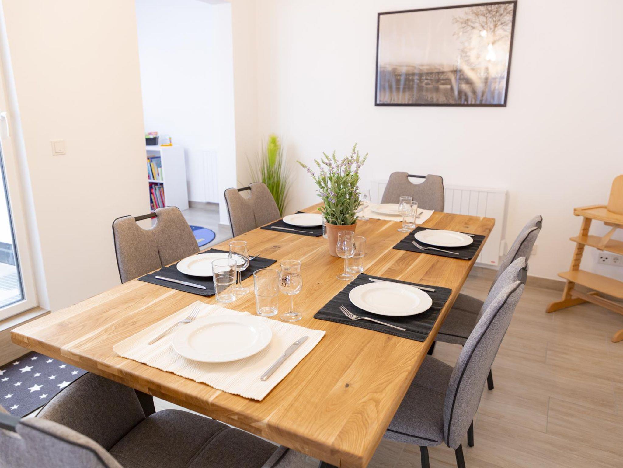 Die großzügige Küche mit Kochinsel und Induktionsherd, Backofen, Geschirrspüler und Kühl-/Gefrierkombination laden zu entspannten Kochabenden ein. Selbstverständlich sind auch eine Kaffeemaschine, Wasser- und Eierkocher sowie ein Toaster vorhanden. Im angrenzenden geräumigen rustikalen Essbereich können Sie zu Ihren zubereiteten Mahlzeiten ein gutes Glas Moselwein genießen.