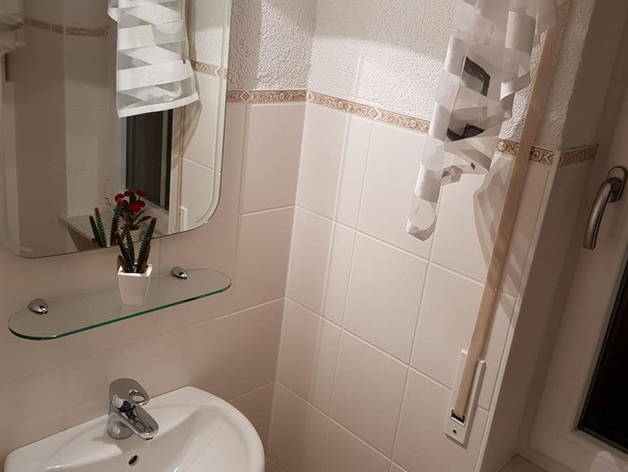 Das großzügige Bad umfasst neben Dusche und WC auch einen Handtuchheizkörper. Ein Gäste-WC steht ebenfalls zur Verfügung.