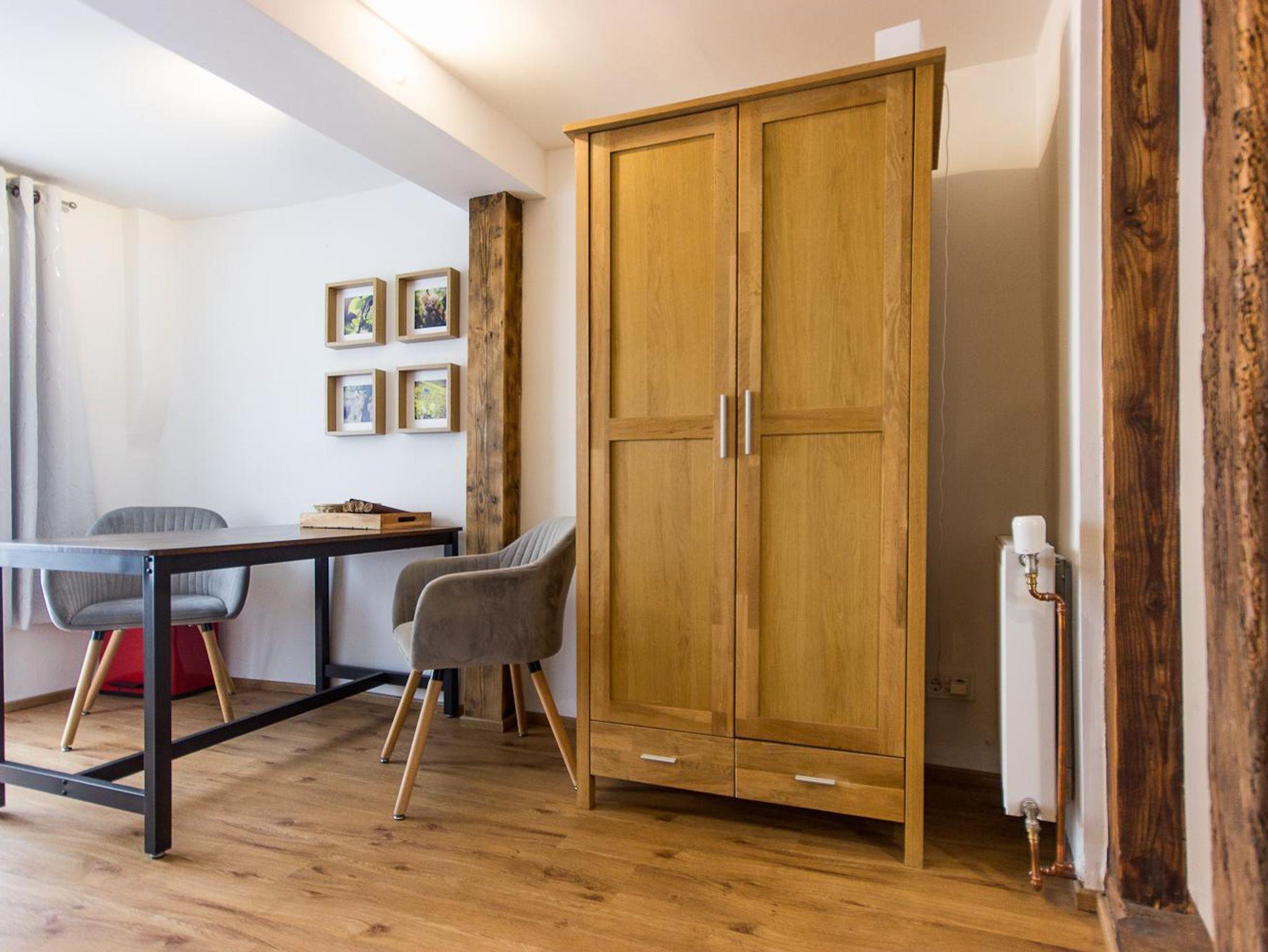 Unser 36 m² großes Appartement bietet Ihnen eine gemütliche Wohlfühlatmosphäre und eine komplette Ausstattung für Ihren Aufenthalt. Das Highlight ist die private Terrasse mit Tisch, zwei Stühlen und Sonnenschirm – genießen Sie den Blick auf die umliegenden Weinberge und die Rosenberg-Burgruine.
