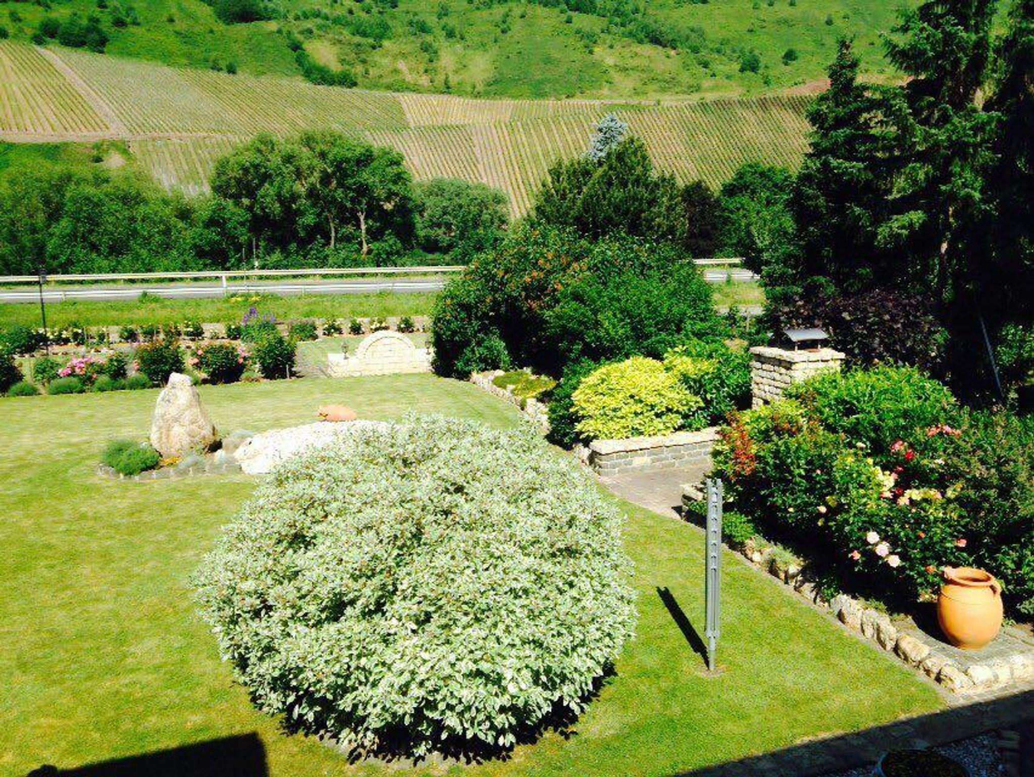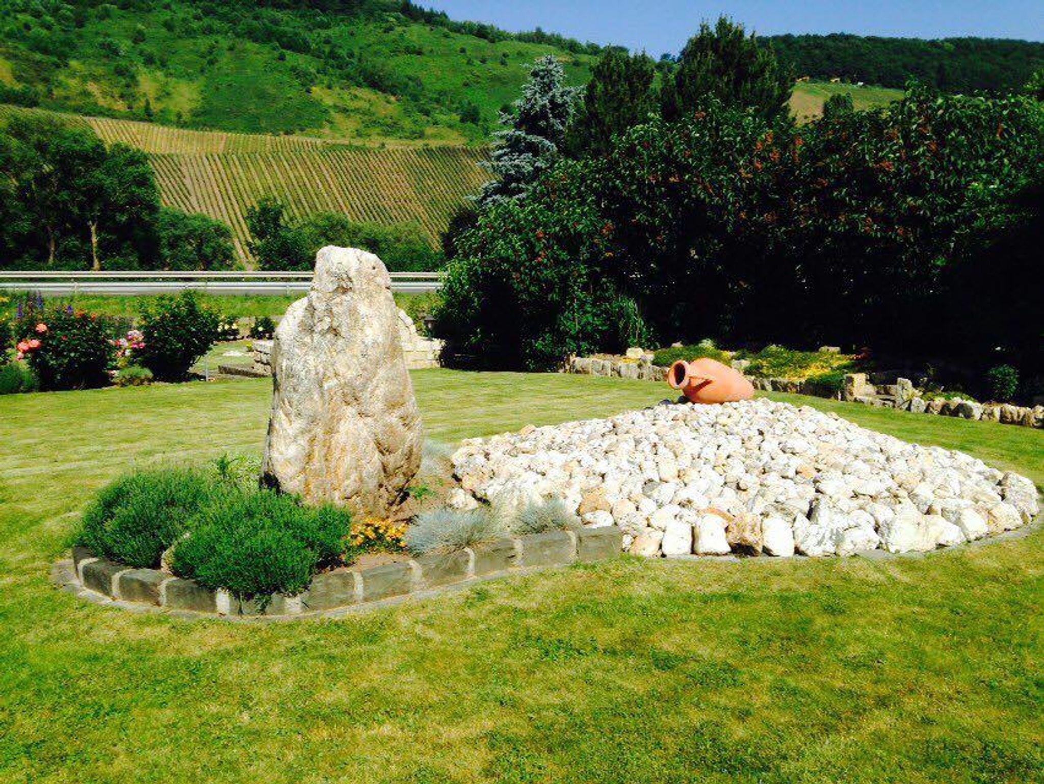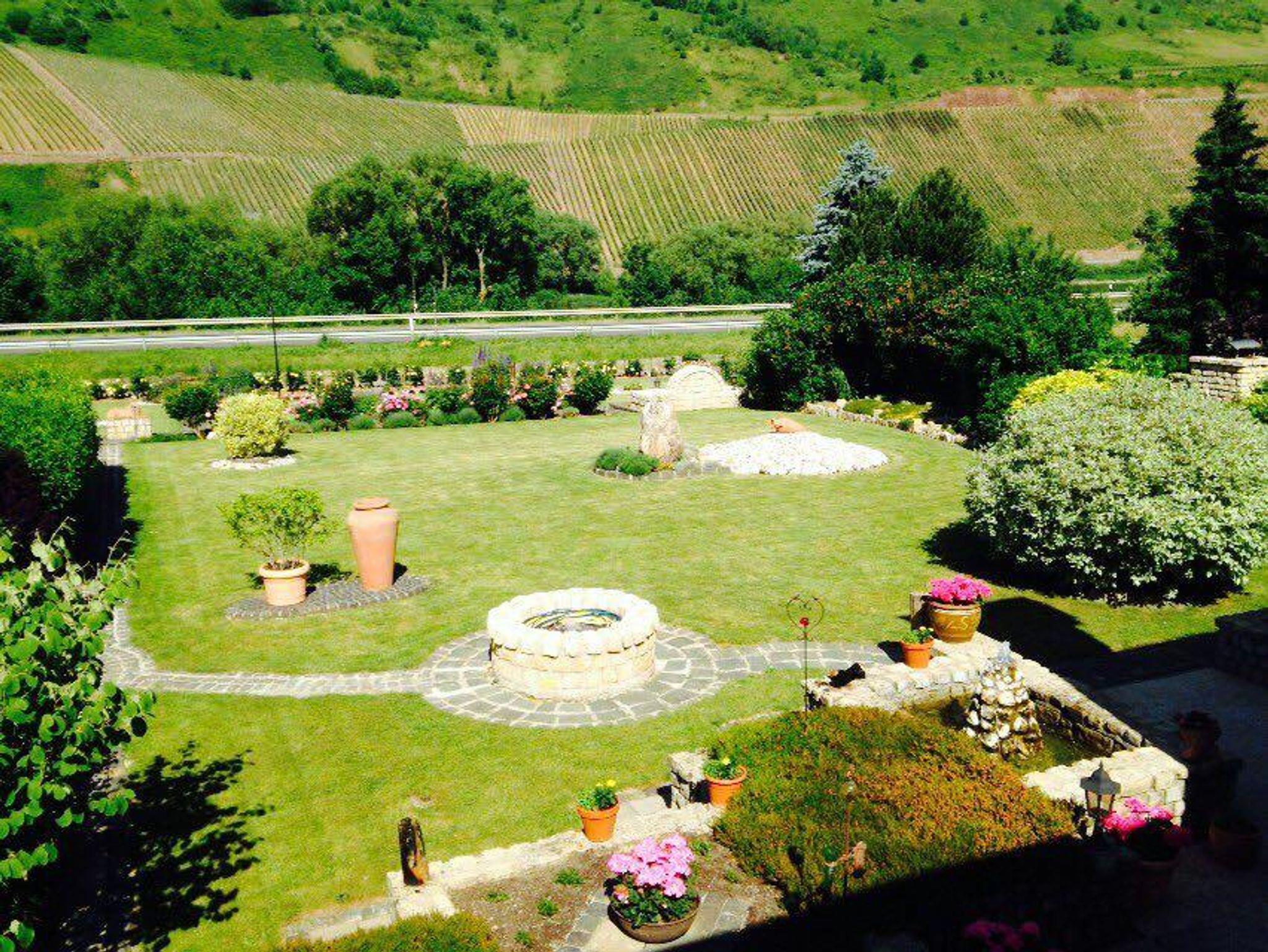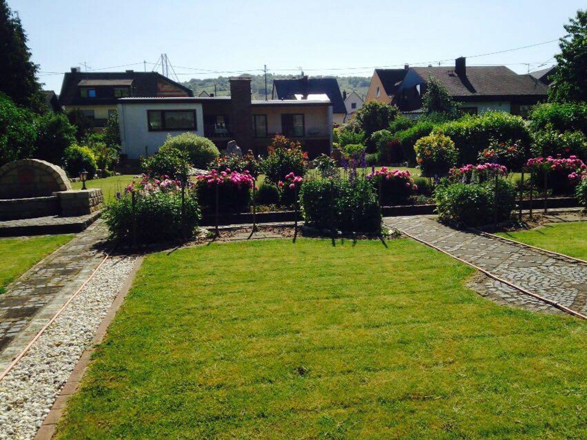 In unserem Hause befindet sich im Souterrain eine Ferienwohnung von 58qm. Die Wohnung hat einen separaten Eingang und ist auch für Rollstuhlfahrer geeignet. Die Wohnung besteht aus einem Wohnraum, einer Wohnküche, einem Schlafzimmer mit Doppelbett, und einem zusätzlichen Einzelzimmer neben der Ferienwohnung, einem Bad mit Dusche und WC sowie einem Abstellraum mit separatem WC und Waschgelegenheit. Großer Flachbildschirm-TV mit Sat-Anlage ist vorhanden. Die Ferienwohnung hat einen eigenen Eingang. Vom Wohnraum und dem Doppelschlafzimmer (beide mit großen Flügeltüren) gelangen Sie direkt in die Gartenanlage zu einem großen Freiplatz mit geschützter Sitzecke, Naturstein-Blumenbeet mit Brunnenanlage. Im Anschluß daran befindet sich eine parkähnliche Liegewiese mit Grillecke und ein Blumengarten. Der Panoramablick in das der Mosel gegenüberliegende Weinbergs- und Waldgelände und Blick auf den Startplatz für Paragleiter vervollständigt das Ganze. Die gesamte Gartenanlage hat eine Größe von ca. 1.400 qm. Das ganze Anwesen befindet sich in einer ruhigen, reizvollen Lage am Ortsrand des Ortsteiles Rachtig, unmittelbar am Rad- und Wanderweg. Parkplatz ist vorhanden; Geschirr, Bettwäsche und Handtücher werden gestellt.