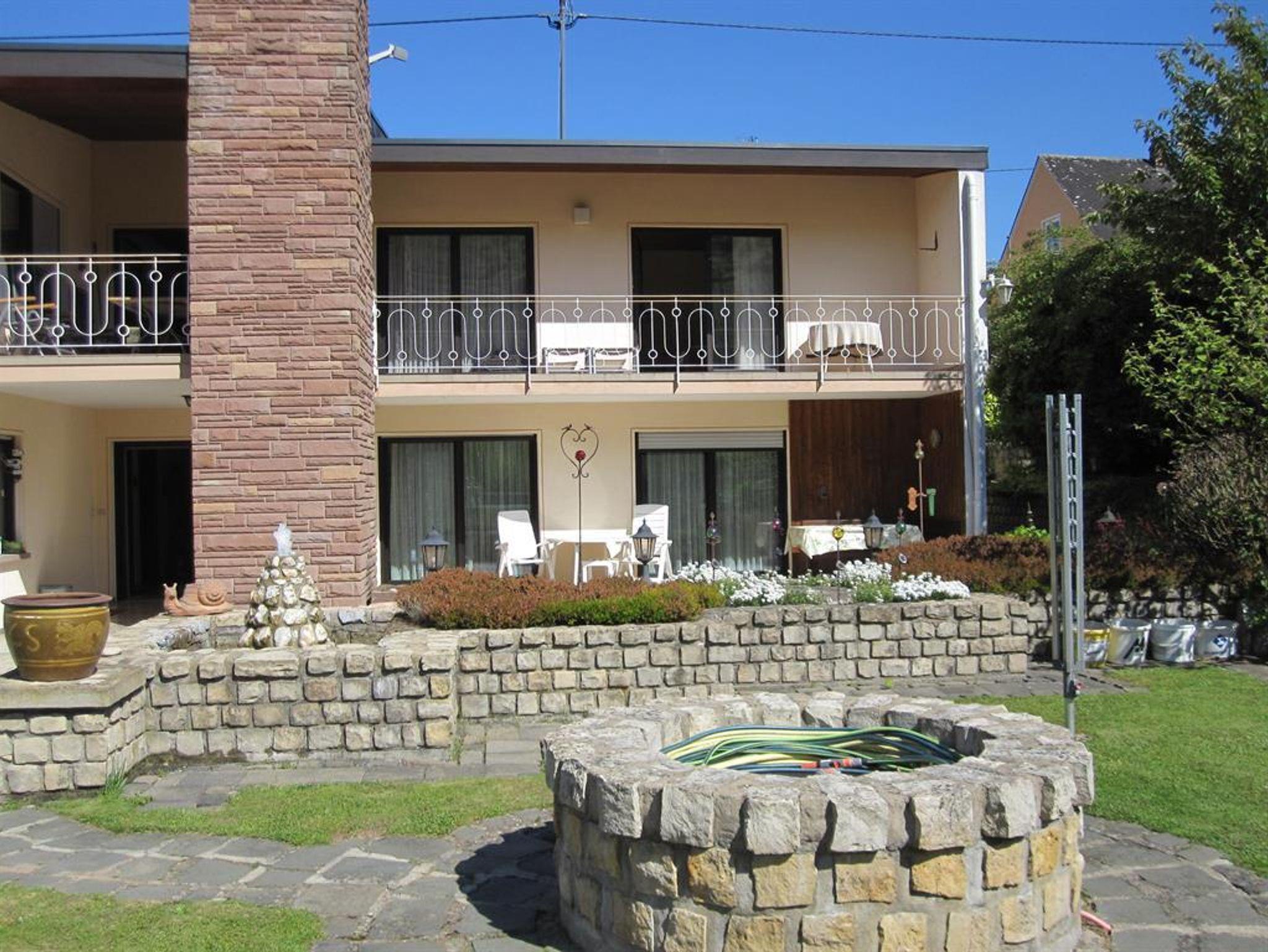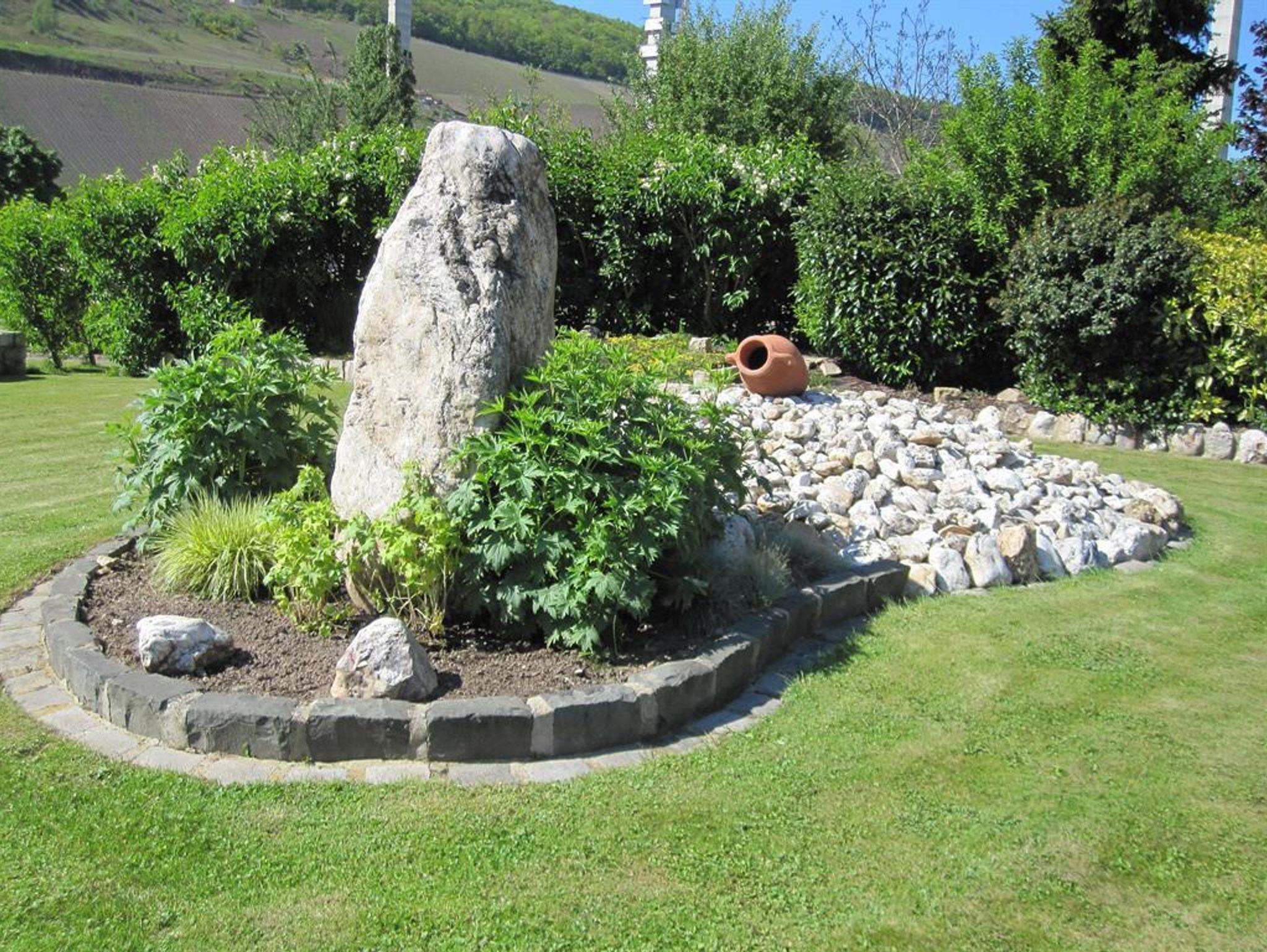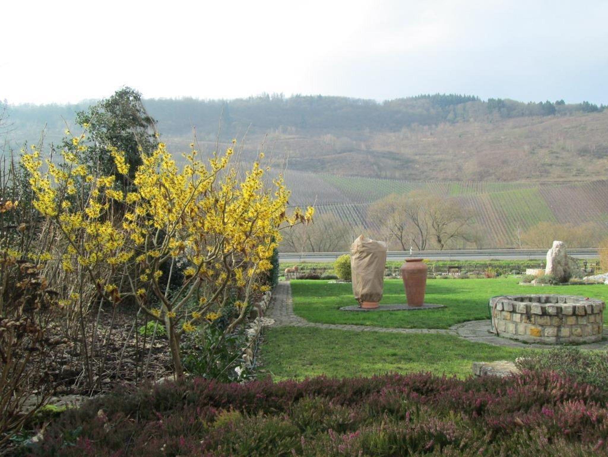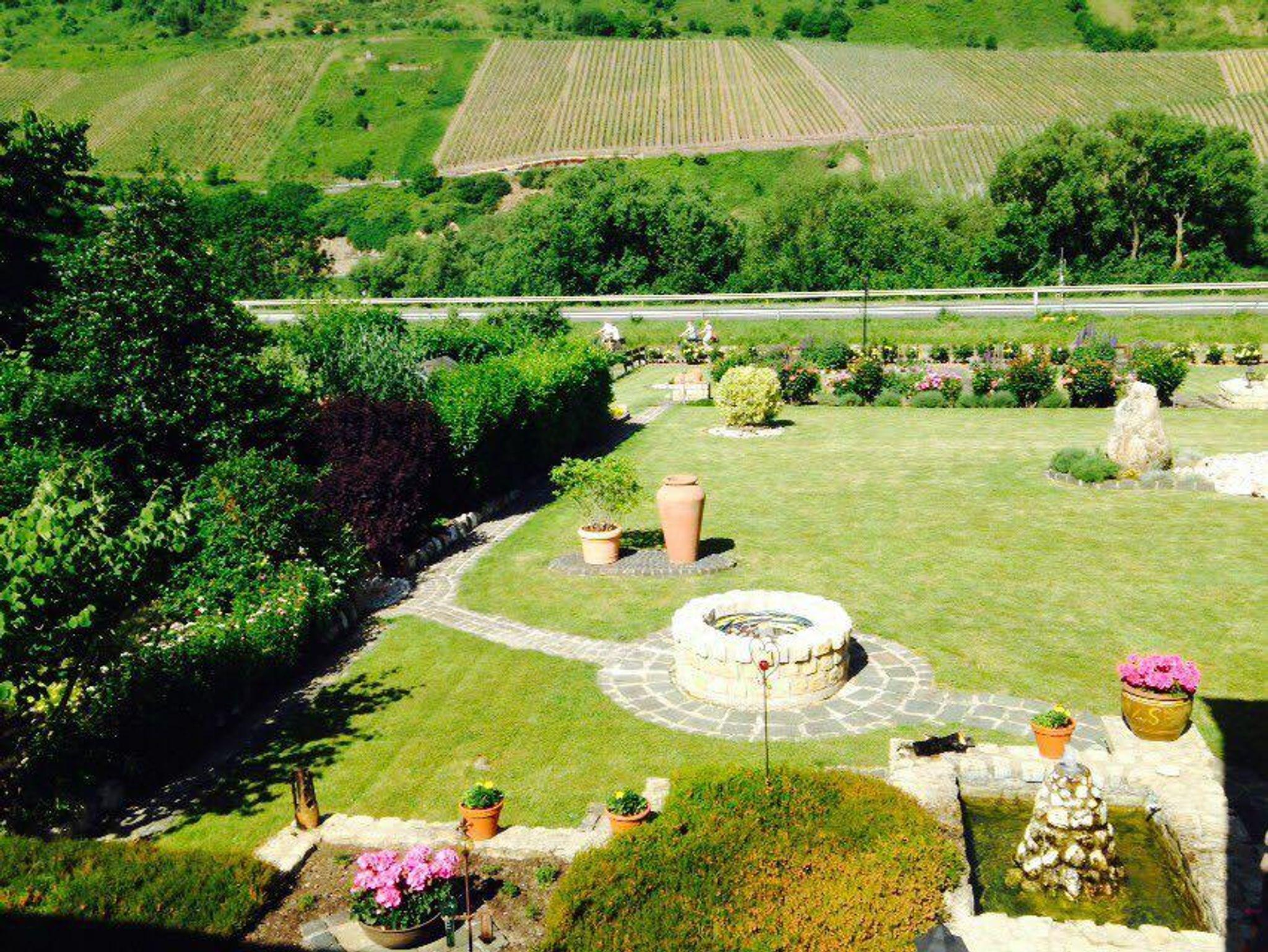 In unserem Hause befindet sich im Souterrain eine Ferienwohnung von 58qm. Die Wohnung hat einen separaten Eingang und ist auch für Rollstuhlfahrer geeignet. Die Wohnung besteht aus einem Wohnraum, einer Wohnküche, einem Schlafzimmer mit Doppelbett, und einem zusätzlichen Einzelzimmer neben der Ferienwohnung, einem Bad mit Dusche und WC sowie einem Abstellraum mit separatem WC und Waschgelegenheit. Großer Flachbildschirm-TV mit Sat-Anlage ist vorhanden. Die Ferienwohnung hat einen eigenen Eingang. Vom Wohnraum und dem Doppelschlafzimmer (beide mit großen Flügeltüren) gelangen Sie direkt in die Gartenanlage zu einem großen Freiplatz mit geschützter Sitzecke, Naturstein-Blumenbeet mit Brunnenanlage. Im Anschluß daran befindet sich eine parkähnliche Liegewiese mit Grillecke und ein Blumengarten. Der Panoramablick in das der Mosel gegenüberliegende Weinbergs- und Waldgelände und Blick auf den Startplatz für Paragleiter vervollständigt das Ganze. Die gesamte Gartenanlage hat eine Größe von ca. 1.400 qm. Das ganze Anwesen befindet sich in einer ruhigen, reizvollen Lage am Ortsrand des Ortsteiles Rachtig, unmittelbar am Rad- und Wanderweg. Parkplatz ist vorhanden; Geschirr, Bettwäsche und Handtücher werden gestellt.