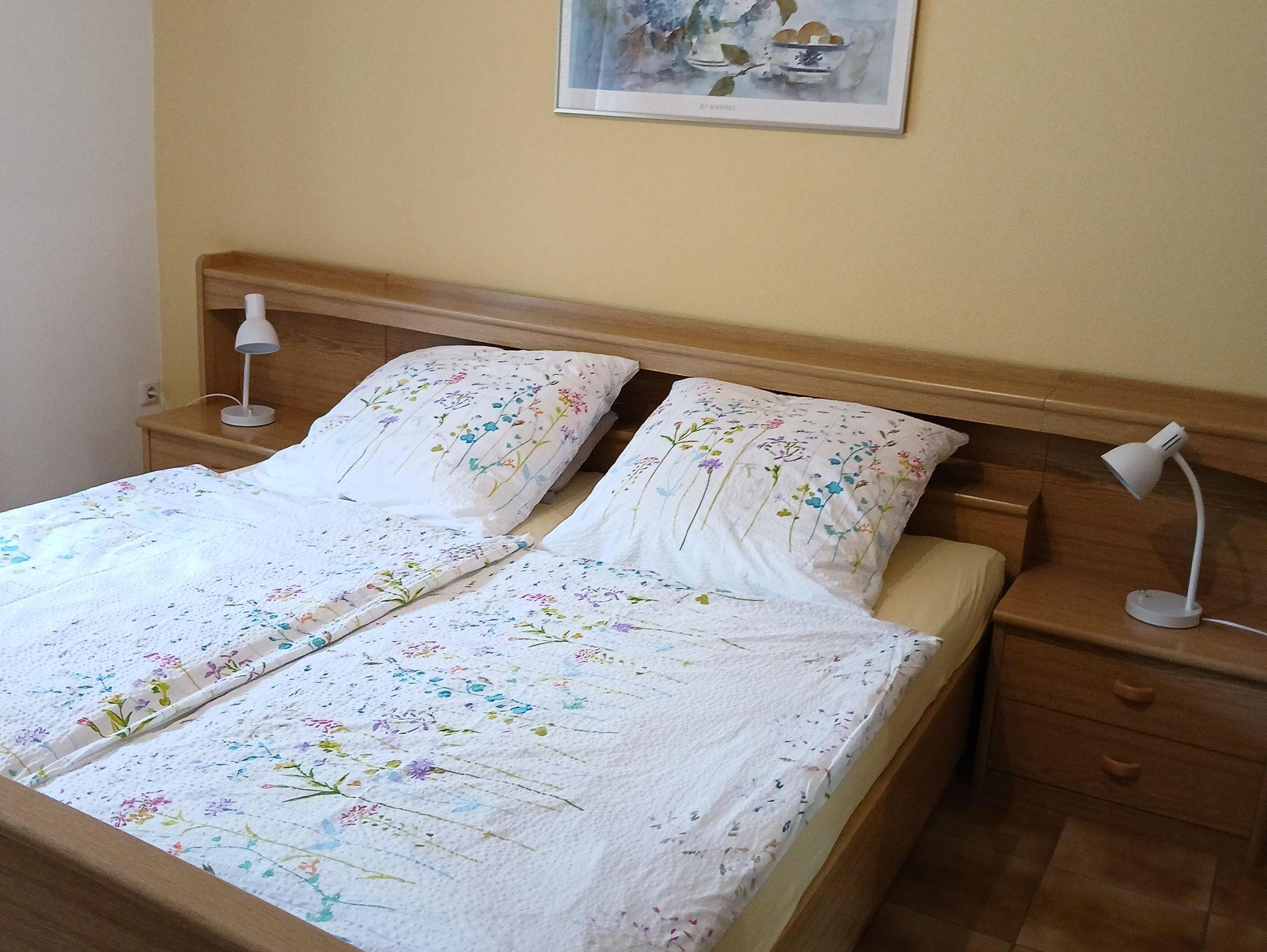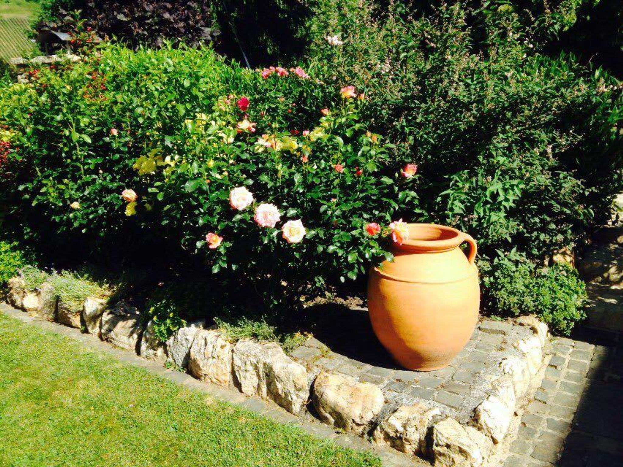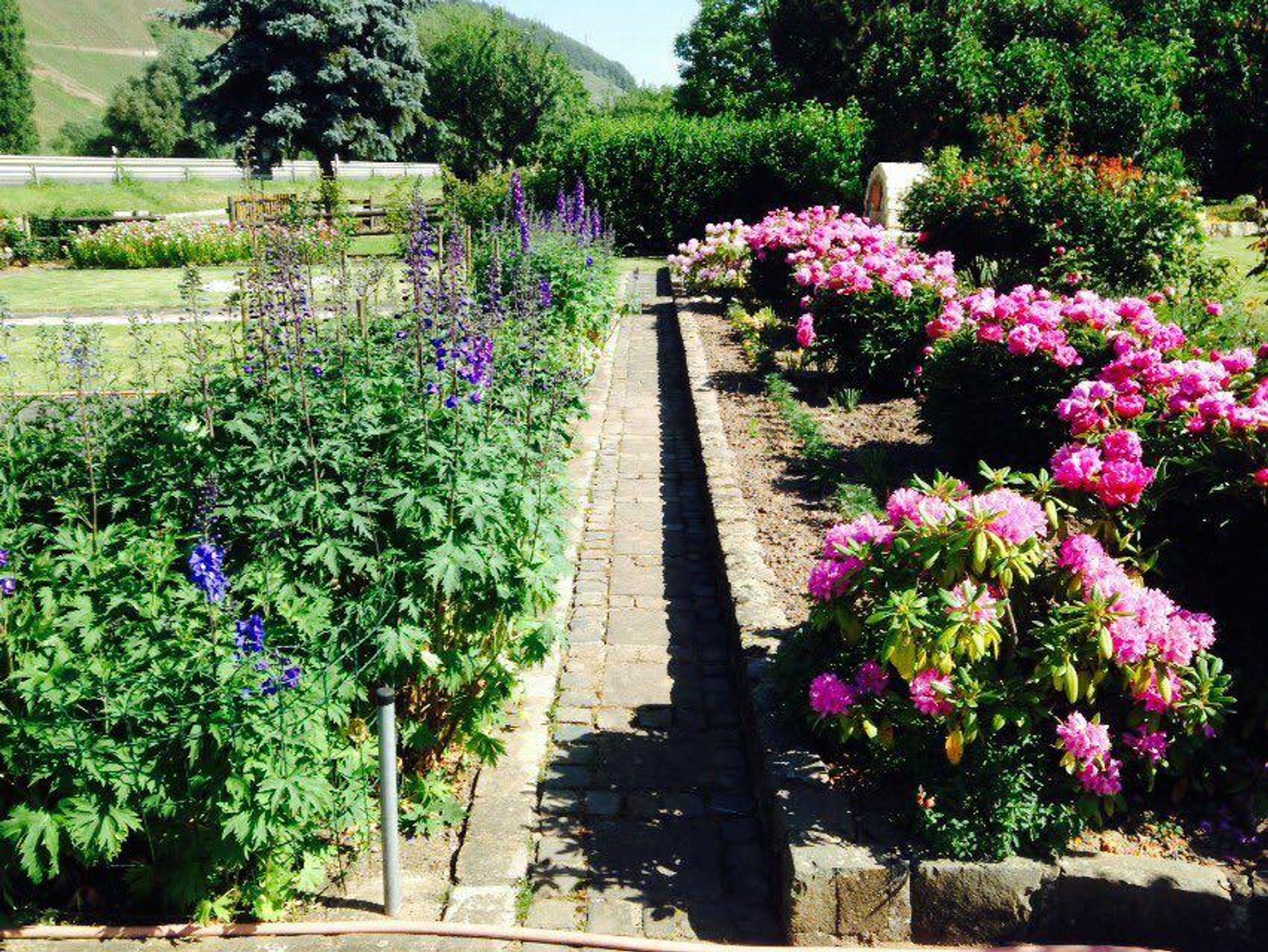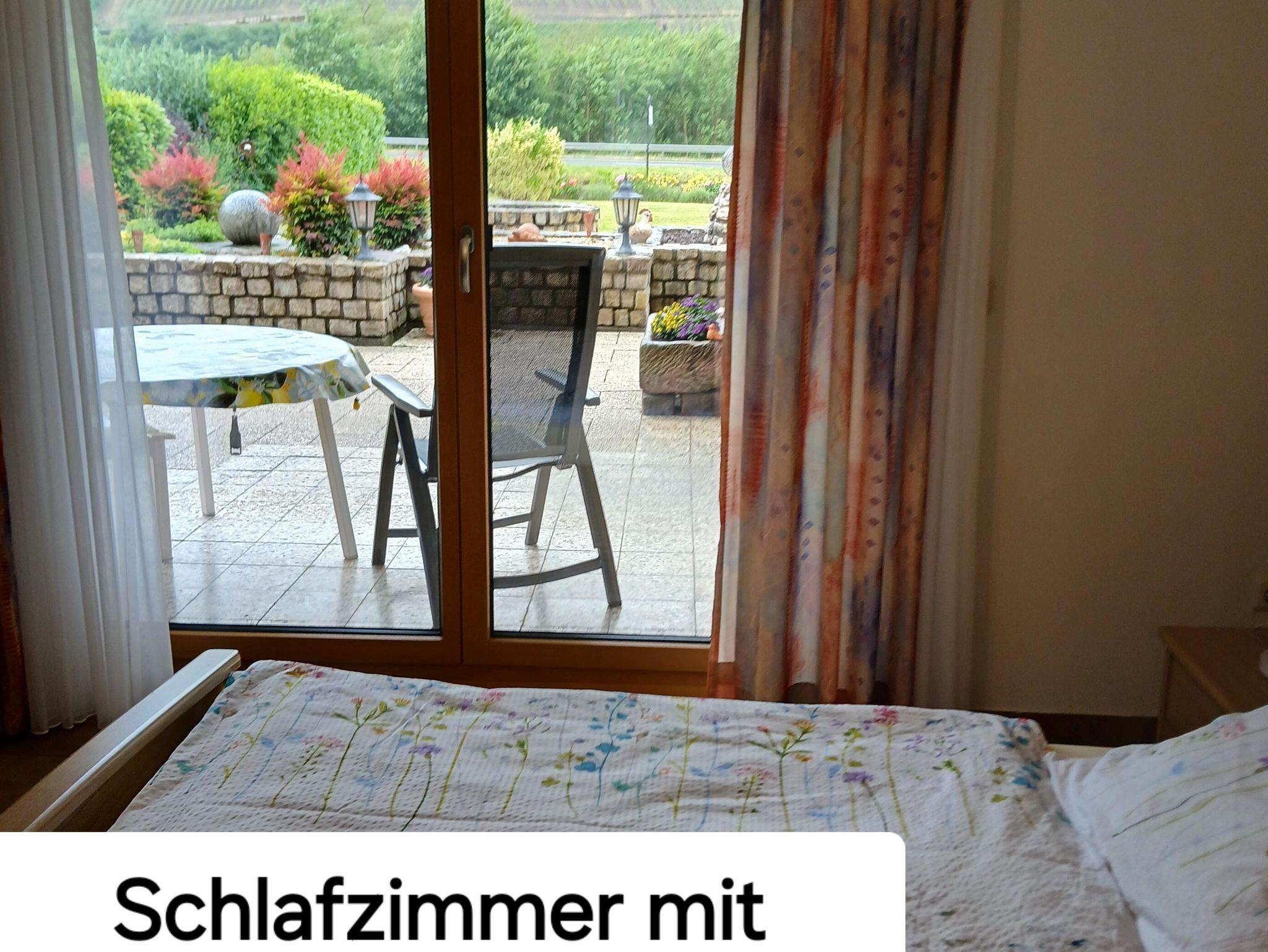 In unserem Hause befindet sich im Souterrain eine Ferienwohnung von 58qm. Die Wohnung hat einen separaten Eingang und ist auch für Rollstuhlfahrer geeignet. Die Wohnung besteht aus einem Wohnraum, einer Wohnküche, einem Schlafzimmer mit Doppelbett, und einem zusätzlichen Einzelzimmer neben der Ferienwohnung, einem Bad mit Dusche und WC sowie einem Abstellraum mit separatem WC und Waschgelegenheit. Großer Flachbildschirm-TV mit Sat-Anlage ist vorhanden. Die Ferienwohnung hat einen eigenen Eingang. Vom Wohnraum und dem Doppelschlafzimmer (beide mit großen Flügeltüren) gelangen Sie direkt in die Gartenanlage zu einem großen Freiplatz mit geschützter Sitzecke, Naturstein-Blumenbeet mit Brunnenanlage. Im Anschluß daran befindet sich eine parkähnliche Liegewiese mit Grillecke und ein Blumengarten. Der Panoramablick in das der Mosel gegenüberliegende Weinbergs- und Waldgelände und Blick auf den Startplatz für Paragleiter vervollständigt das Ganze. Die gesamte Gartenanlage hat eine Größe von ca. 1.400 qm. Das ganze Anwesen befindet sich in einer ruhigen, reizvollen Lage am Ortsrand des Ortsteiles Rachtig, unmittelbar am Rad- und Wanderweg. Parkplatz ist vorhanden; Geschirr, Bettwäsche und Handtücher werden gestellt.
