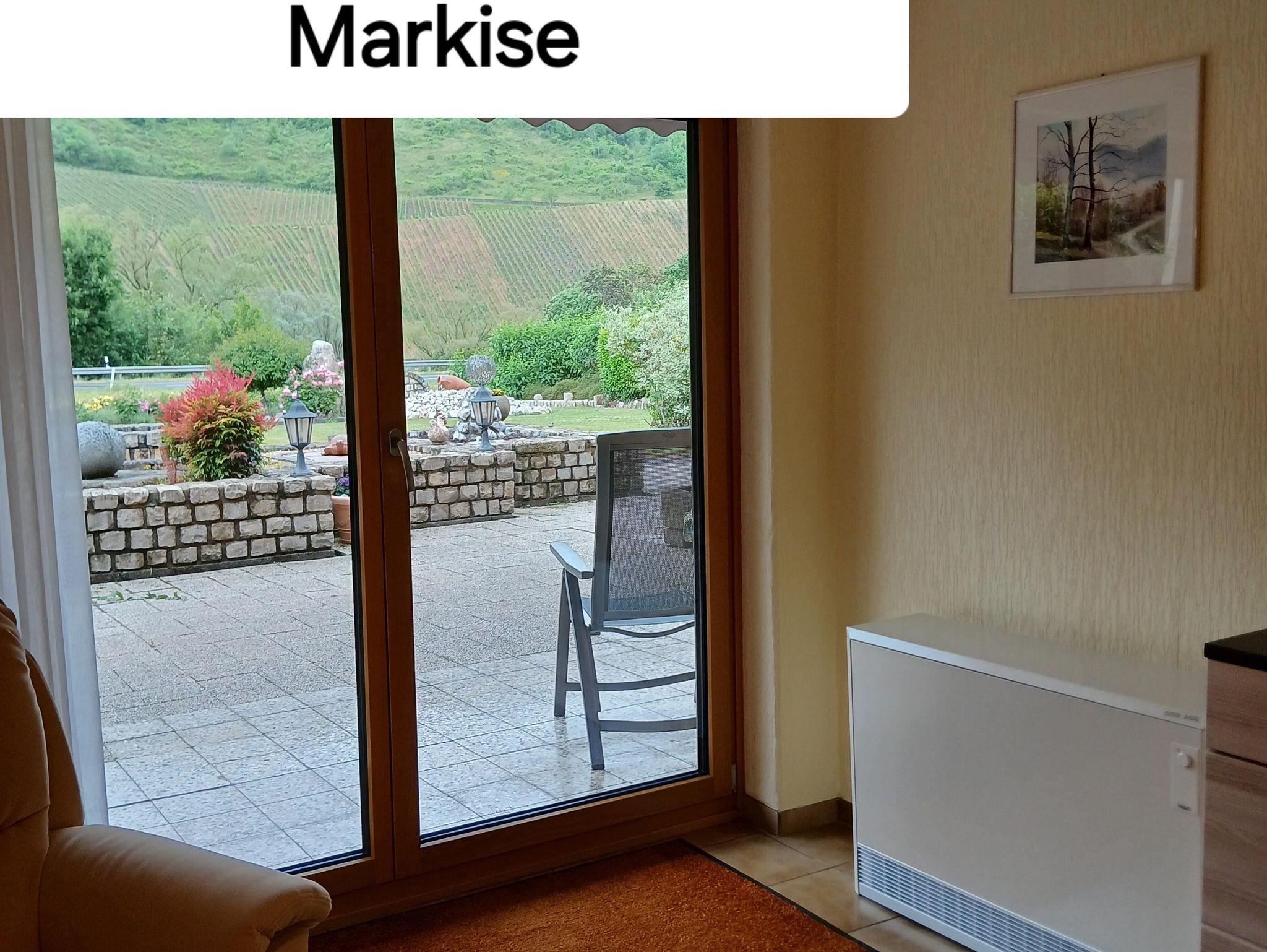 Ferienwohnung im Souterrain für 2 Personen. Eigener Eingang. Ruhige Lage, sehr schöne Parkanlage, große Freisitzfläche mit überdachter Sitzecke, elektrische Markise 7m x 2,50, Liegewiese, Grillplatz. Blick ins Moseltal und zum Startplatz für Paraglider, Parkplätze, Fahrradgarage.