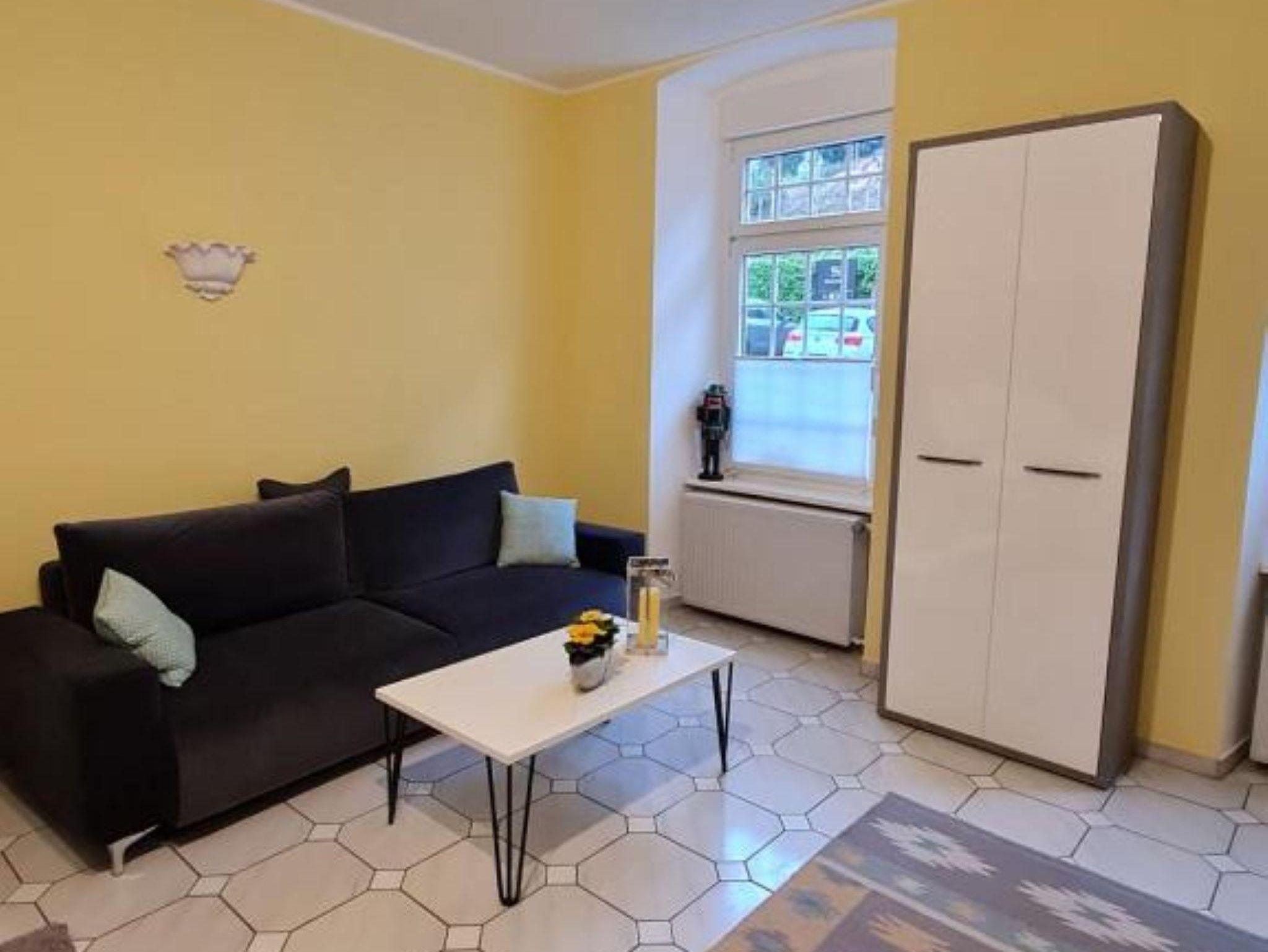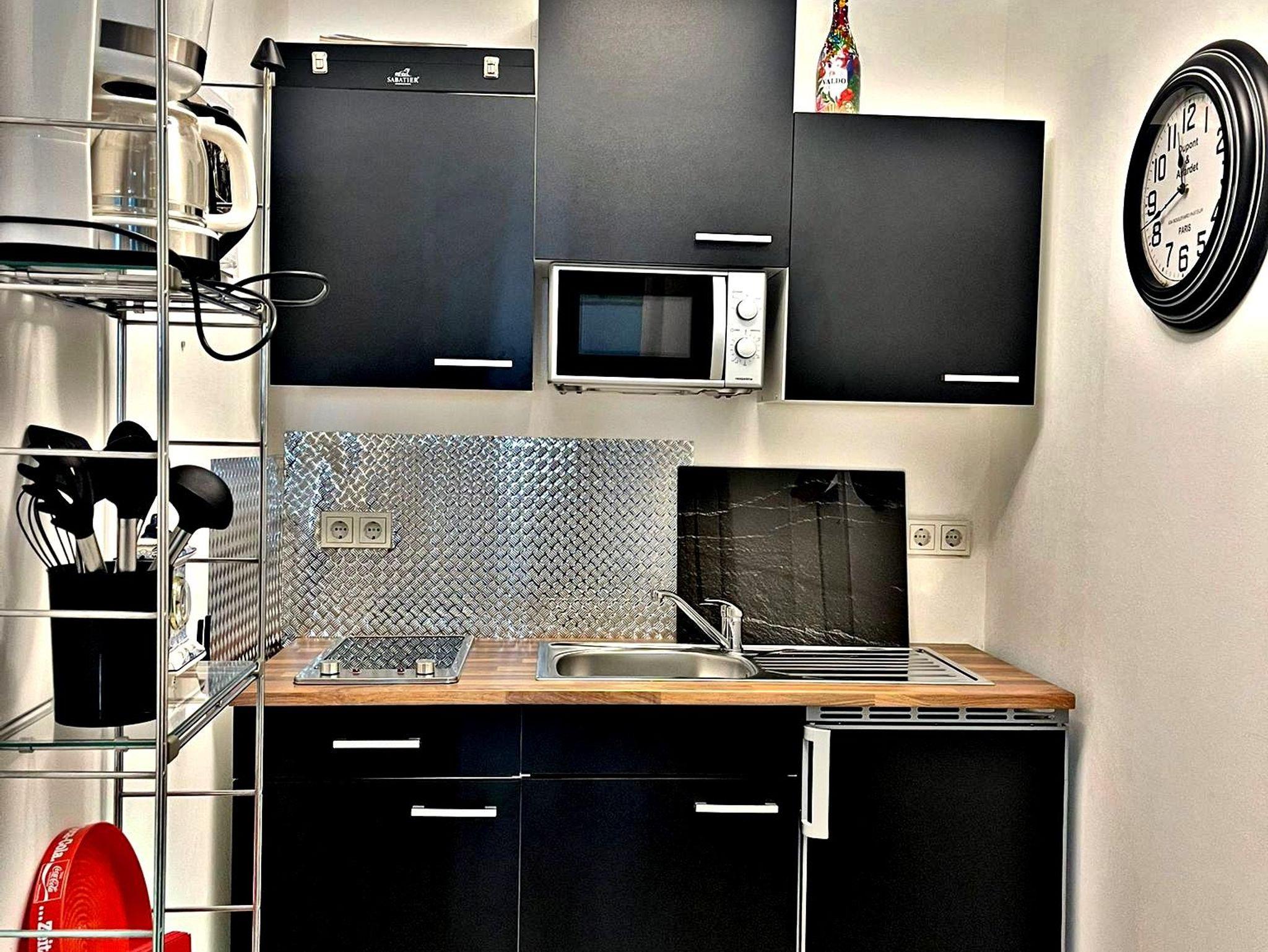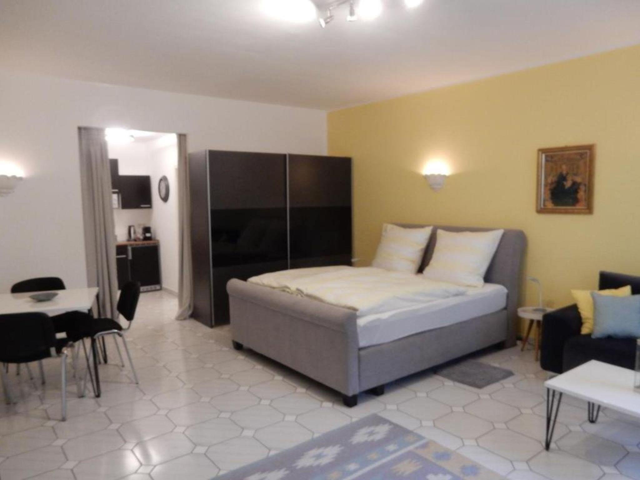 Das Apartment liegt im Parterre und verfügt über einen kombinierten Wohn-/Schlafraum mit Essecke und einem Flachbild-Sat-TV.