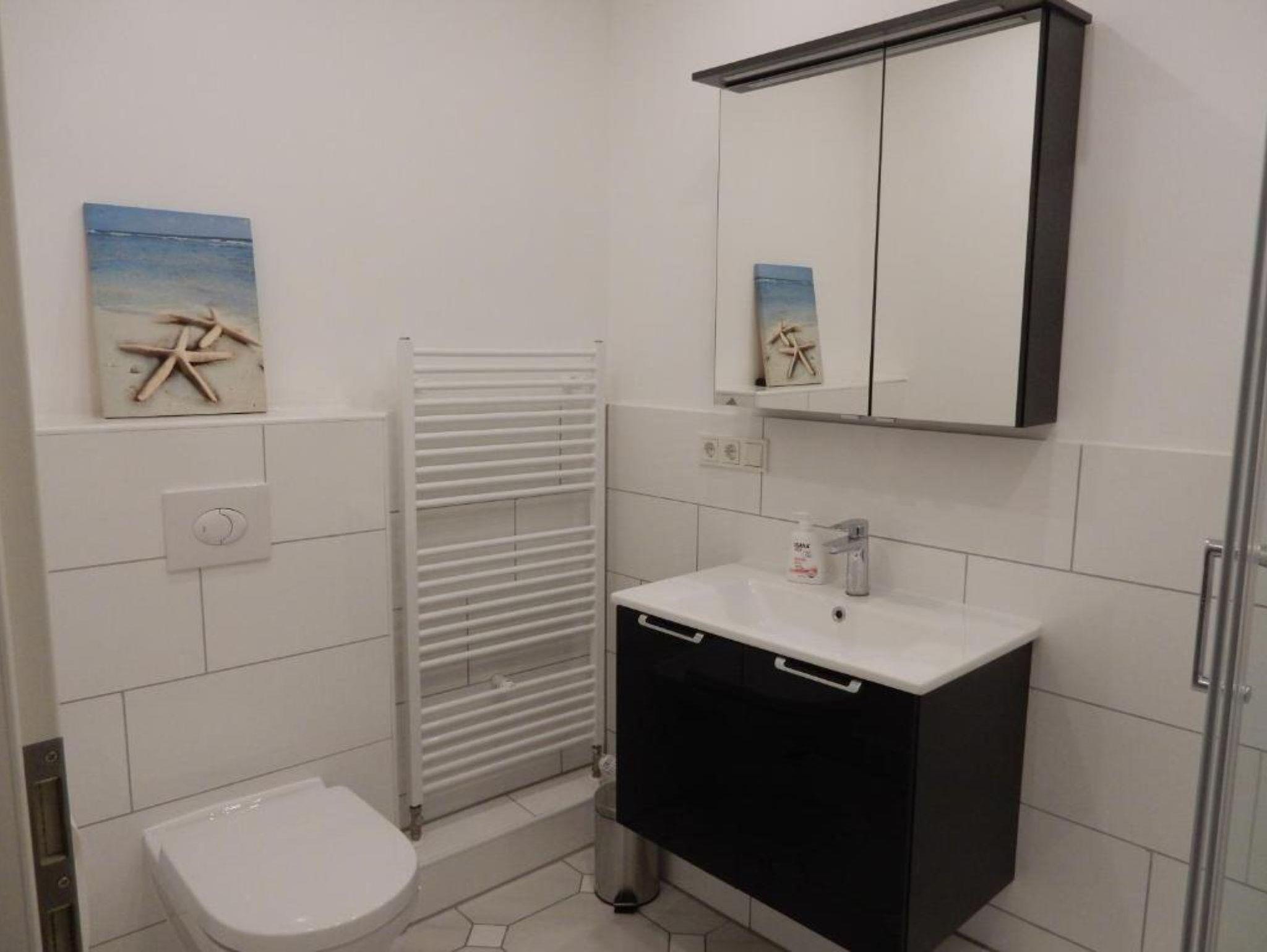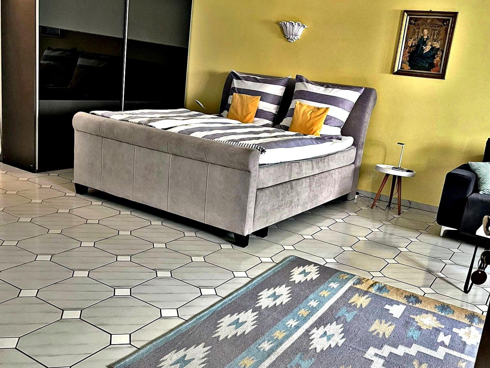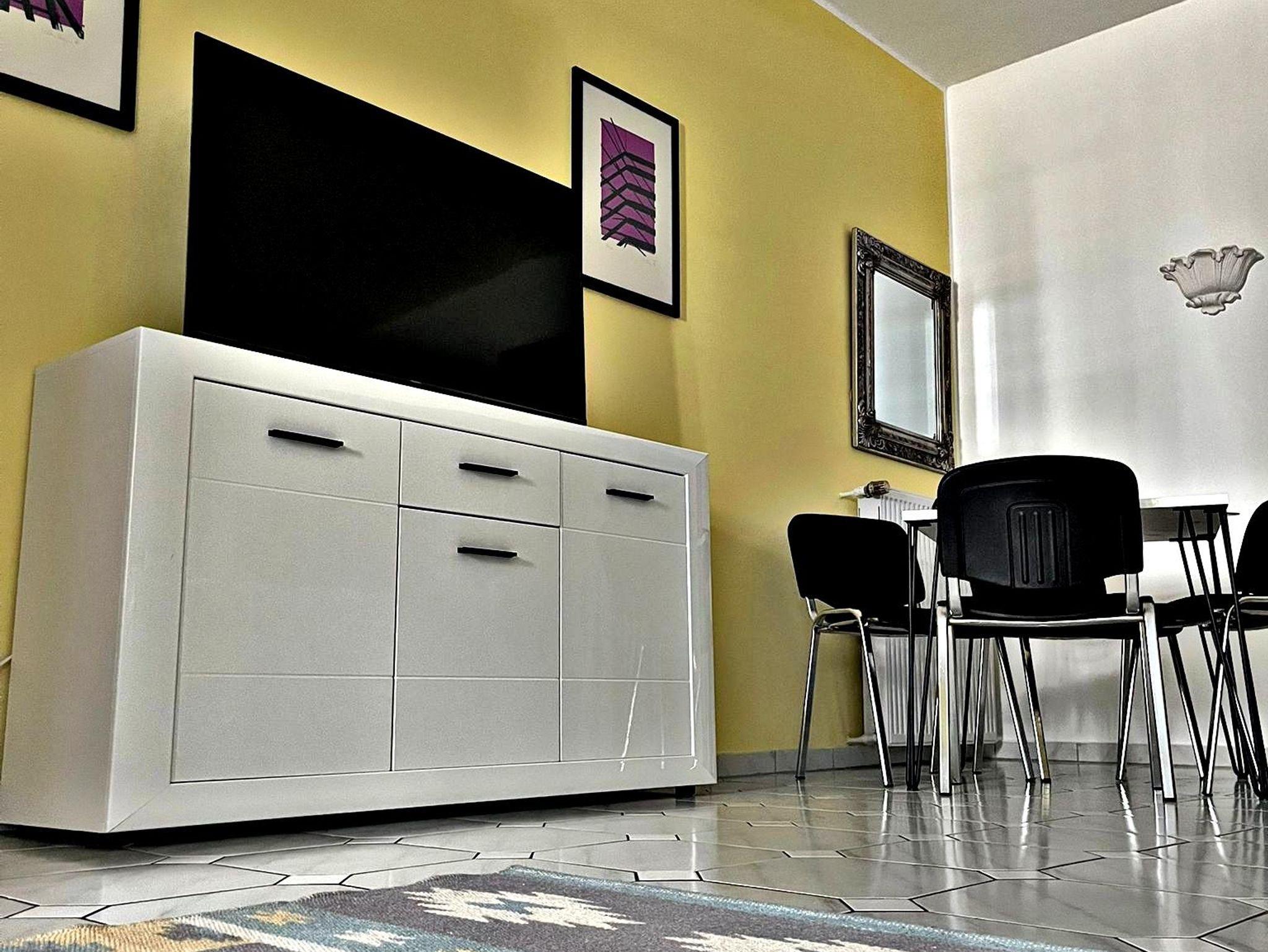 Das Apartment liegt im Parterre und verfügt über einen kombinierten Wohn-/Schlafraum mit Essecke und einem Flachbild-Sat-TV.