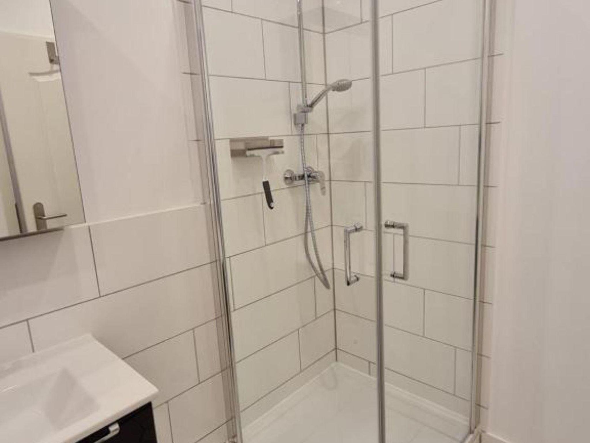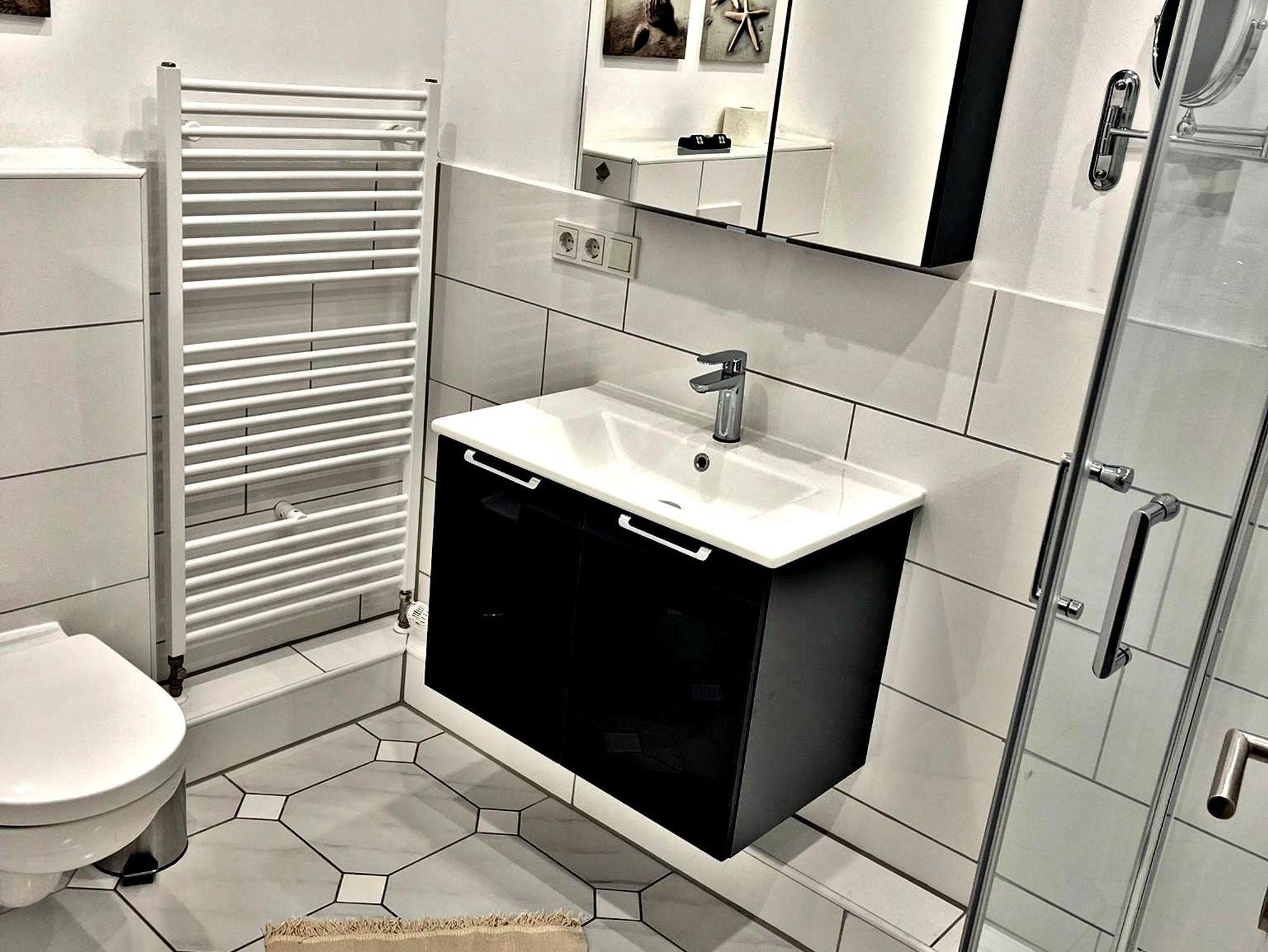 Eine kleine Küchenzeile mit Mikrowelle sowie ein Bad mit Dusche. Handtücher und Bettwäsche werden gestellt.