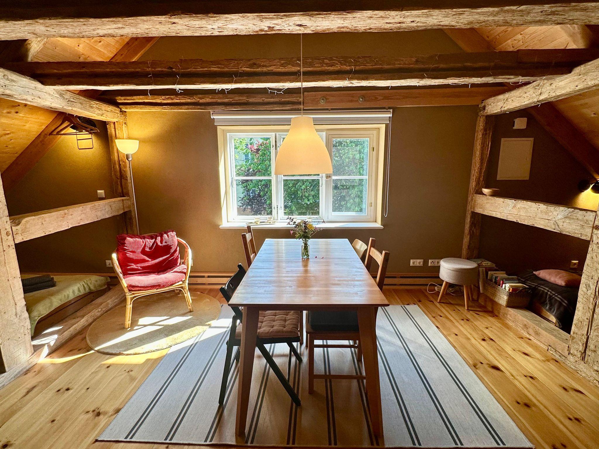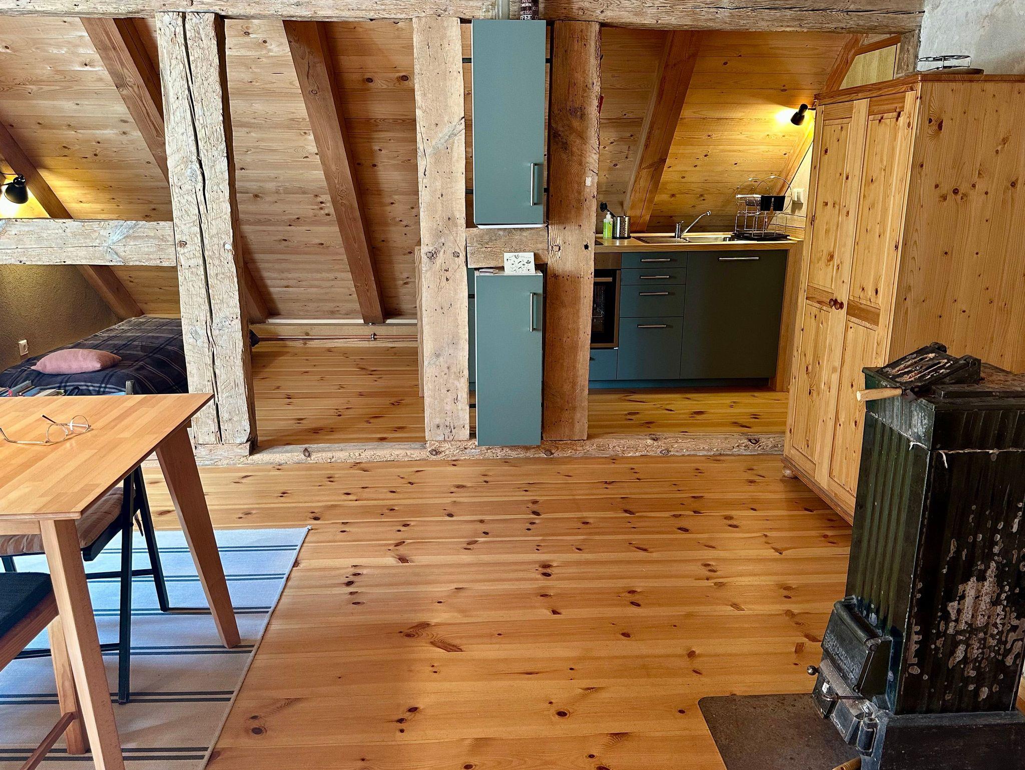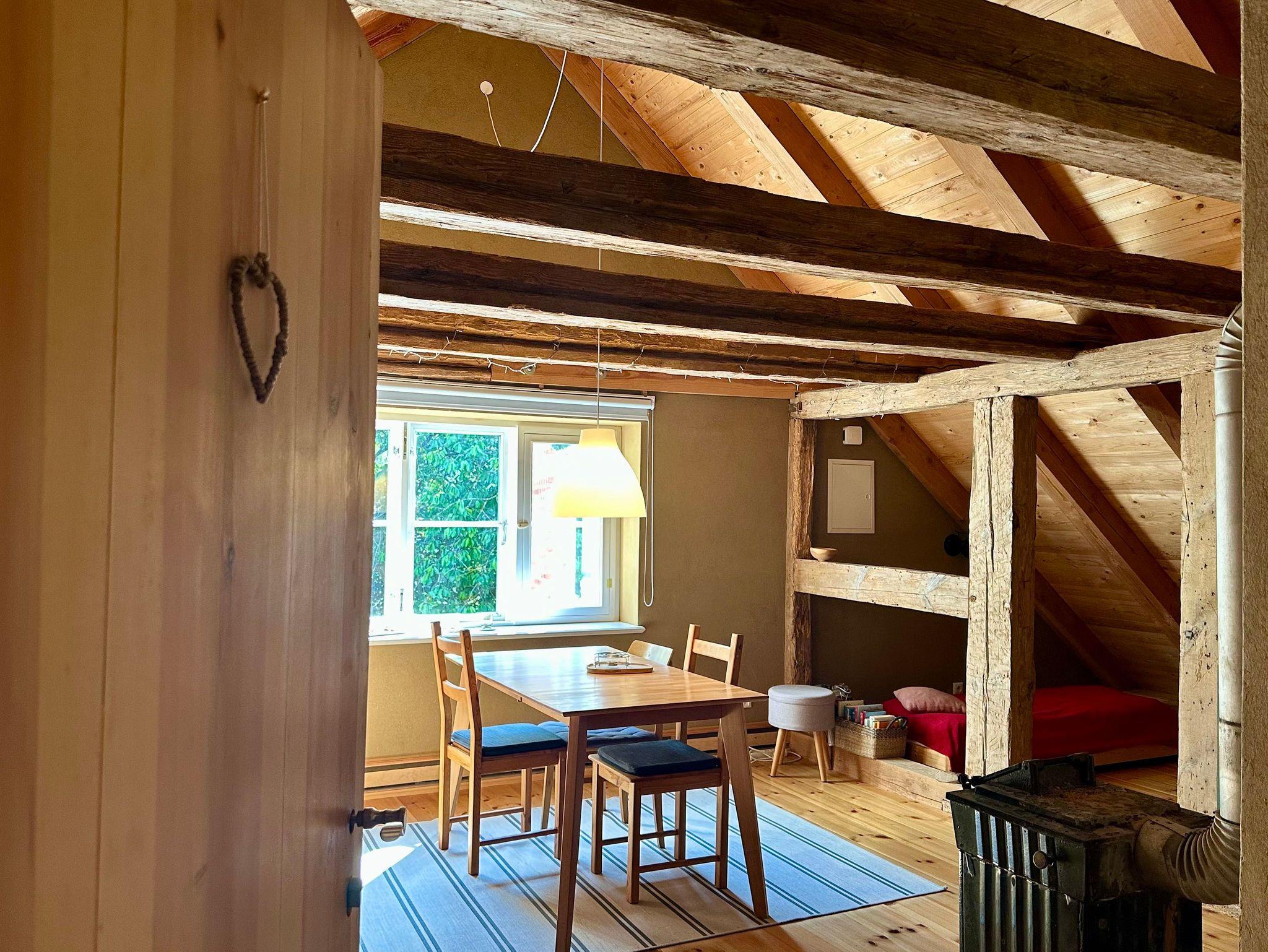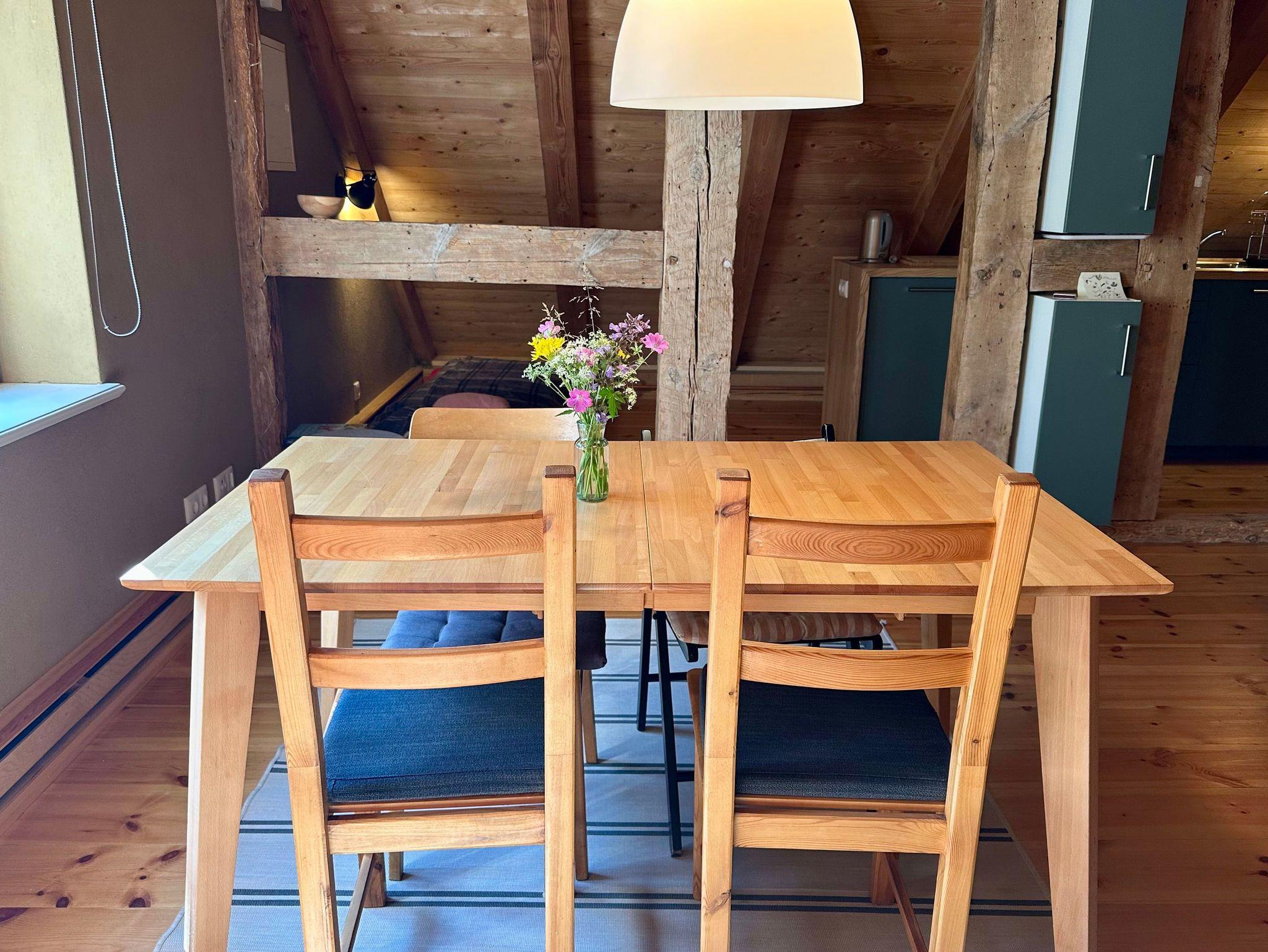 Die charmante Dachgeschosswohnung erreichen Sie über eine rustikale Holztreppe. Die Wohnung wurde im Fachwerkstil mit viel Holz und nachhaltigen Materialien liebevoll saniert, wodurch eine gemütliche und einladende Atmosphäre entsteht.