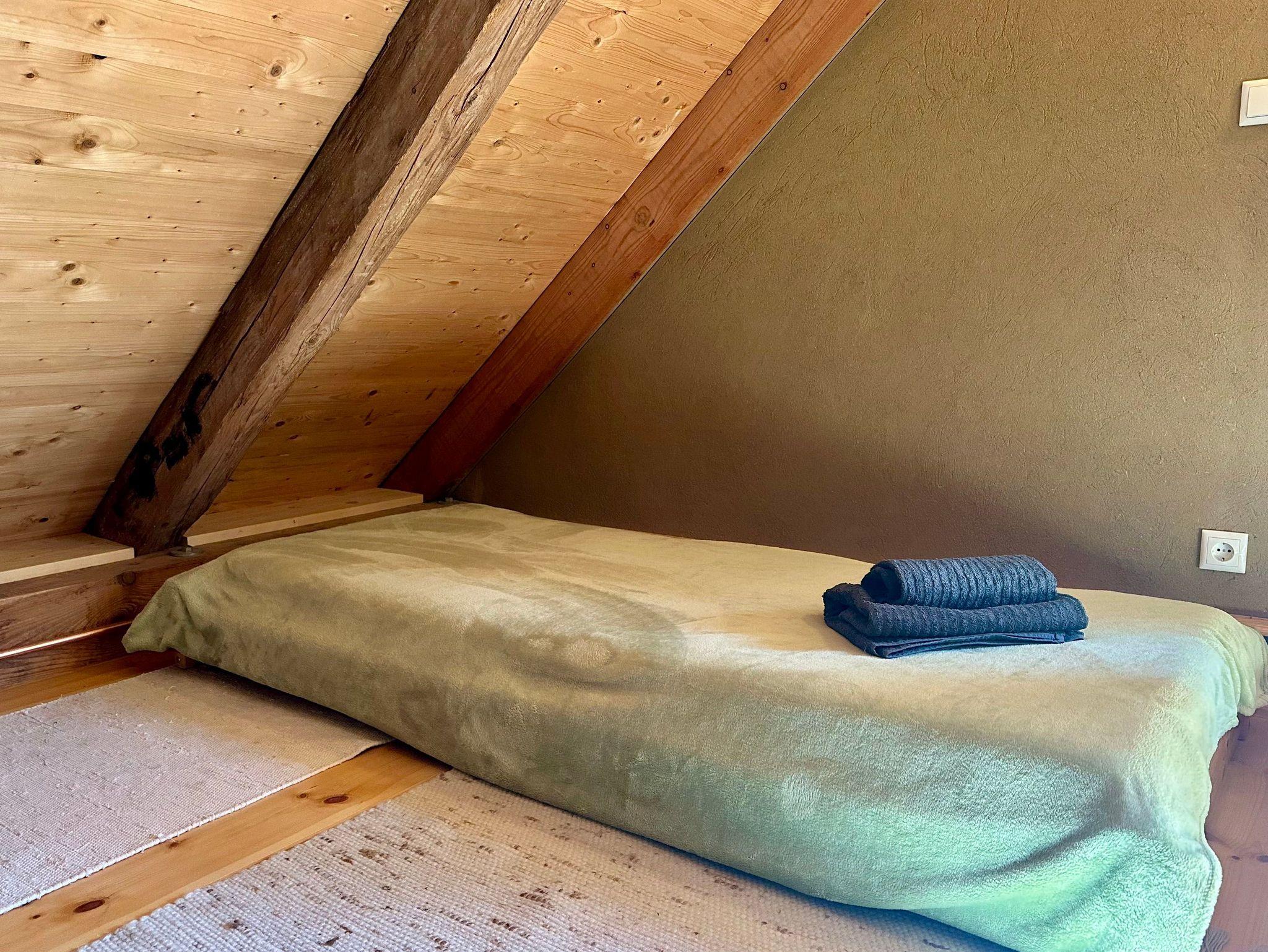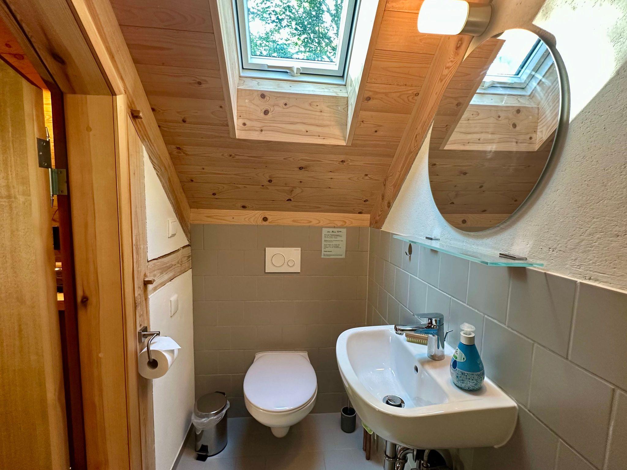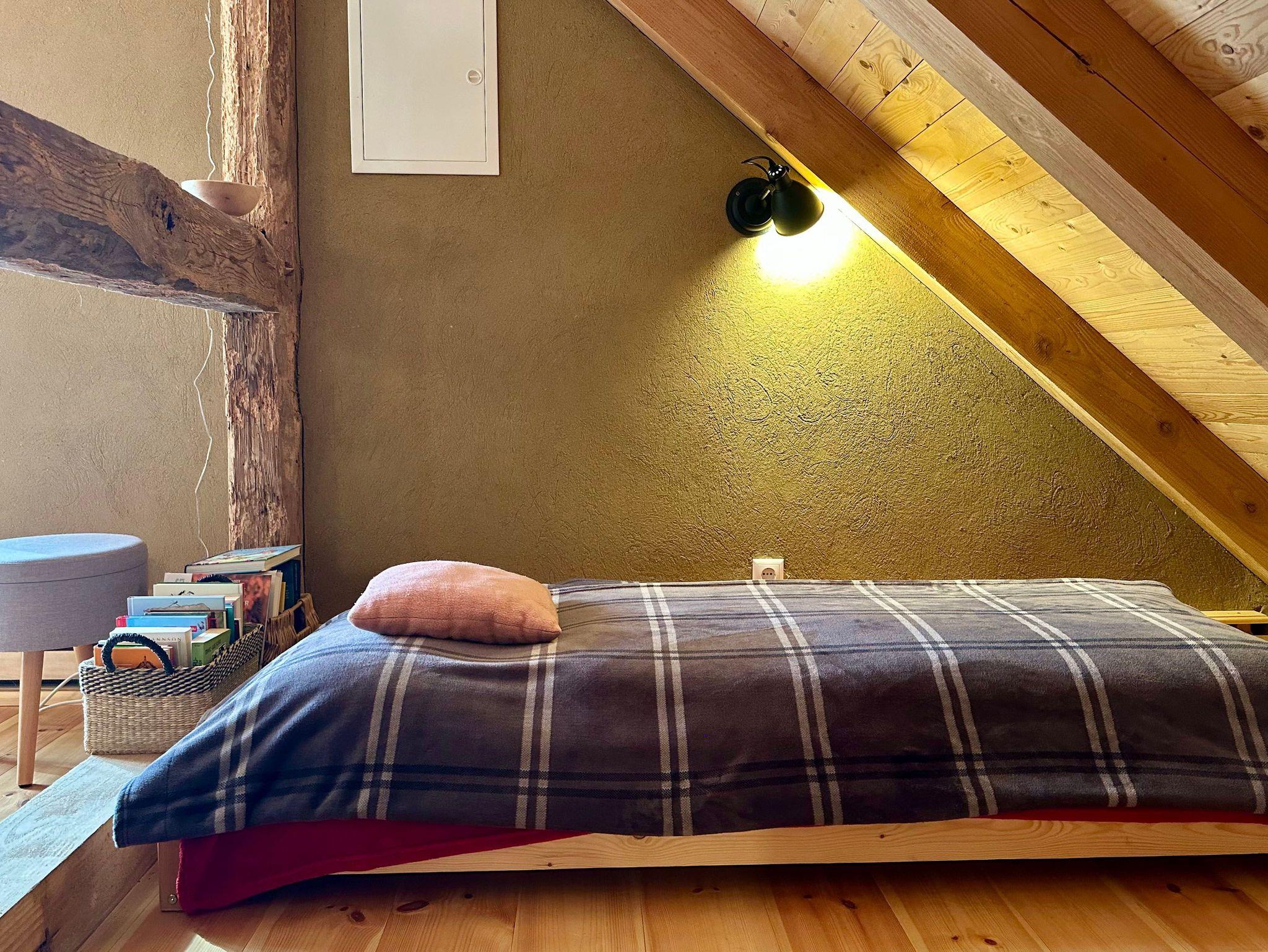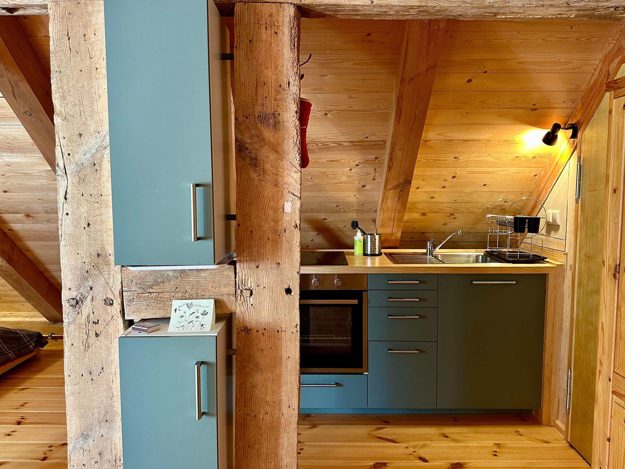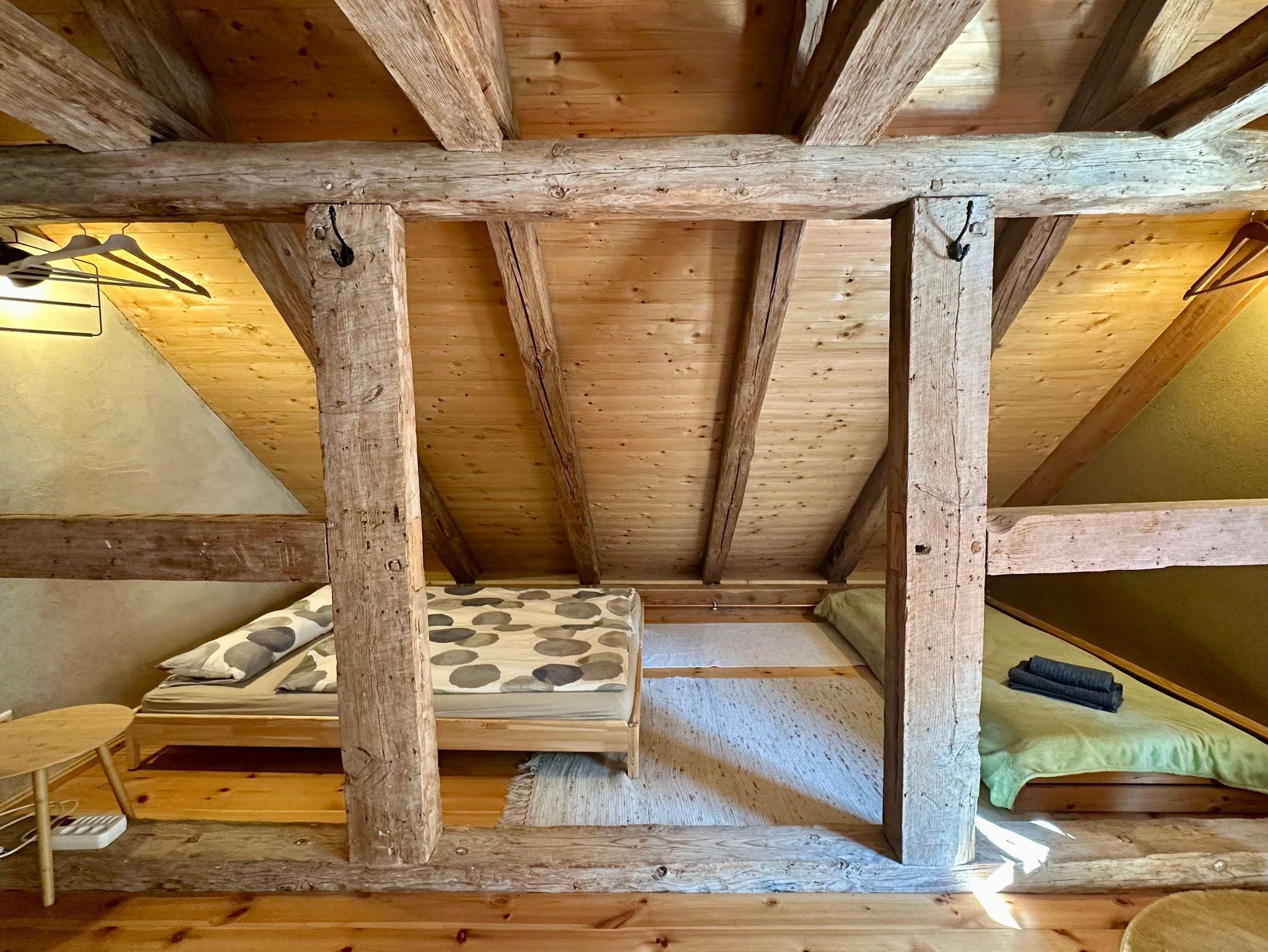 Die charmante Dachgeschosswohnung erreichen Sie über eine rustikale Holztreppe. Die Wohnung wurde im Fachwerkstil mit viel Holz und nachhaltigen Materialien liebevoll saniert, wodurch eine gemütliche und einladende Atmosphäre entsteht.