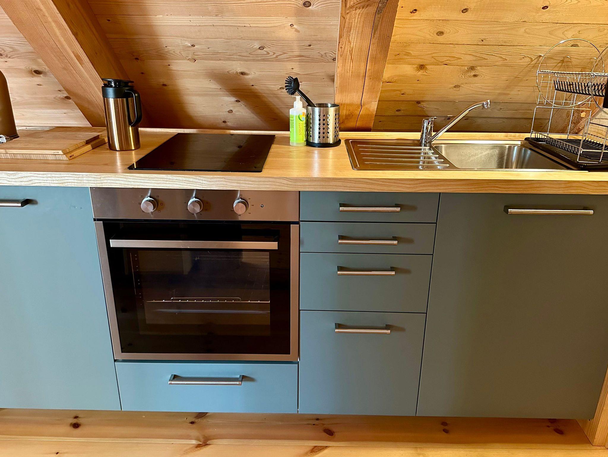 Die 38 qm große Ferienwohnung ist kompakt, aber clever gestaltet und bietet ausreichend Platz für bis zu vier Personen. Die Schlafbereiche bestehen aus vier Stapelbetten, ideal für Familien oder kleine Gruppen. Das Badezimmer ist funktional eingerichtet und verfügt über eine Dusche.