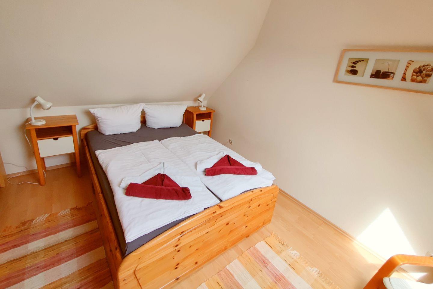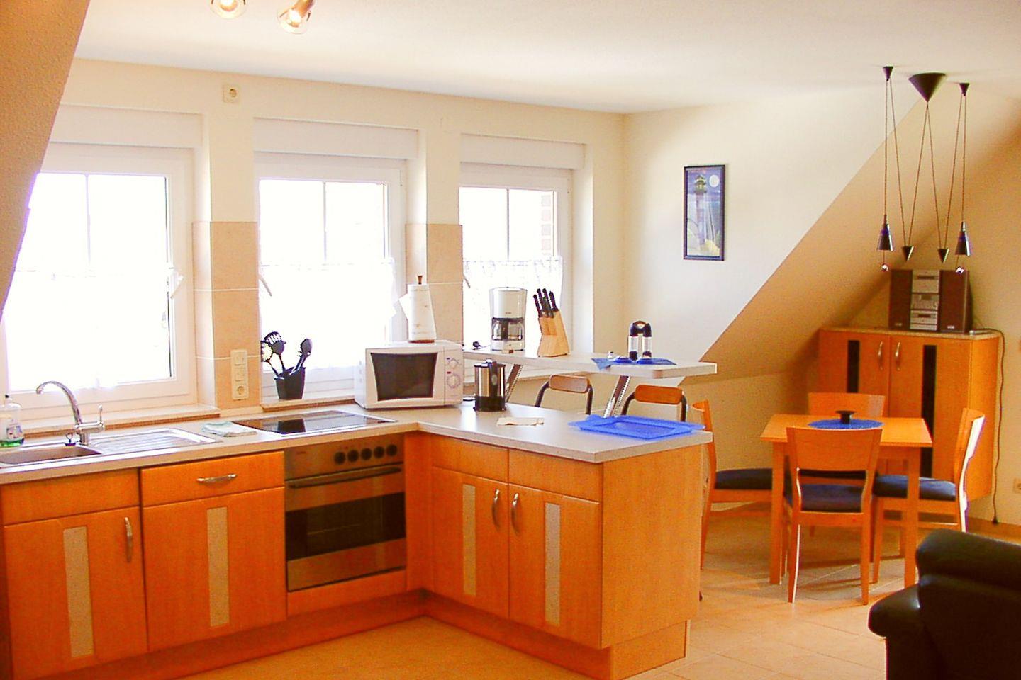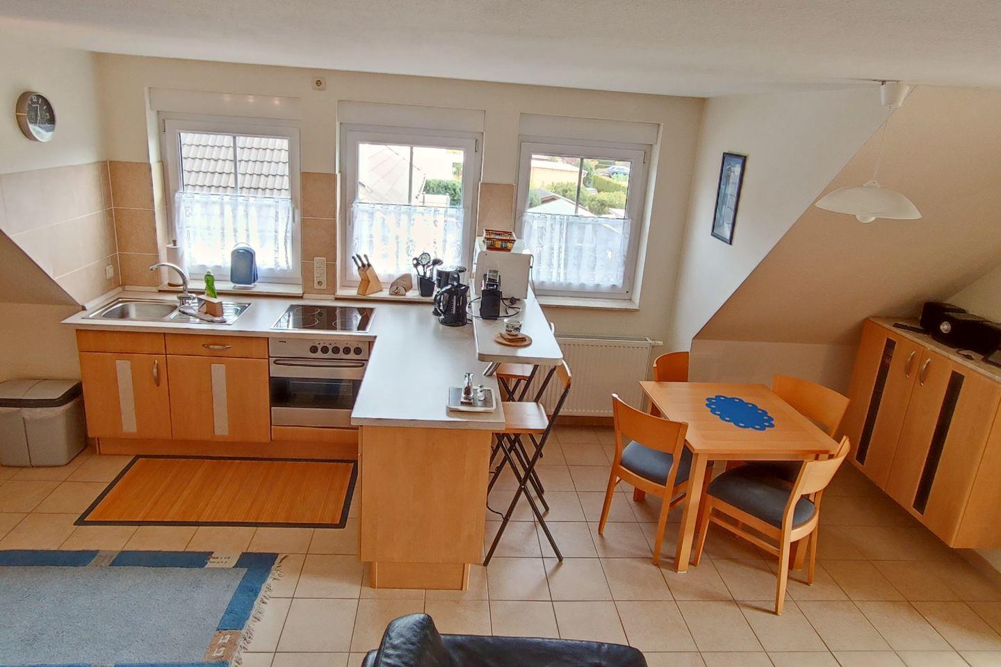 Die Wohnung verfügt über ein helles und einladendes Schlafzimmer, das mit hochwertigen Möbeln ausgestattet ist und Ihnen einen ruhigen Schlaf garantiert. Ein zusätzliches Schlafsofa in der gemütlichen Sofaecke im Wohnzimmer bietet eine komfortable Schlafgelegenheit für eine weitere Person. Das offene Wohnkonzept verbindet das Wohnzimmer mit der modern eingerichteten Küche, die keine Wünsche offenlässt. Sie finden hier einen Ceranherd, einen Elektrobackofen, eine Spülmaschine und eine Mikrowelle, die das Kochen zu einem Genuss machen. Ein Esstisch lädt Sie zum gemeinsamen Schlemmen ein und ermöglicht Ihnen, sich nach einem Tag voller Erlebnisse zu entspannen.