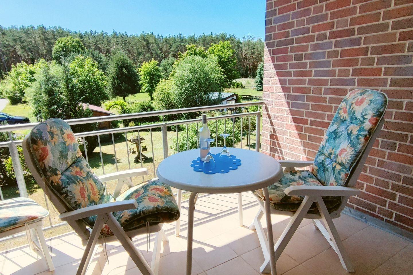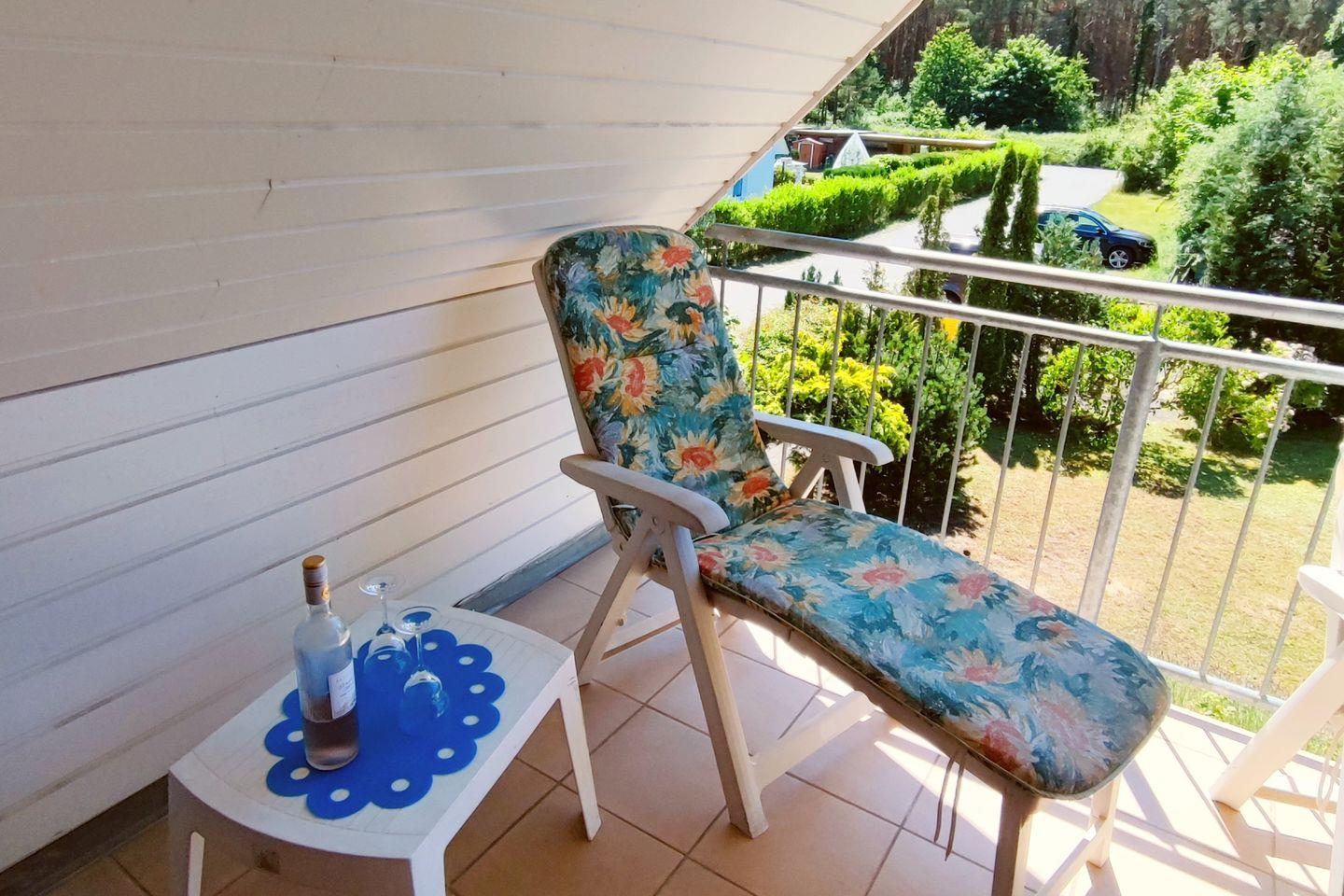 Ein Highlight der Wohnung ist der überdachte Balkon, der mit Gartenmöbeln ausgestattet ist und einen wunderschönen Blick auf die umliegende Natur bietet. Hier können Sie die frische Ostseeluft genießen und den Sonnenuntergang in vollen Zügen auskosten. Die äußerst angenehme Fußbodenheizung sorgt dafür, dass Sie auch an kühleren Tagen ein behagliches Gefühl erleben.