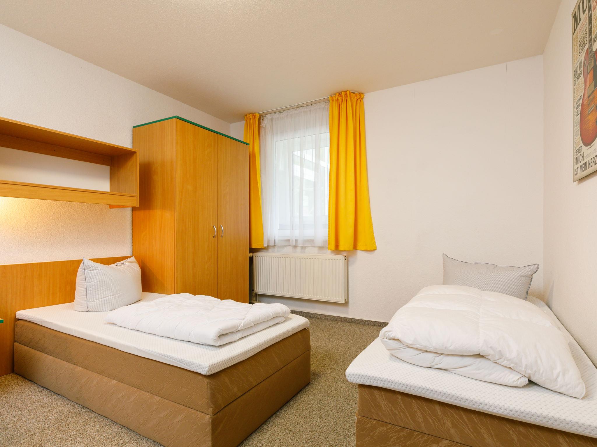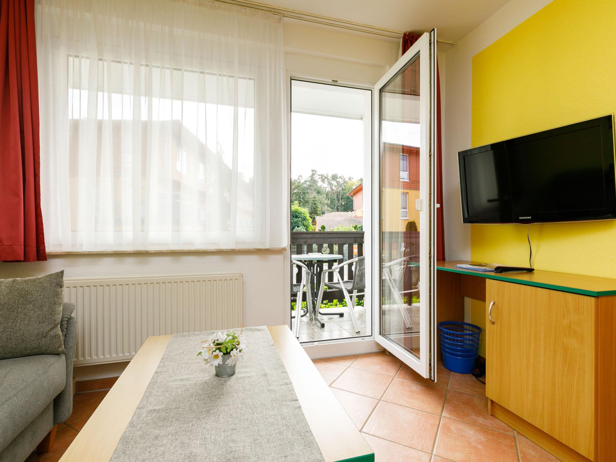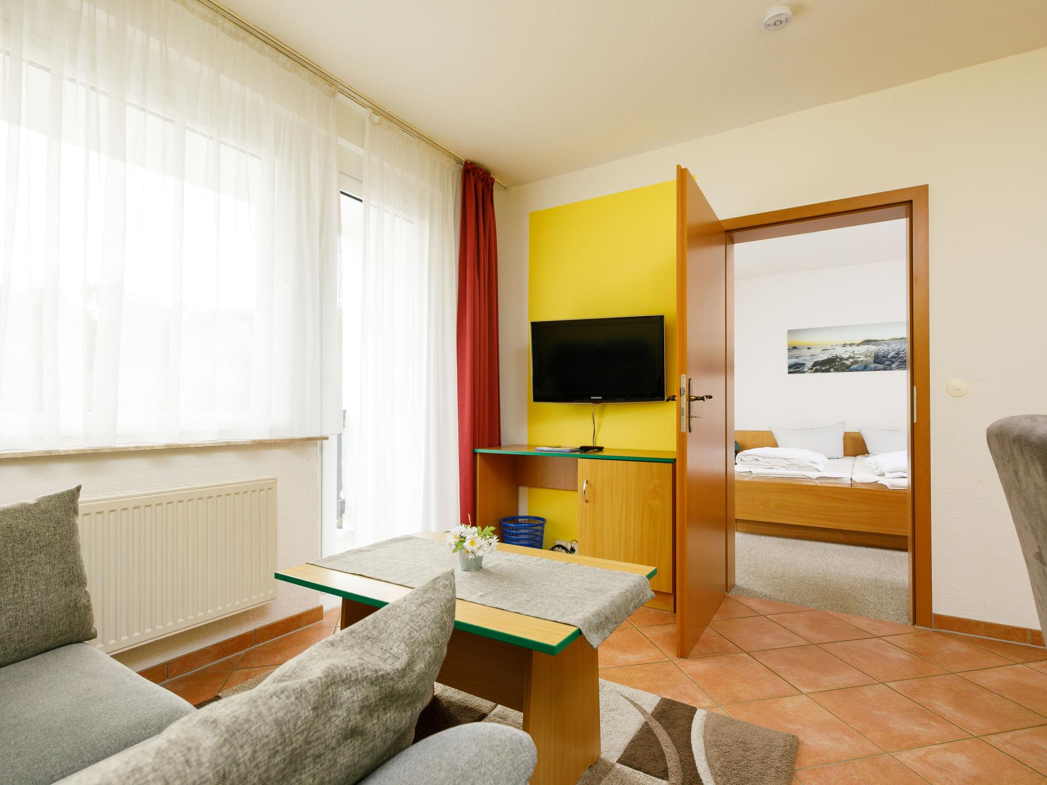 "Dünenhaus App. 104", 3-room apartment 65 m2, on the upper ground floor. Cosy furnishings: living room with dining nook and cable TV (flat screen), radio. Exit to the terrace. 1 room with 1 double bed. 1 room with 3 beds. Kitchen (4 hot plates, toaster, kettle, microwave, electric coffee machine) with dining table. Shower/WC. Terrace. Terrace furniture. Facilities: children's high chair, baby cot. Internet (WiFi, free). Parking (1 car). Please note: non-smokers only. Maximum 1 small pet/ dog allowed. Smoke alarm.