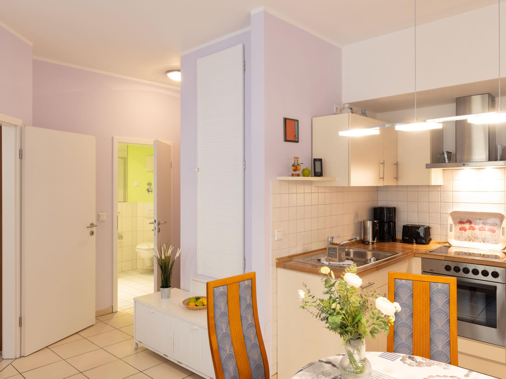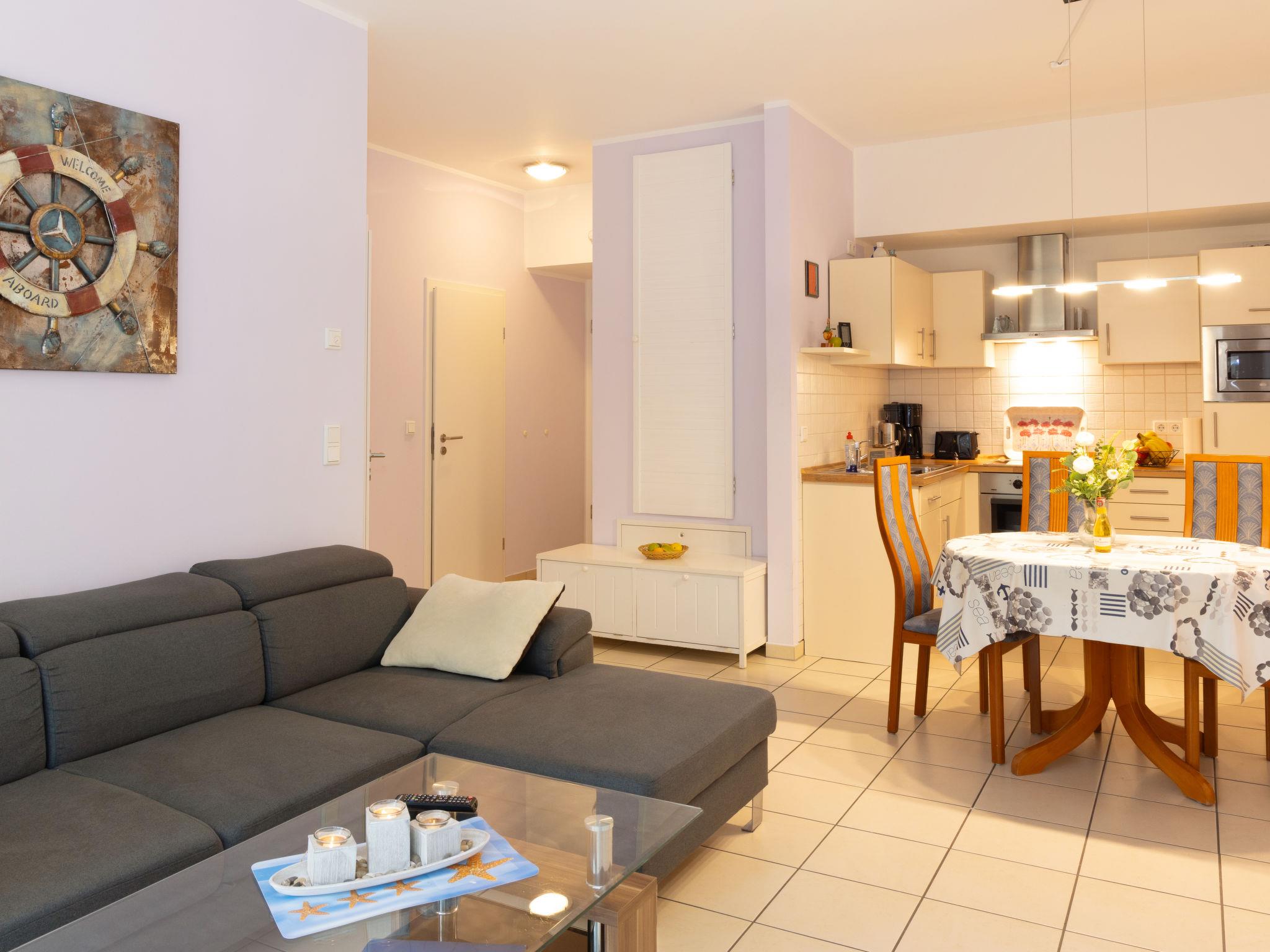 "Südwind App. 9", 2-room apartment 55 m2 on 1st floor. Modern and cosy furnishings: living/dining room with 1 double sofabed and cable TV (flat screen), radio. Exit to the balcony. 1 room with 1 double bed. Kitchenette (oven, dishwasher, toaster, kettle, microwave, electric coffee machine). Bath/WC. Balcony. Balcony furniture. Facilities: children's high chair, baby cot. Internet (WiFi, free). Parking (1 car) at the house. Please note: non-smokers only. Maximum 1 pet/ dog allowed. Smoke alarm.
