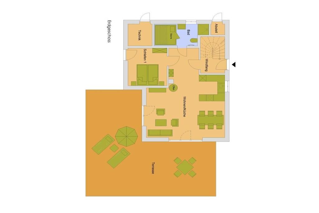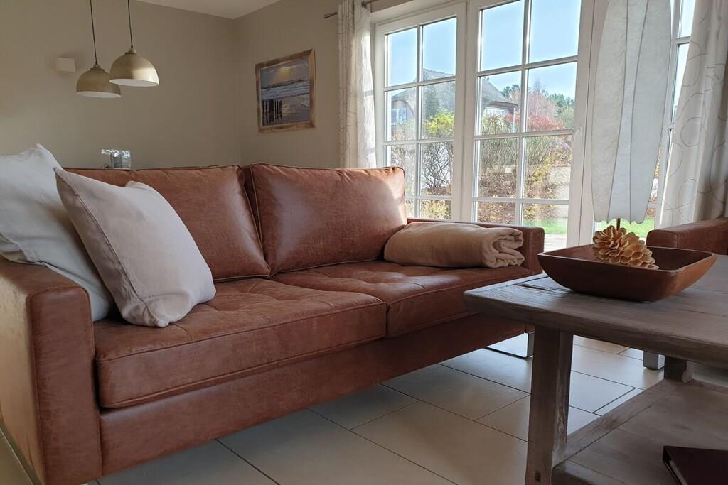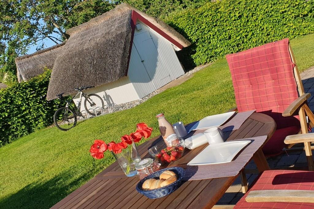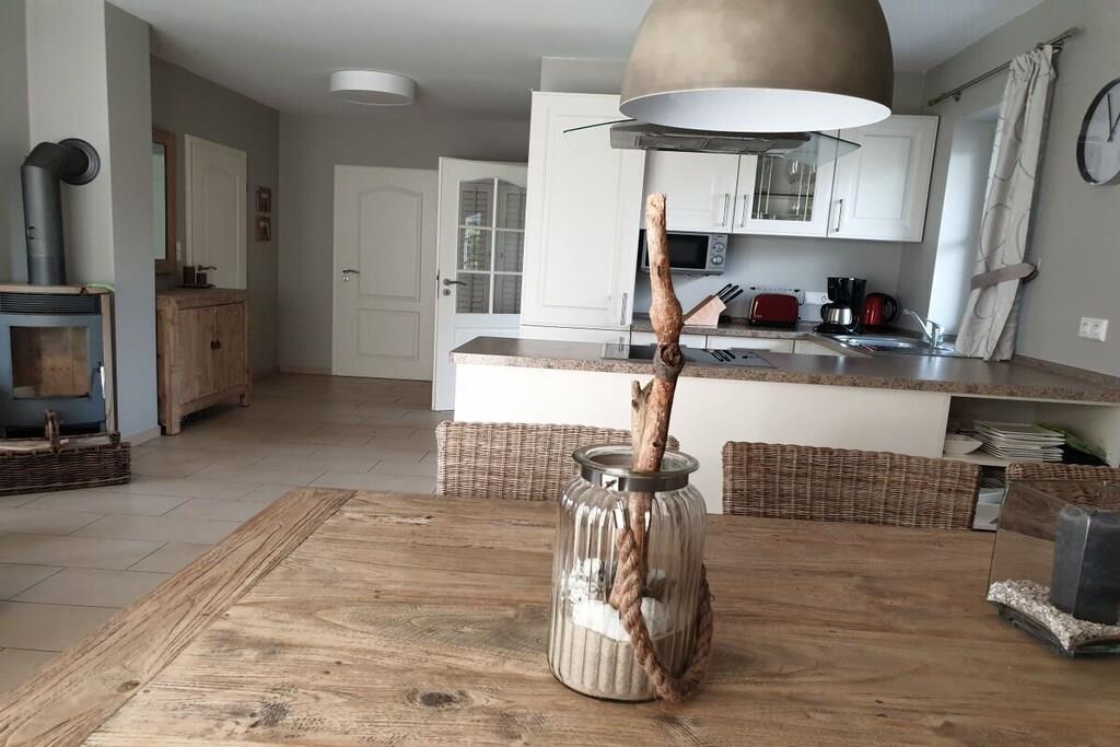 Du bor i en lejlighed på 115 m² med plads til op til 6 personer. Den rummelige opholdsstue med åbent køkken og spiseplads i stueetagen (lædersofa, LED-TV, stereoanlæg, CD-afspiller, brændeovn, køkken med opvaskemaskine, mikrobølgeovn, keramisk kogeplade, emhætte og meget mere) er meget komfortabelt møbleret og byder dig velkommen med en hyggelig atmosfære. Nyd vores rummelige, sydvendte solterrasse fra morgenmad til aftensmad. En strandstol og havemøbler inviterer dig til at solbade. To cykler, en elektrisk grill og brænde er til rådighed i det stråtækte haveskur.