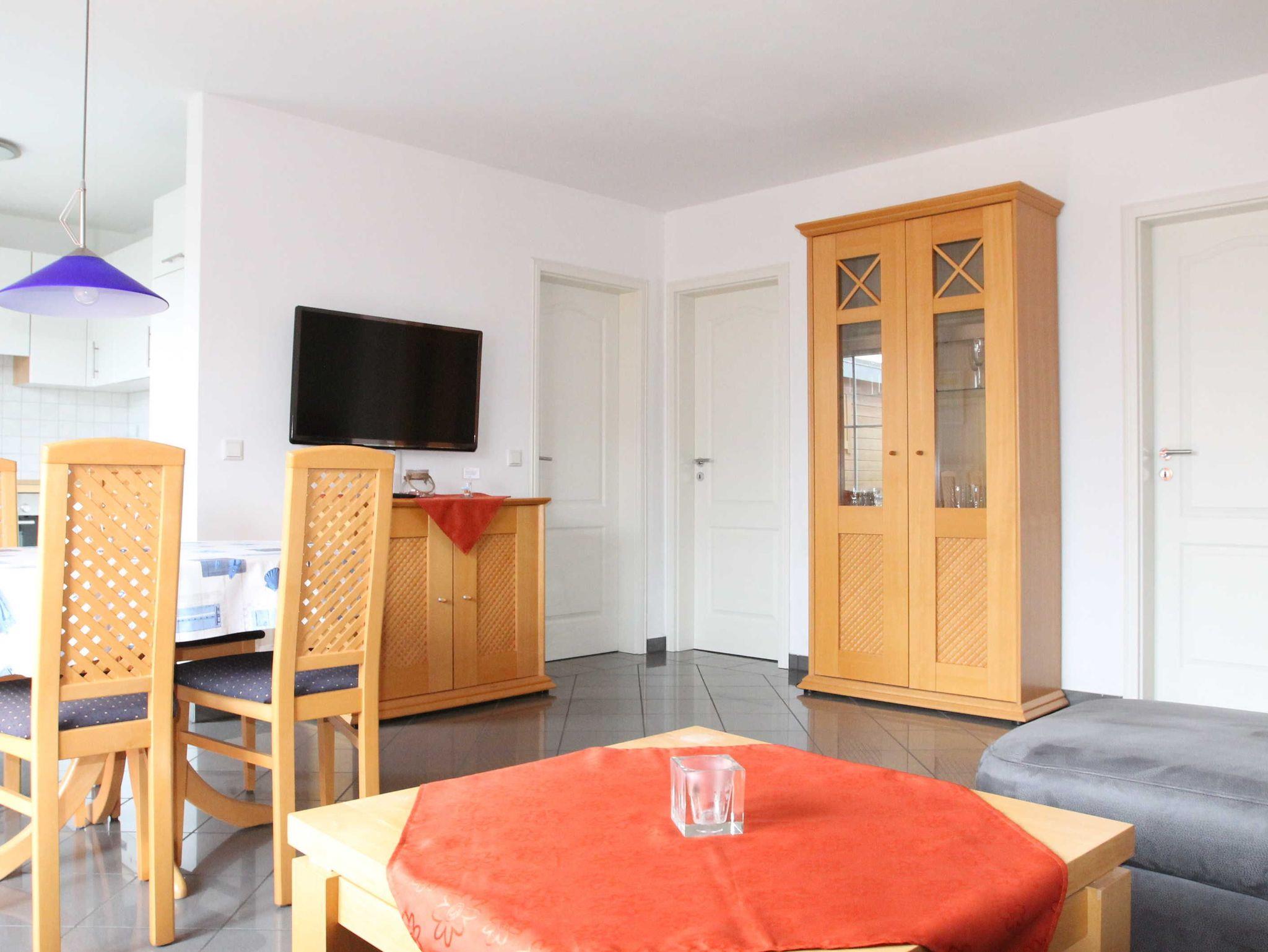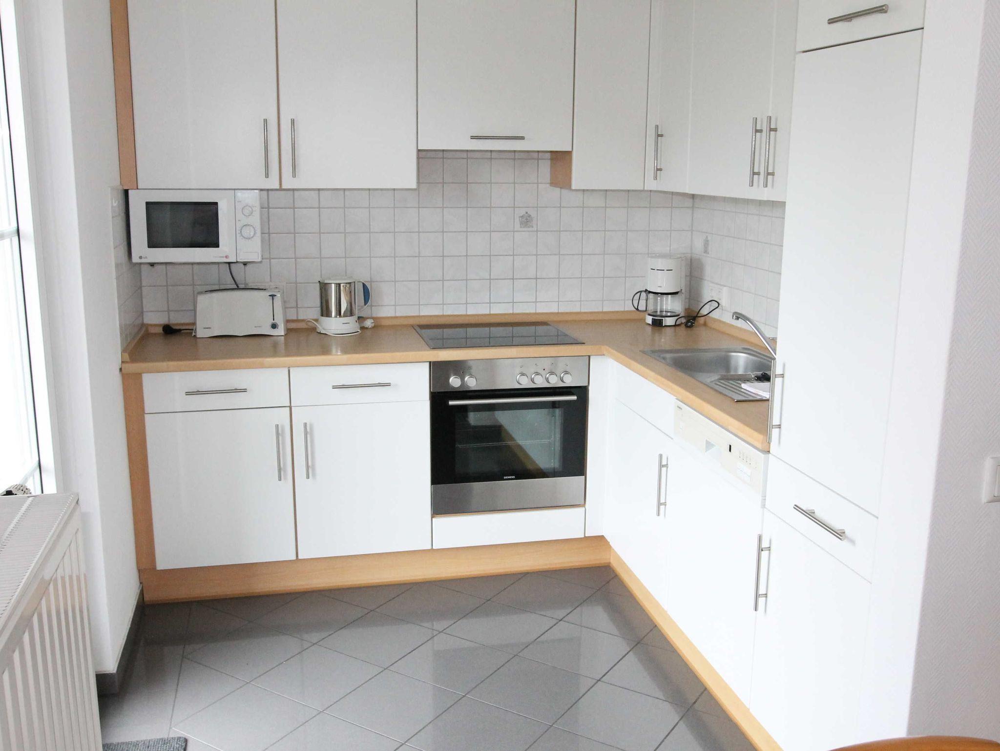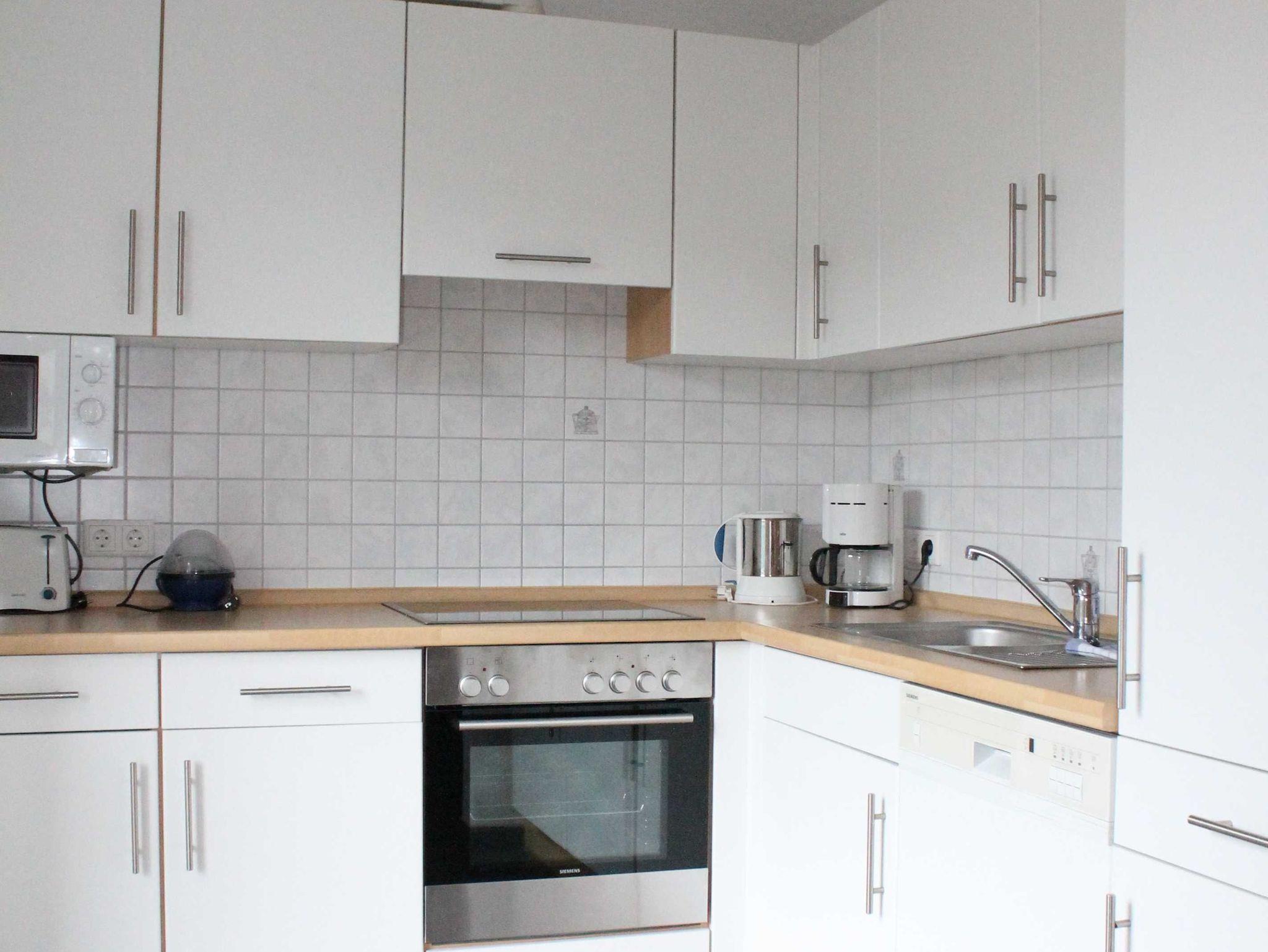 Sie wohnen in einer 65 qm großen 3-Raum-Komfortwohnung für 4 Personen. Der helle Wohnbereich hat eine komfortable Wohnlandschaft mit Essbereich. Die angrenzende Einbauküche ist ausgestattet mit Cerankochfeld, Backofen, Spülmaschine, Mikrowelle, Kühlschrank mit Gefriermöglichkeit, Wasserkocher, Eierkocher, Toaster und Kaffeemaschine.