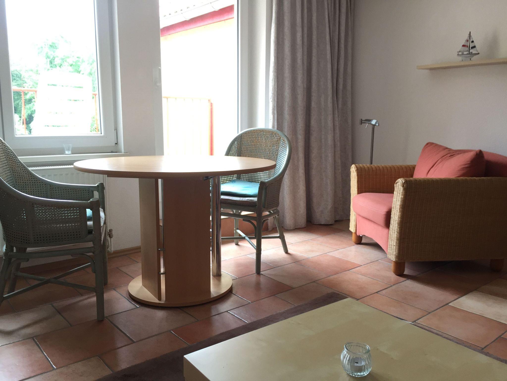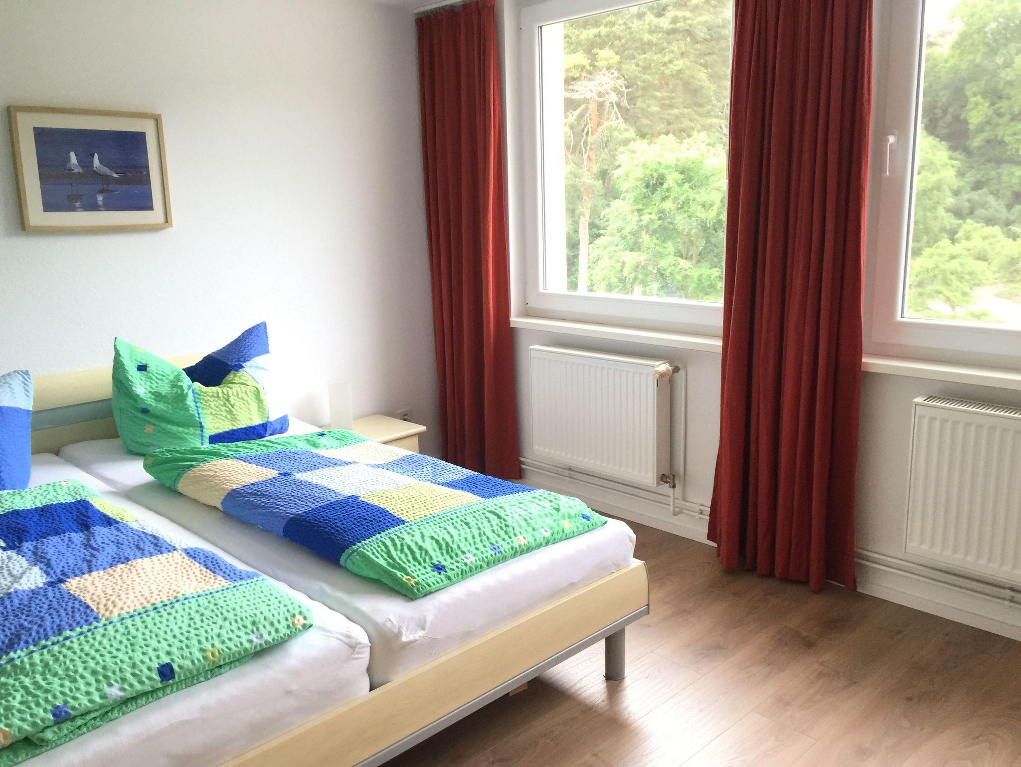 Die Wohnung Möve befindet sich in der 2. Etage in der Mitte. Sie hat einen Balkon mit einem wunderschönen Blick auf den Wald. Die Wohnung besteht aus einem Schlafzimmer, Wohnzimmer und einer Küche. Ausgestattet ist die Küche mit einem Herd mit Backofen Geschirrspüler, Kaffeemaschine, Wasserkocher und Toaster. Sowohl vom Schlafzimmer als auch vom Wohnzimmer haben Sie einen schönen Blick ins Grüne.