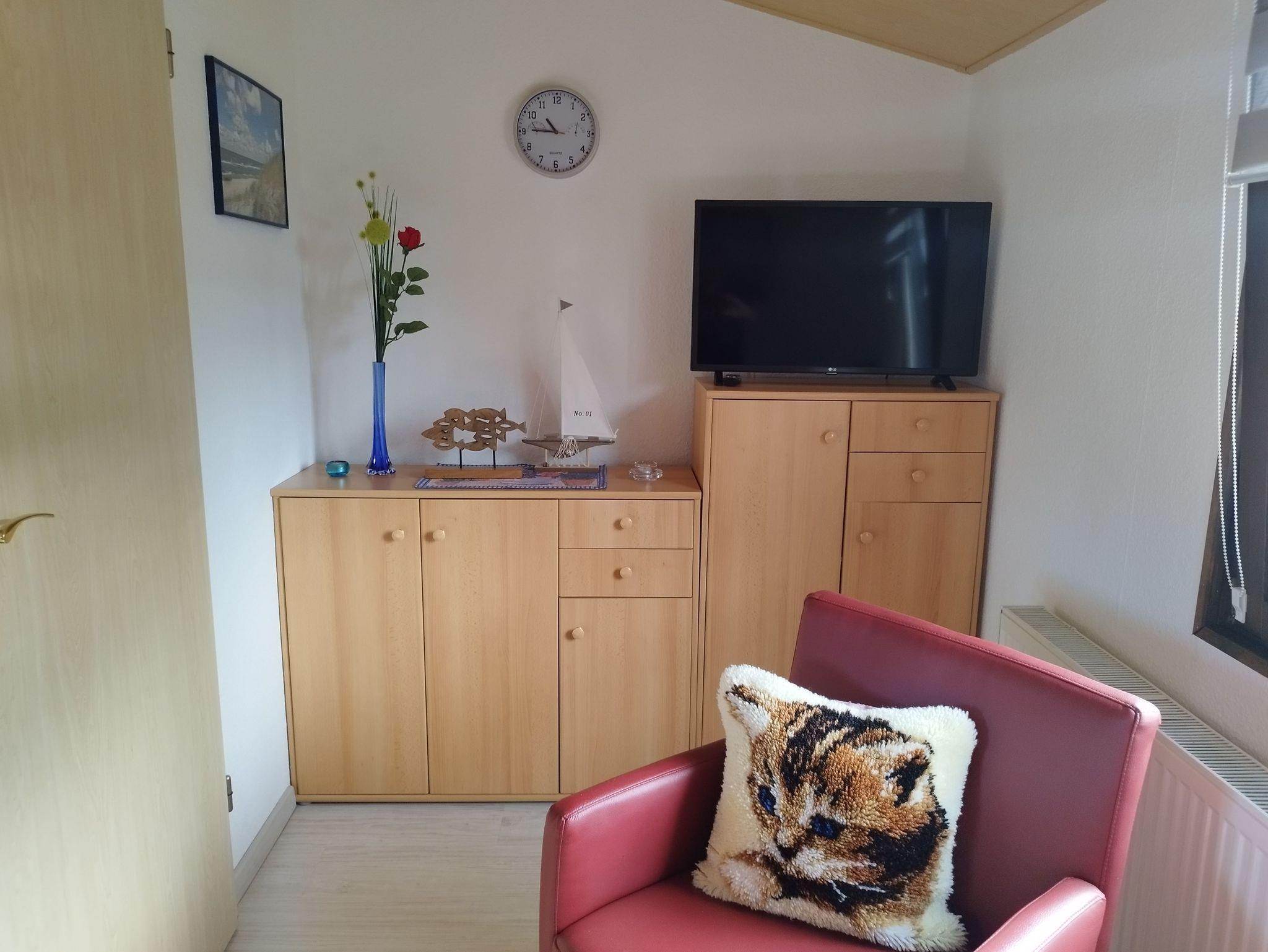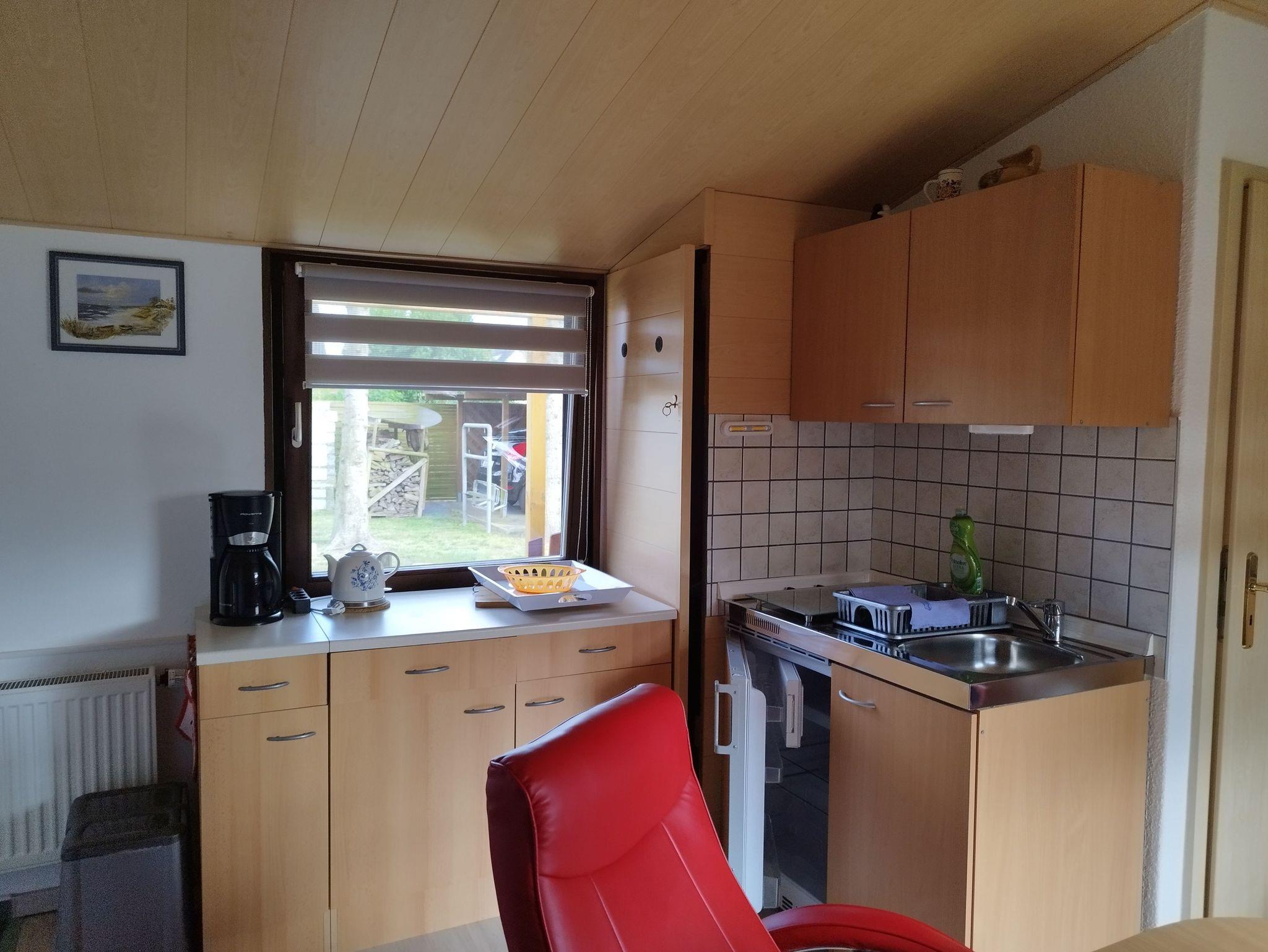 Im Ferienhaus befinden sich ein Wohnzimmer mit integrierter Pantry-Küche, zwei Schlafzimmer, eines mit Doppelbett und eines mit zwei alleinstehenden Betten, sowie ein kleines Bad mit Dusche/WC. Eine Terrasse mit Strandkorb, Sitzgelegenheiten und Grillmöglichkeit sowie das großzügige Gelände laden zum Verweilen ein.
