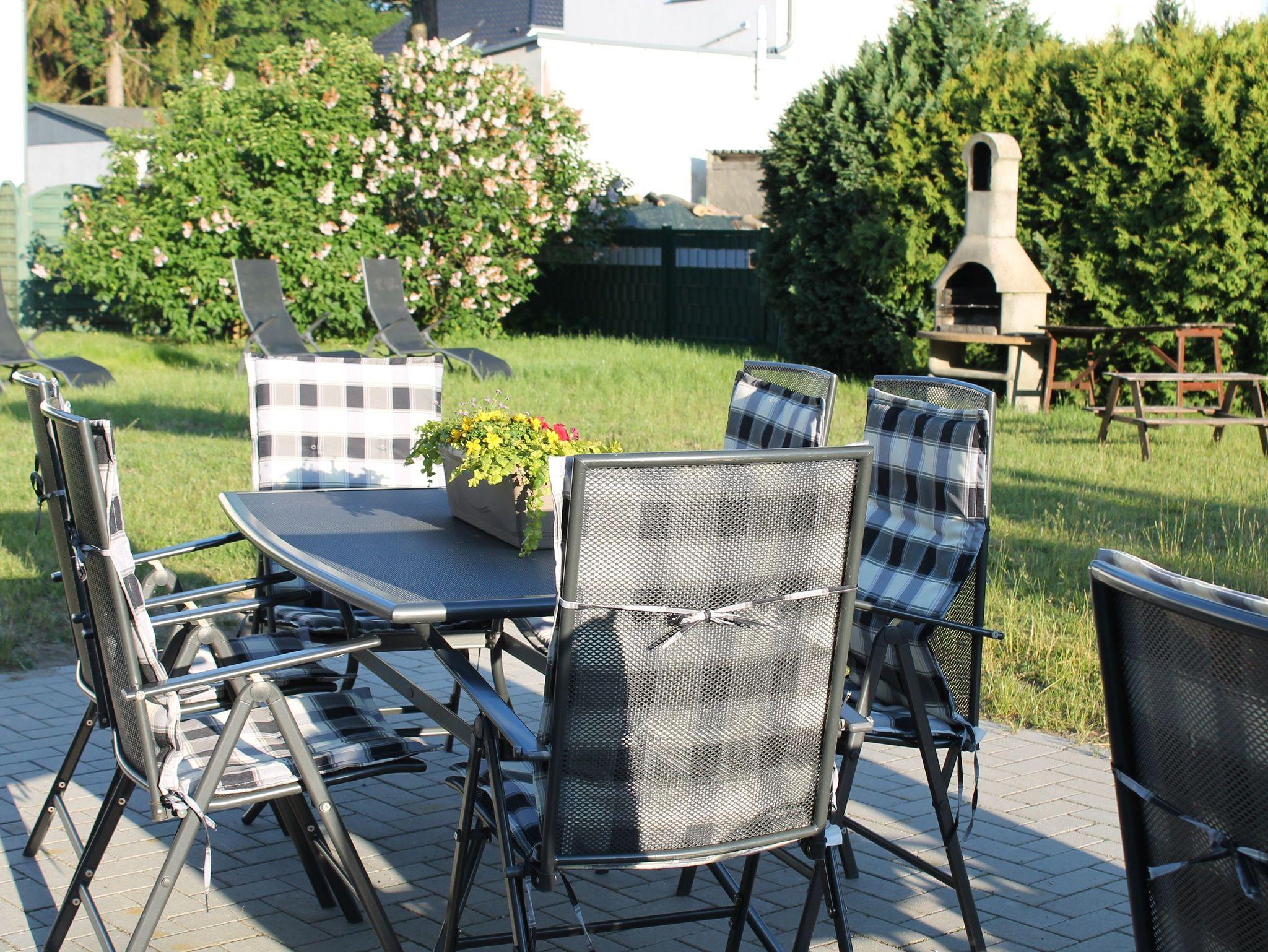 Zur großen Ferienwohnung gehört eine Außenterrasse mit Tischen, Stühlen und einem Sonnenschirm. Darüber hinaus stehen Ihnen Sonnenliegen auf der Wiese zur Verfügung.