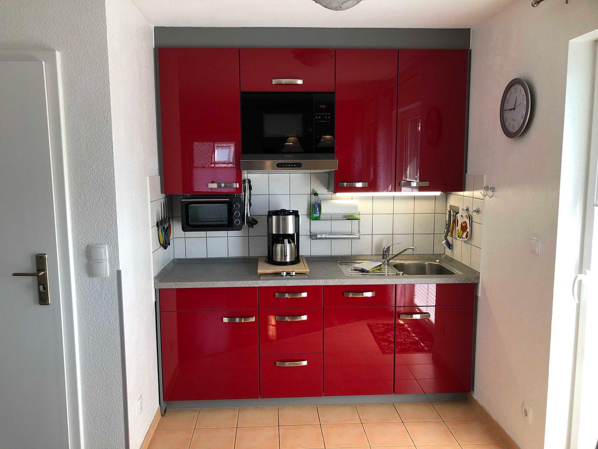 Separates Schlafzimmer mit Doppelbett (160x200), Duschbad (Fön), Küchenzeile mit Kühlschrank (4*Gefrierfach), Mikrowelle, Ceranfeld, Geschirrspüler, Kaffeemaschine, Toaster, Wasser- und Eierkocher. Balkonmöbel (Bank, Tisch und Stühle) sowie Sonnenschirm vorhanden.