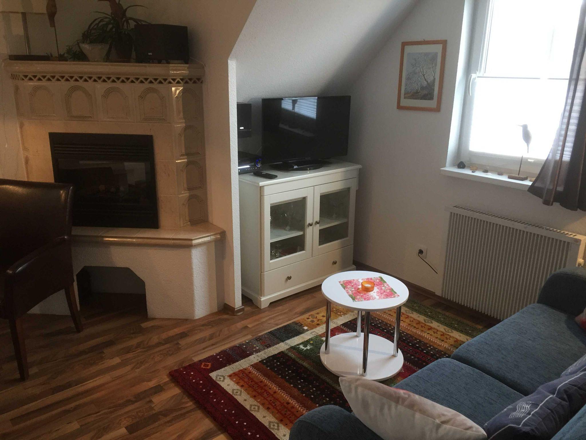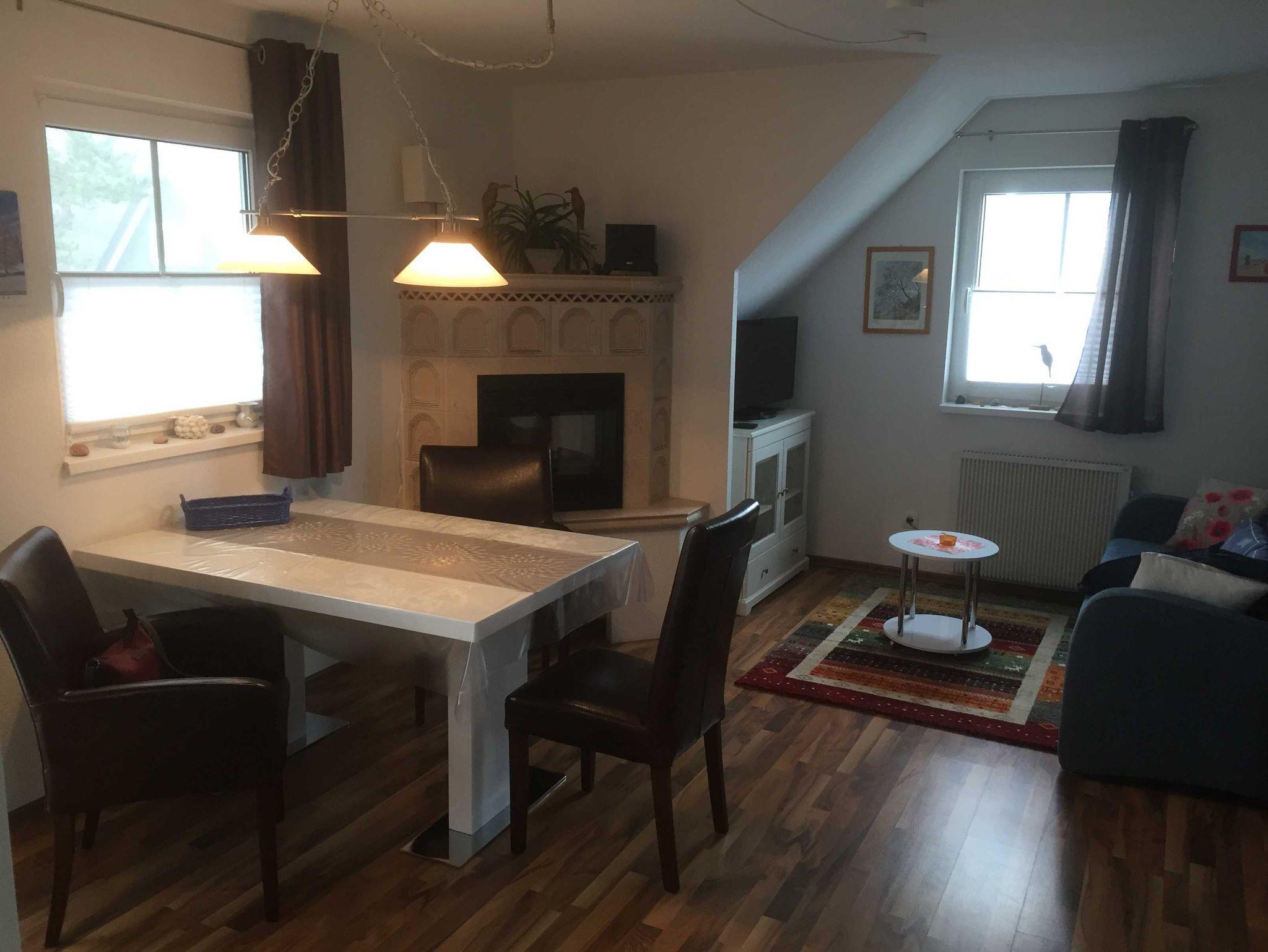 Ferienwohnung,40 qm groß, ganzjährig nutzbar im OG einer Anlage mit 6 Ferienwohnungen, verteilt auf 2 Häuser auf einem 900 m2 großen Grundstück. Wohnraum mit gemütlicher Couch, großem Esstisch, Elektrokamin, Sat-TV.