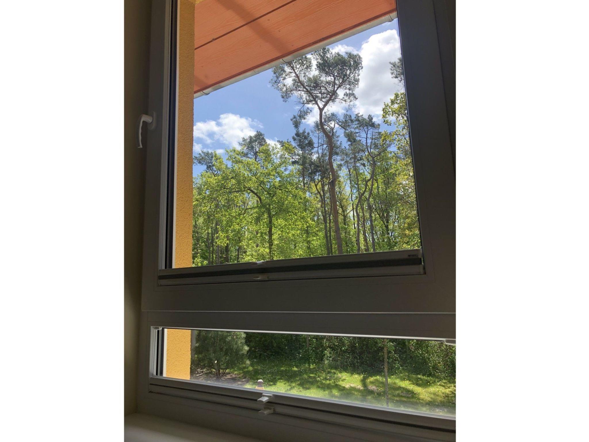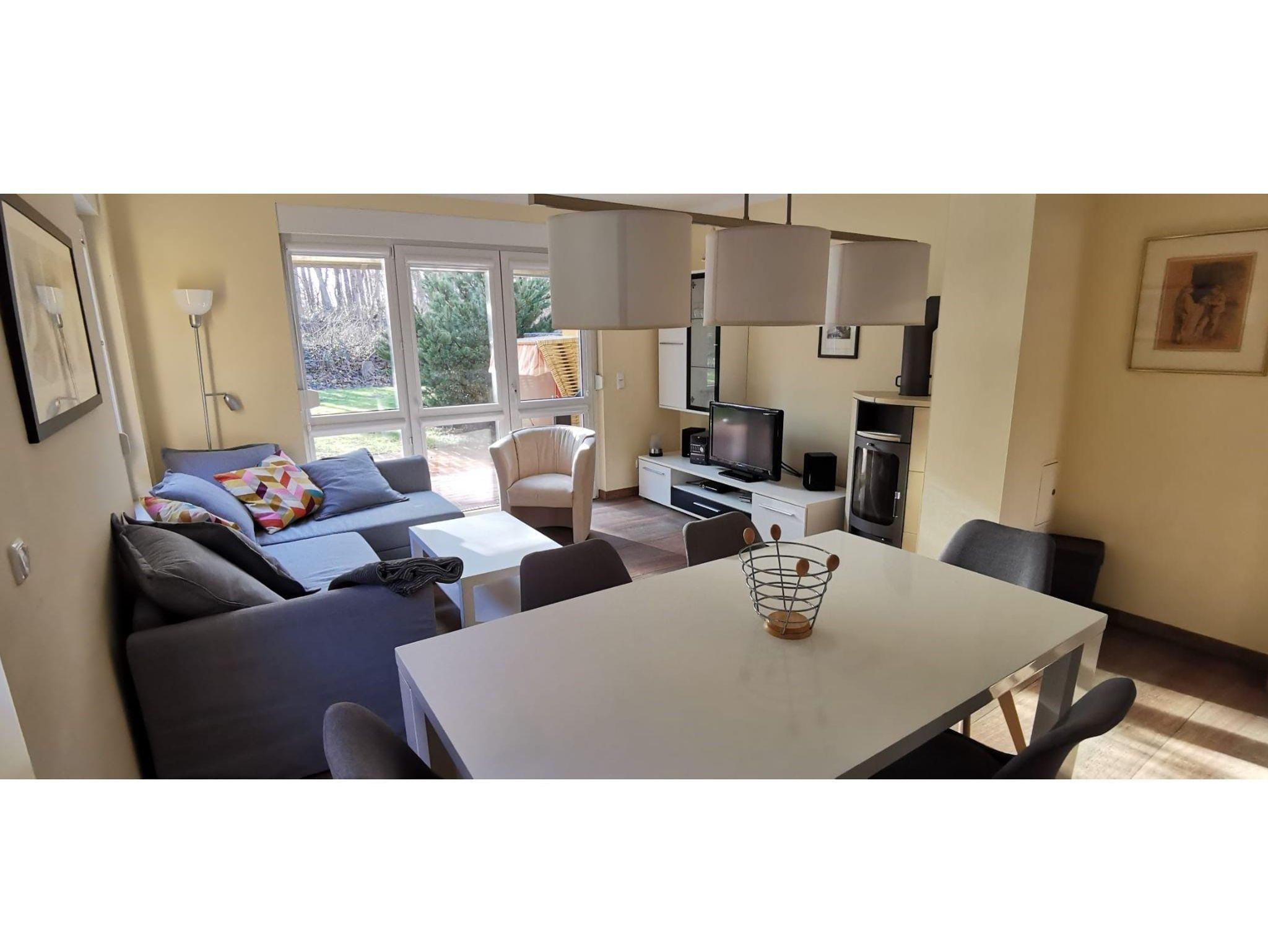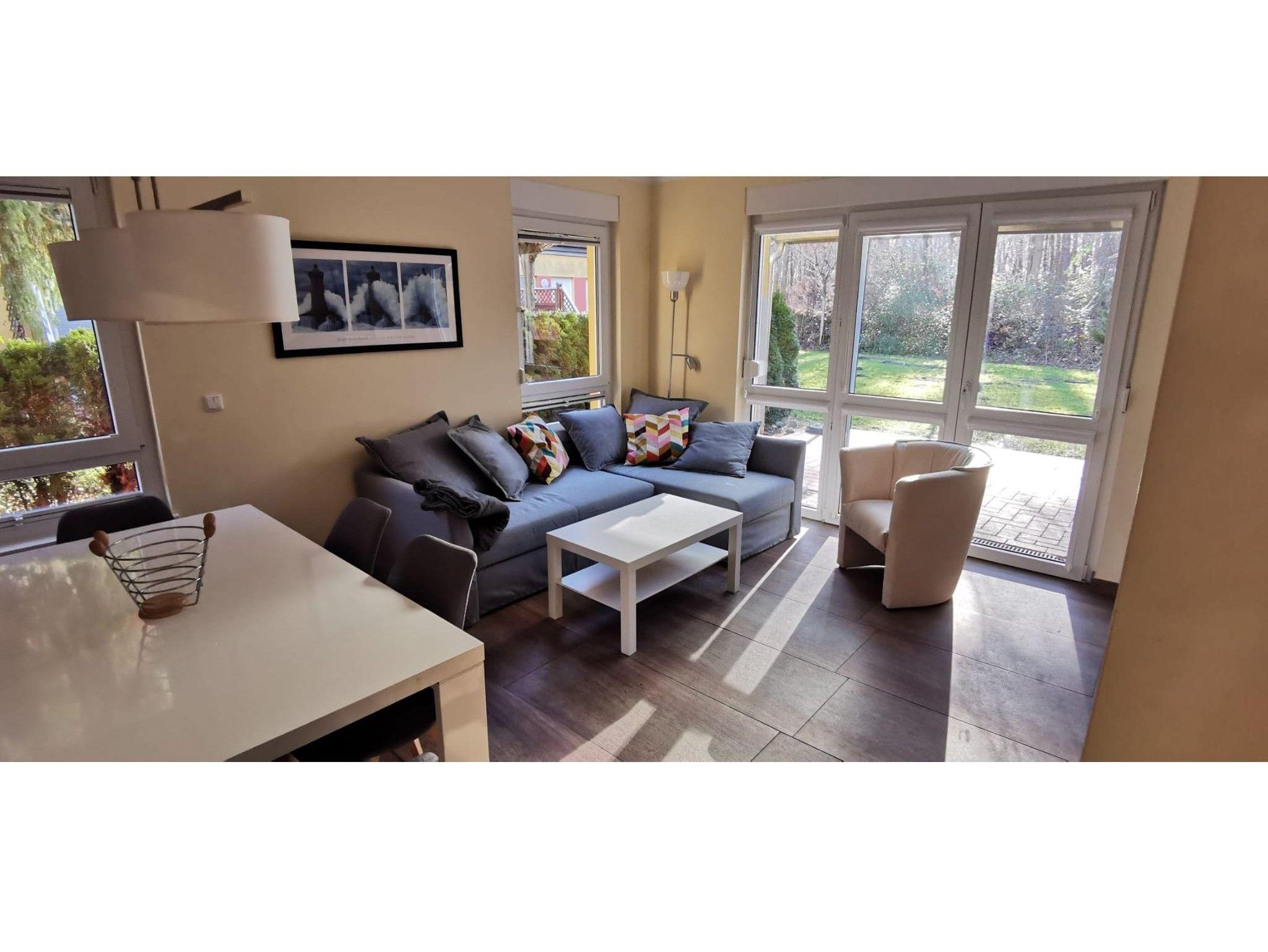 Im Erdgeschoss befindet sich das Wohnzimmer mit einer offenen Küche sowie ein großes Bad mit Dusche, WC & einer Infrarot-Wärmekabine. An das Wohnzimmer schließt die große möblierte Terrasse und ein eigener 45 m² großer Garten mit Blick zum Waldrand.