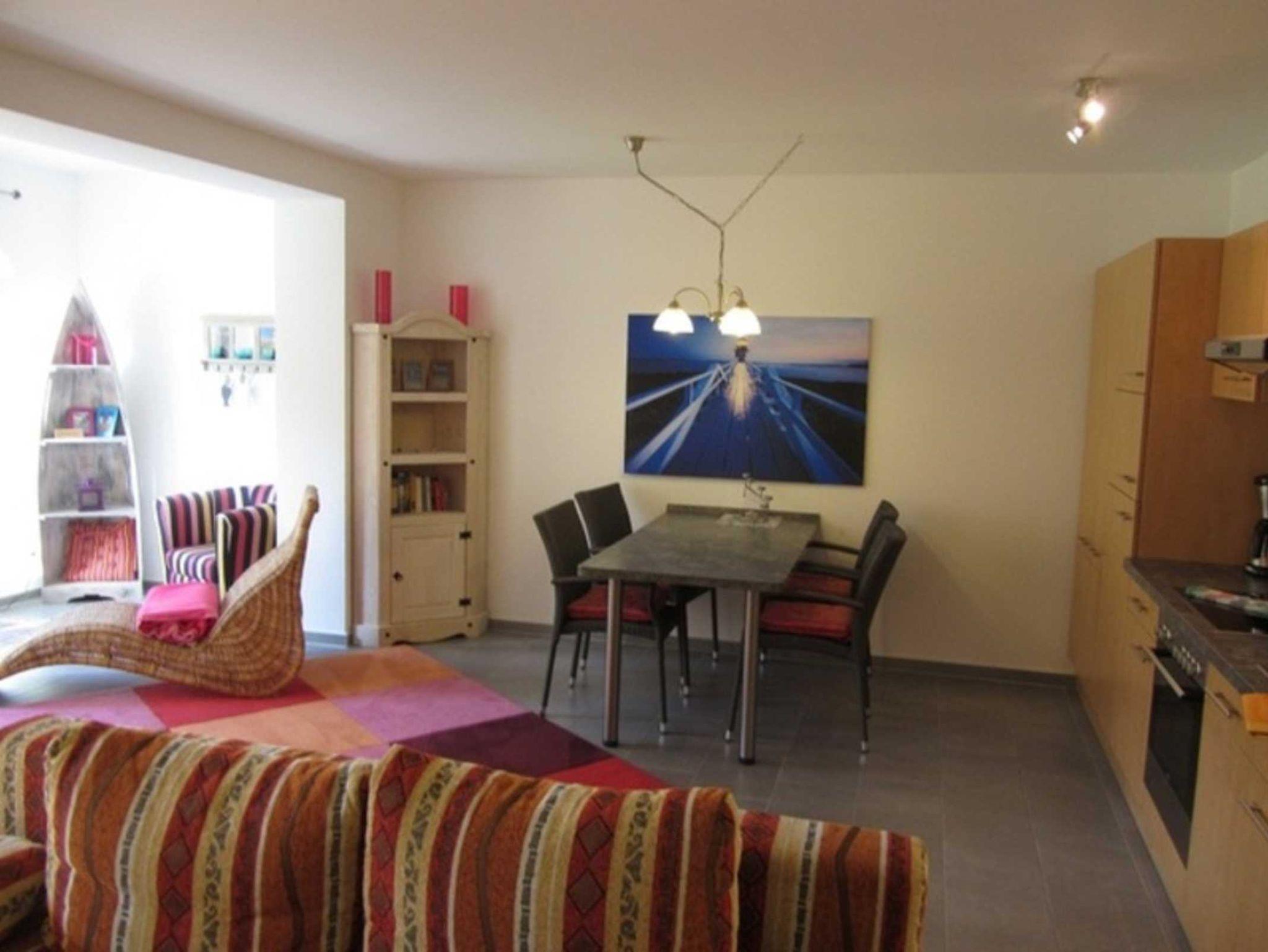 Unsere Wohnung besitzt vor dem großen Wohn-/Eßbereich (mit moderner Küchenzeile) eine ebenfalls große Terrasse mit eigenem Strandkorb. Fahrräder und Gartenmöbel finden Platz in einem separaten Fahrradschuppen.
