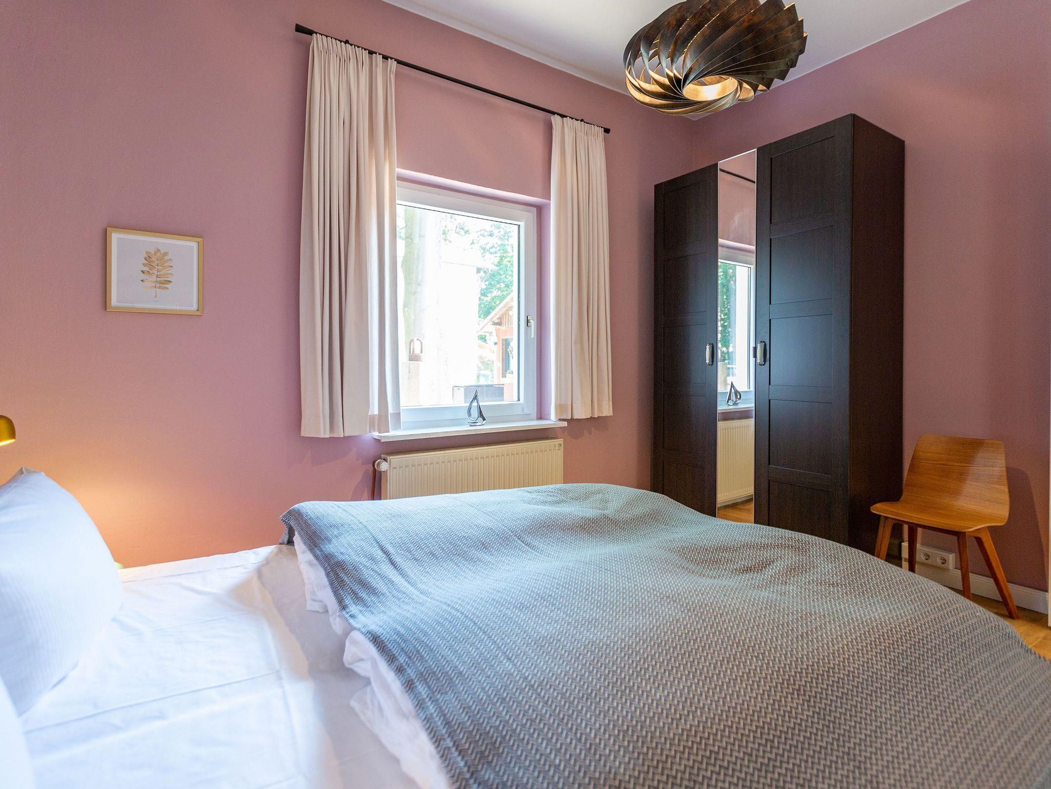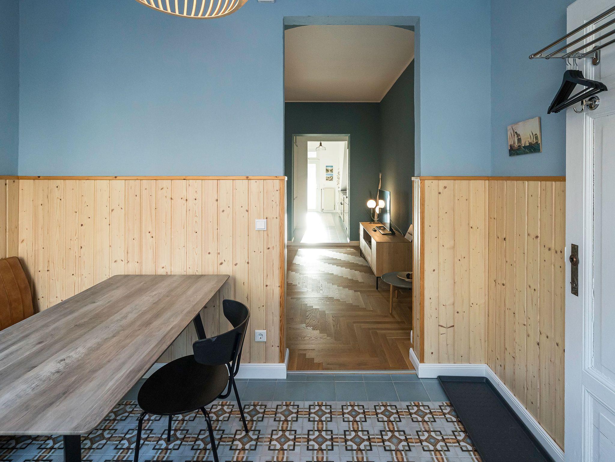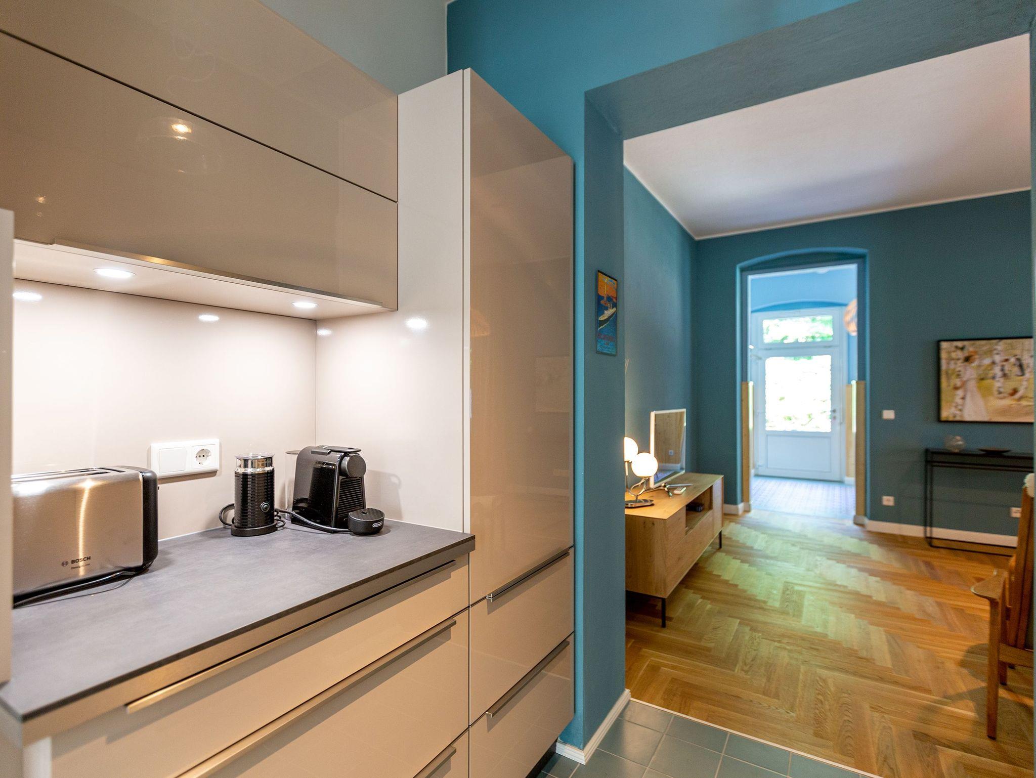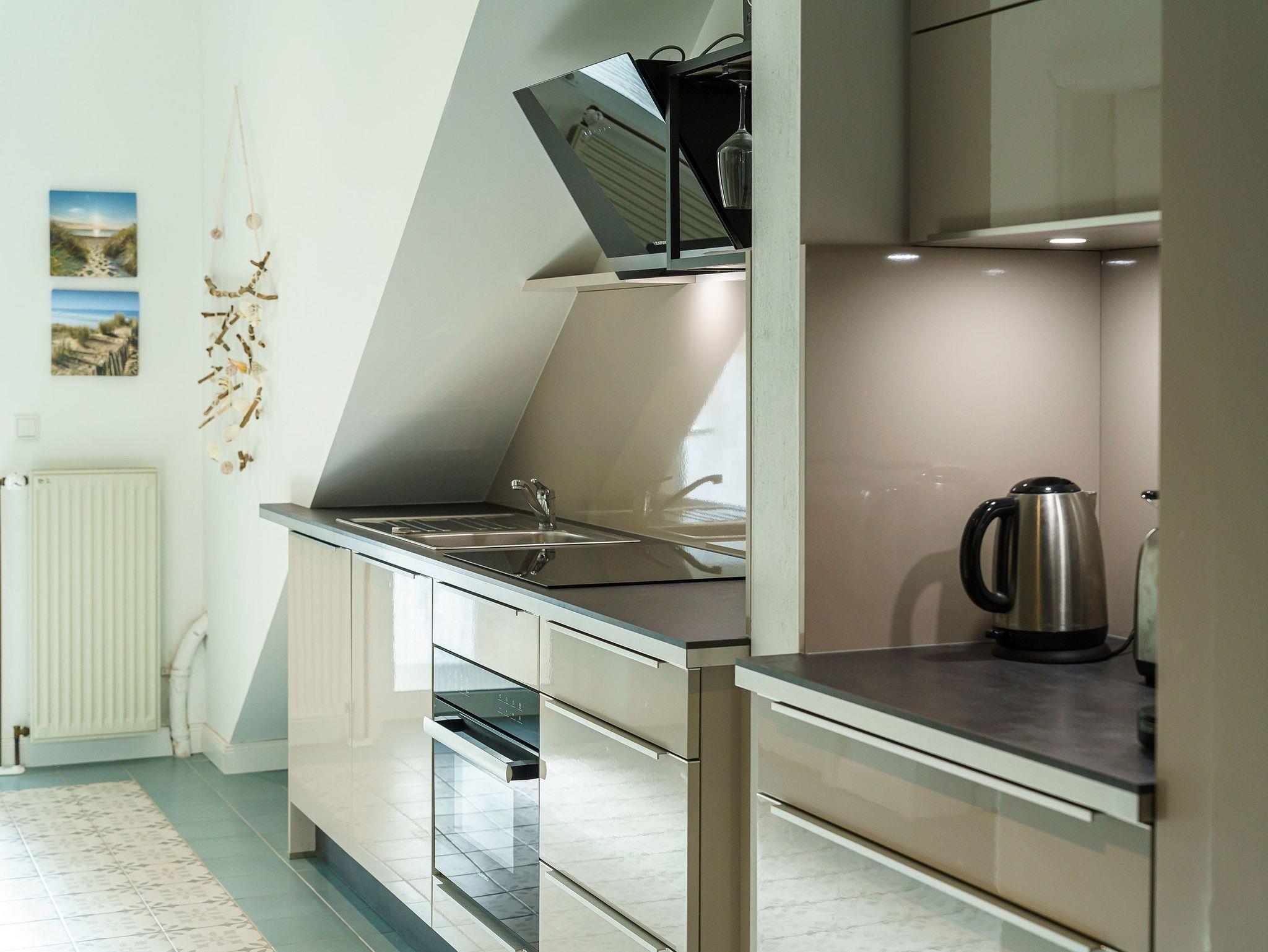 Die Ferienwohnung 2 im Erdgeschoss besticht durch ihre liebevolle Ausstattung und das durchdachte Raumkonzept. Sie umfasst einen offenen Wohnbereich mit einer komfortablen Schlafcouch, die als zusätzliche Schlafmöglichkeit dient, sowie einen Flat-TV. Die angrenzende Küchenzeile ist mit allem ausgestattet, was das Herz begehrt, von der Nesspressomaschine bis zum Backofen. Ein separater Essbereich in der Veranda bietet den perfekten Rahmen für gemeinsame Mahlzeiten oder unterhaltsame Spieleabende. Das Schlafzimmer lädt mit einem luxuriösen Boxspringdoppelbett (1,80m x 2,00m) zum Entspannen ein, während das stilvolle Badezimmer mit einer ebenerdigen Dusche, einem Waschbecken und WC ausgestattet ist. Zur Wohnung gehört zudem eine kleine, nach Norden ausgerichtete Terrasse mit Gartenmöbeln, ideal, um die frische Ostseeluft zu genießen.