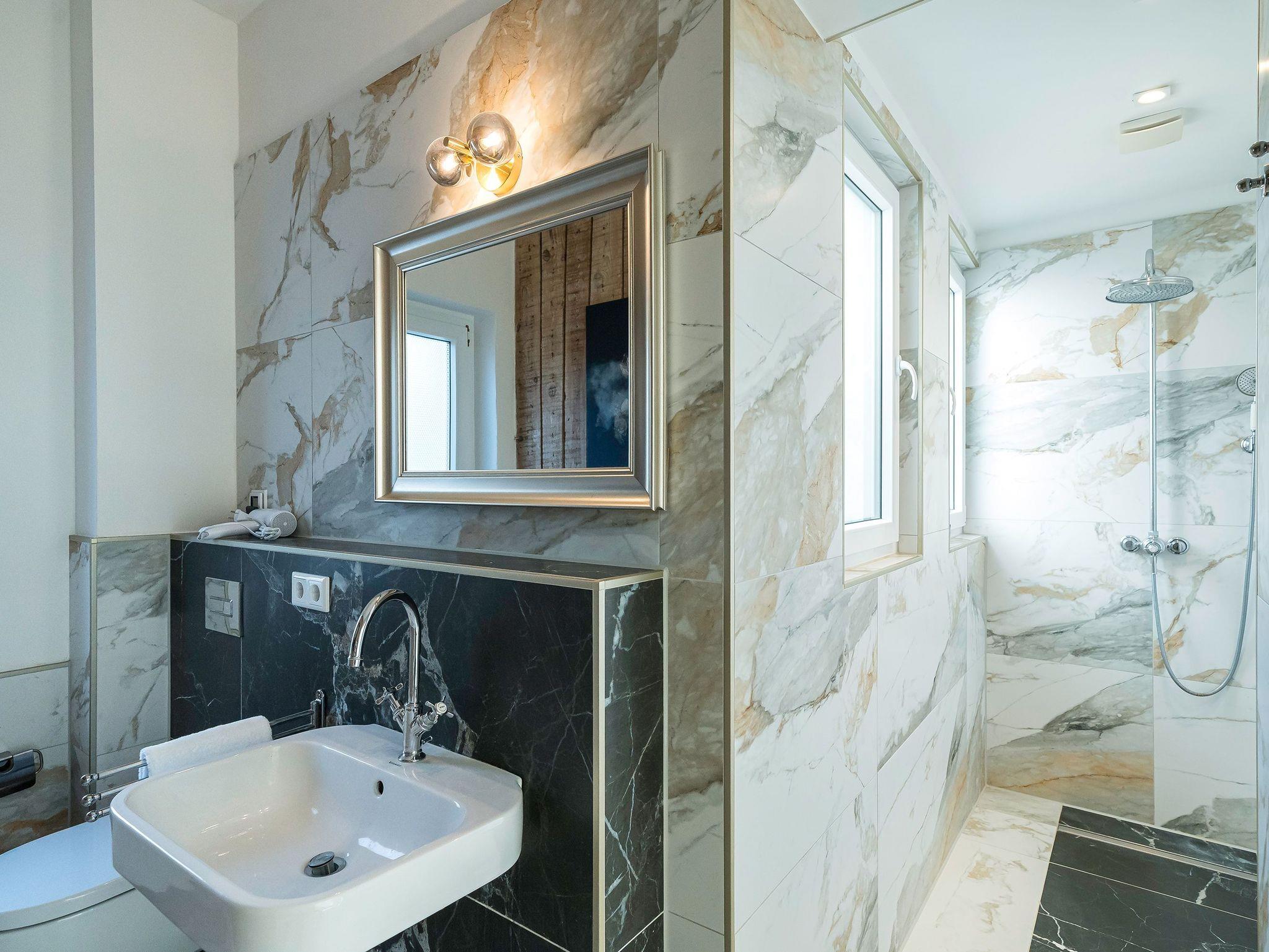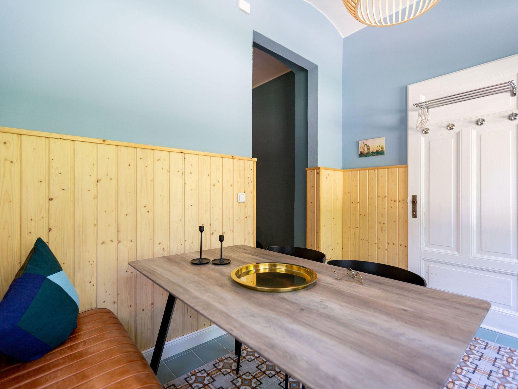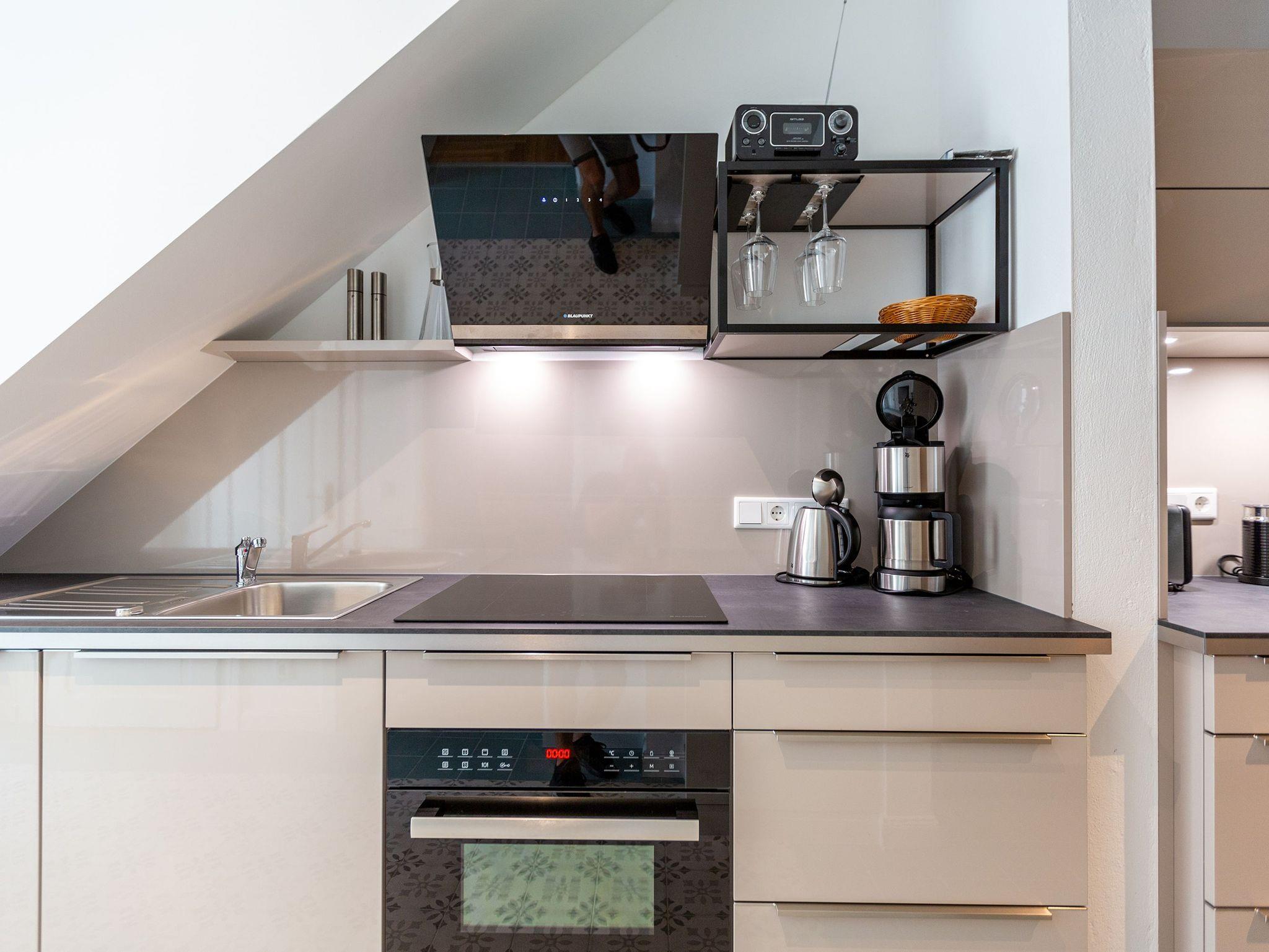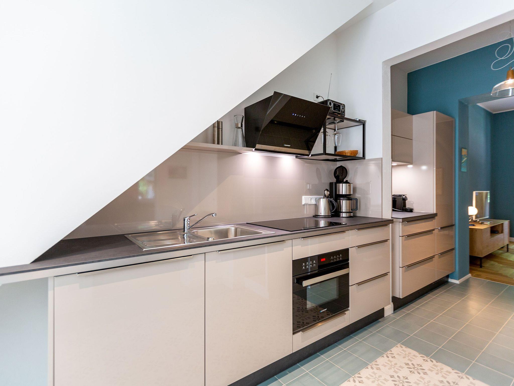 Die Ferienwohnung 2 im Erdgeschoss besticht durch ihre liebevolle Ausstattung und das durchdachte Raumkonzept. Sie umfasst einen offenen Wohnbereich mit einer komfortablen Schlafcouch, die als zusätzliche Schlafmöglichkeit dient, sowie einen Flat-TV. Die angrenzende Küchenzeile ist mit allem ausgestattet, was das Herz begehrt, von der Nesspressomaschine bis zum Backofen. Ein separater Essbereich in der Veranda bietet den perfekten Rahmen für gemeinsame Mahlzeiten oder unterhaltsame Spieleabende. Das Schlafzimmer lädt mit einem luxuriösen Boxspringdoppelbett (1,80m x 2,00m) zum Entspannen ein, während das stilvolle Badezimmer mit einer ebenerdigen Dusche, einem Waschbecken und WC ausgestattet ist. Zur Wohnung gehört zudem eine kleine, nach Norden ausgerichtete Terrasse mit Gartenmöbeln, ideal, um die frische Ostseeluft zu genießen.