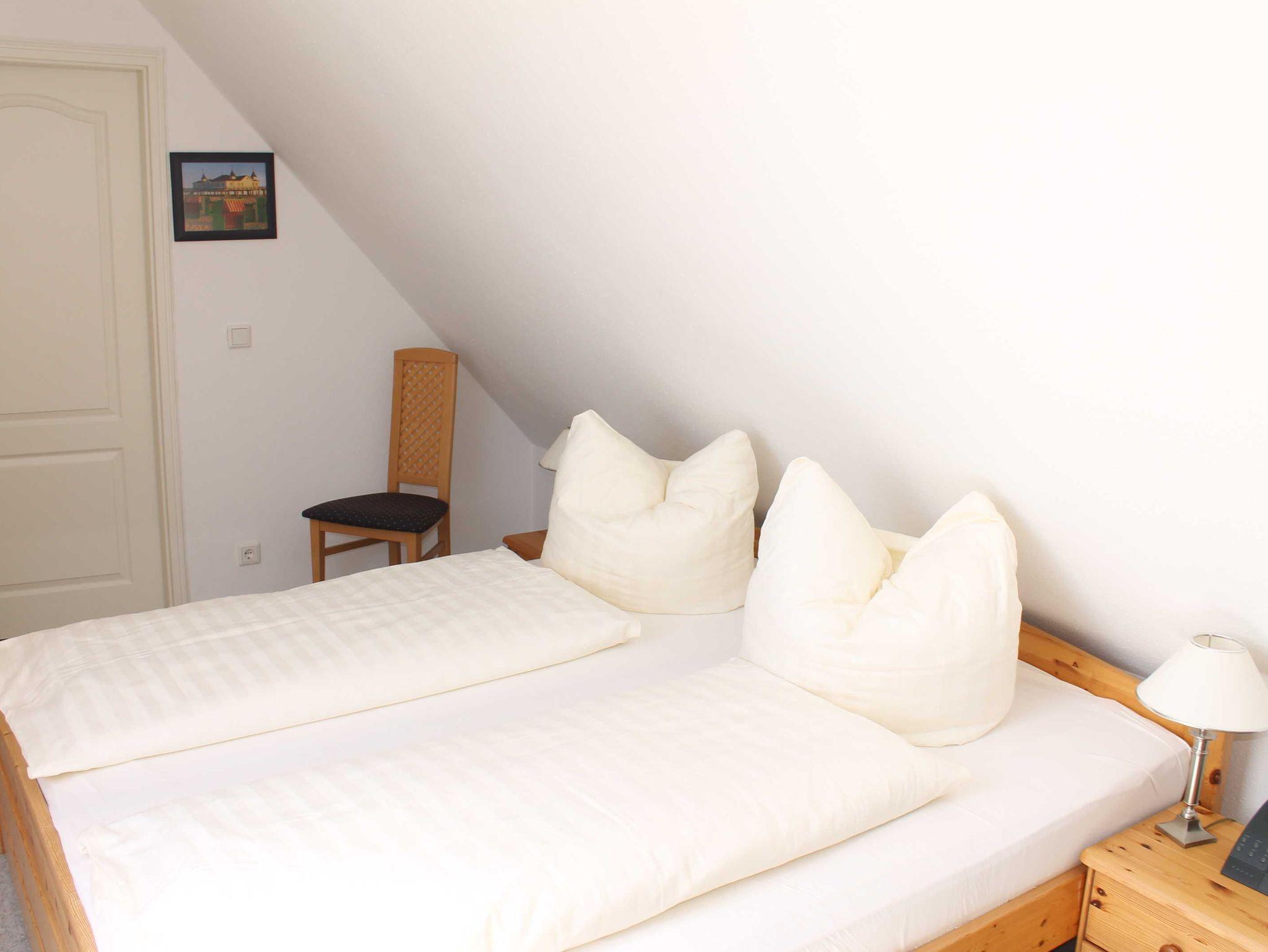 Sie wohnen in einer 45 qm großen 3-Raum Komfort-Dachgeschoß-Wohnung für 4 Personen. Der helle Wohnbereich hat eine komfortable Wohnlandschaft mit Essbereich. Die angrenzende, offene Küchenzeile ist ausgestattet mit einen 2 Platten Kochfeld, Kühlschrank, Spülmaschine und Kaffeemaschine. Über eine Raumspartreppe (steile, gewendelte Treppe, nicht geeignet für Ältere & Kleinkinder) erreichen Sie die beiden Schlafräume. Ein Schlafraum verfügt über ein Doppelbett mit Kleiderschrank, das andere Schlafzimmer hat 2 Einzelbetten und einen Kleiderschrank. Das Bad verfügt über eine Dusche, Waschbecken und WC. Die Dachgeschosswohnung ist mit Direktwahltelefon, WLAN und LED TV ausgestattet. Auf dem Grundstück steht den Gästen eine Terrasse zur Verfügung. Die Erstausstattung Bettwäsche und Handtücher ist bereits inklusive.