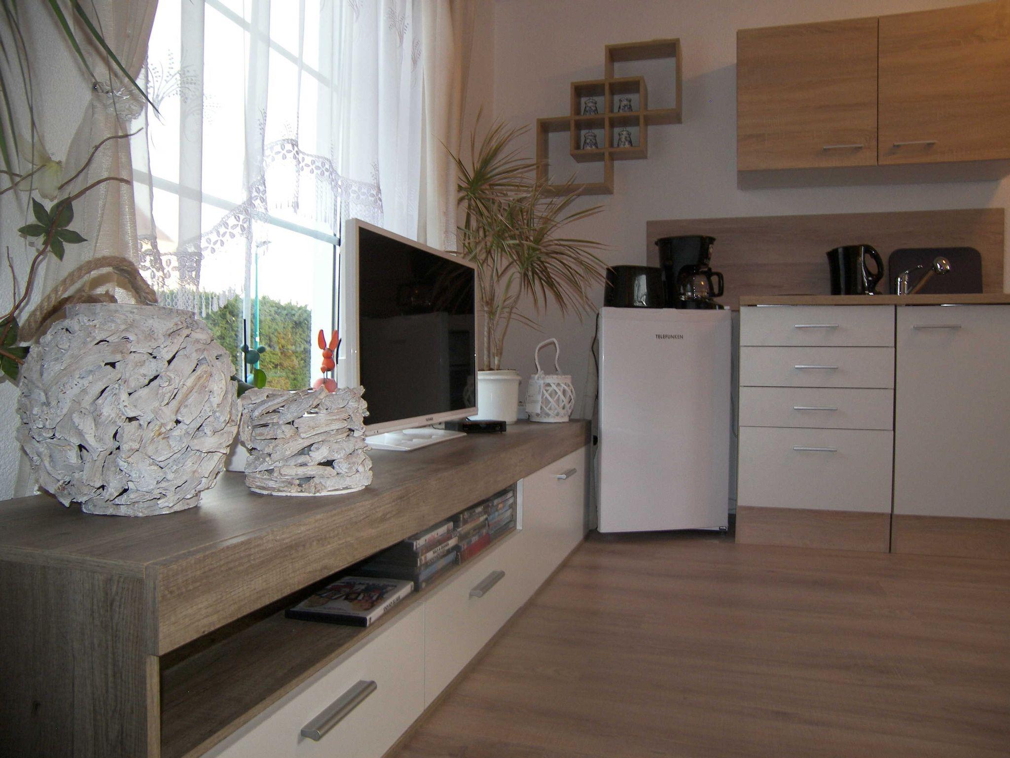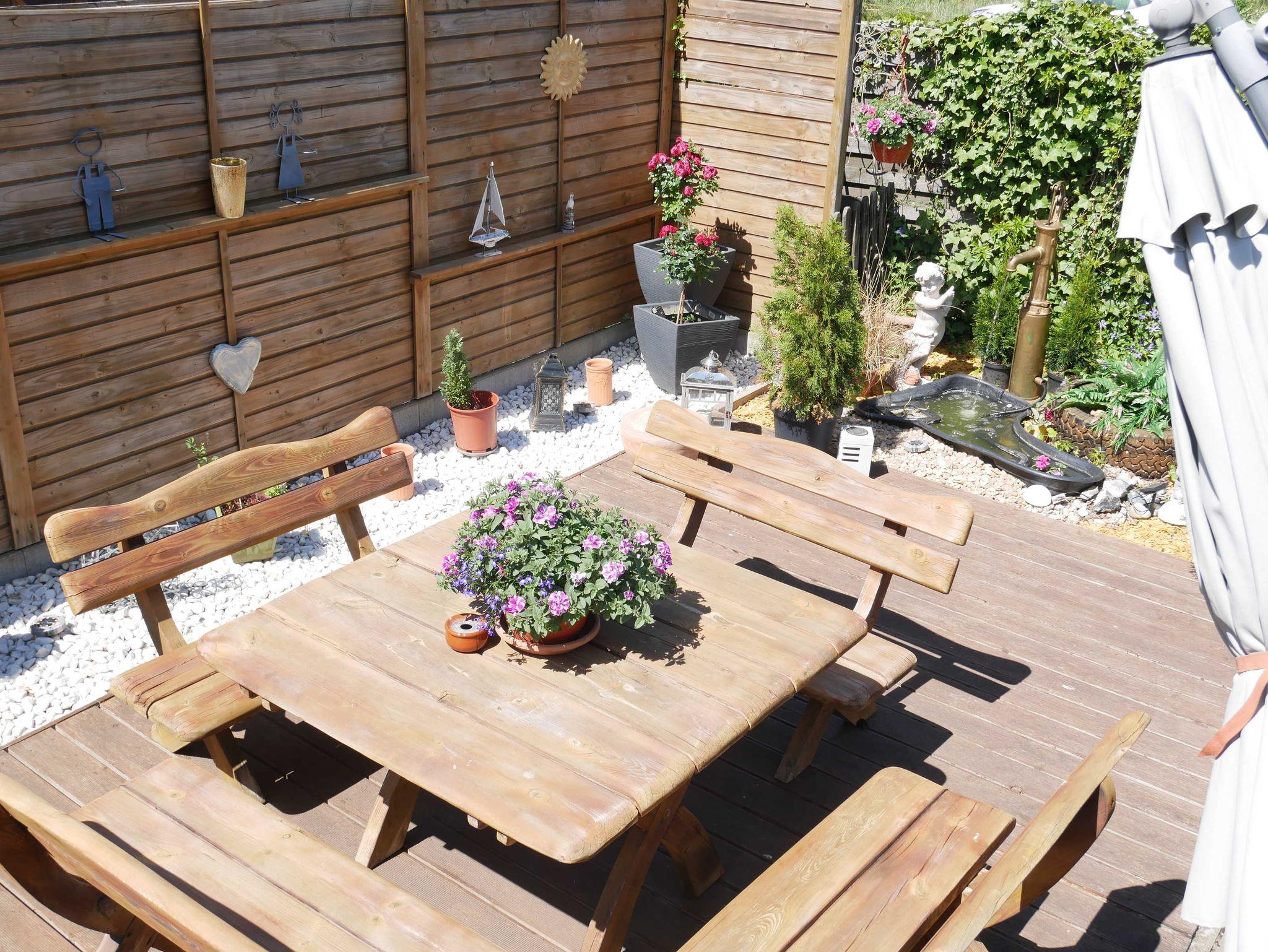 Die 35 qm große Ferienwohnung verfügt über ein Wohnzimmer mit einer gemütlichen Couch, einem Flachbildfernseher, Radio und offenen Küchenzeile. Die Küche ist ausgestattet mit 2-Platten-Herd, Kühlschrank, Wasserkocher, Toaster und Kaffeemaschine. Das separate Schlafzimmer ist mit einem Doppelbett und Kleiderschrank ausgestattet. Das Badezimmer verfügt über eine Dusche und einen Haartrockner. Draußen steht Ihnen eine ca. 40qm große Terrasse inklusive Sonnenschirm, Wäschespinne, Grill, Fahrradunterstellmöglichkeit und diversen Sitzmöbeln zur Verfügung. Fahrräder können vor Ort kostenpflichtig ausgeliehen werden.