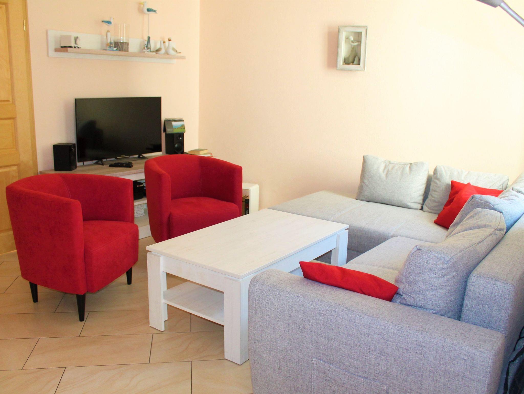 Das modern eingerichtete Wohnzimmer mit großer Couch, Flachbild-TV und DVD-Player hat Wohlfühlcharakter.