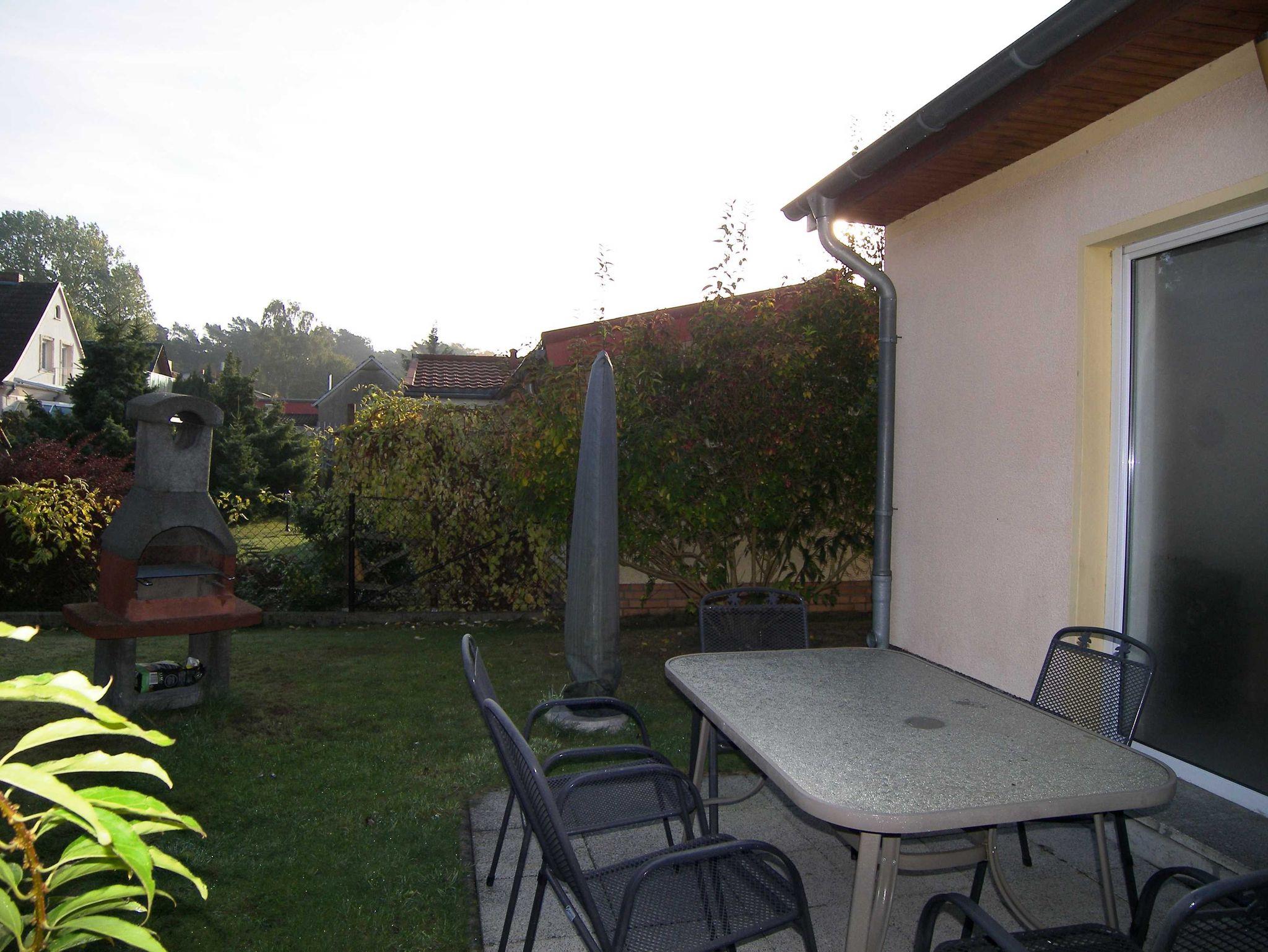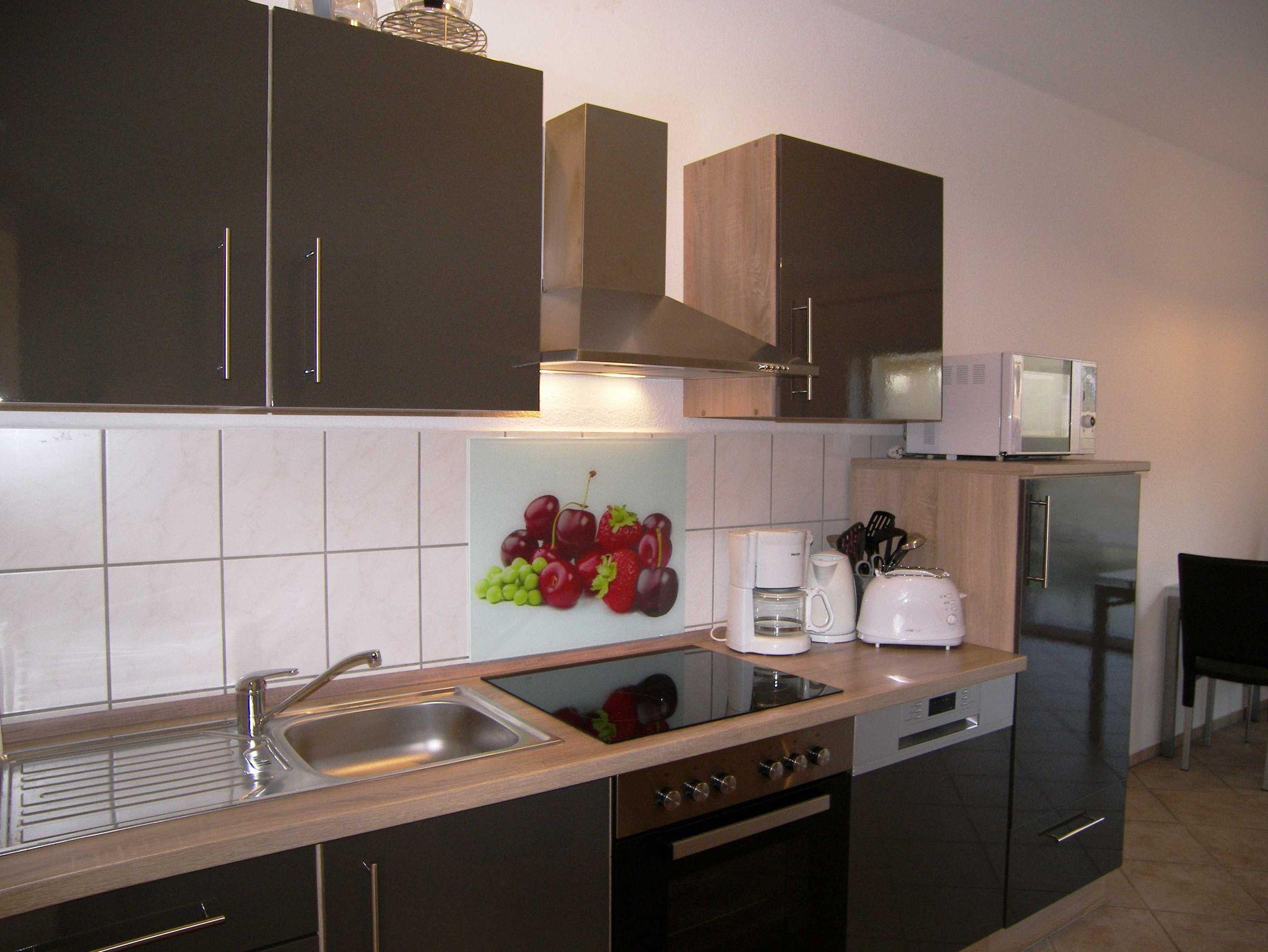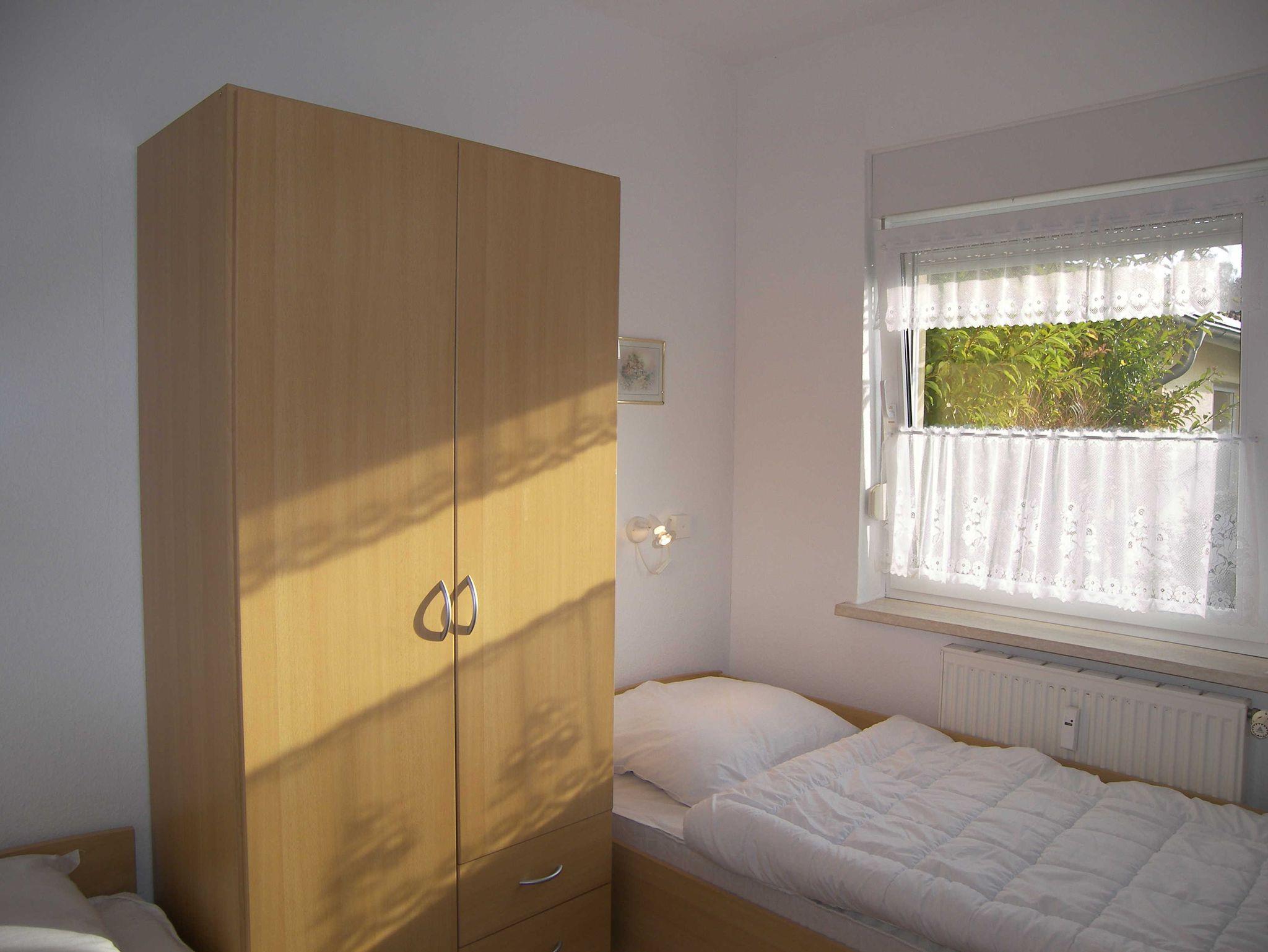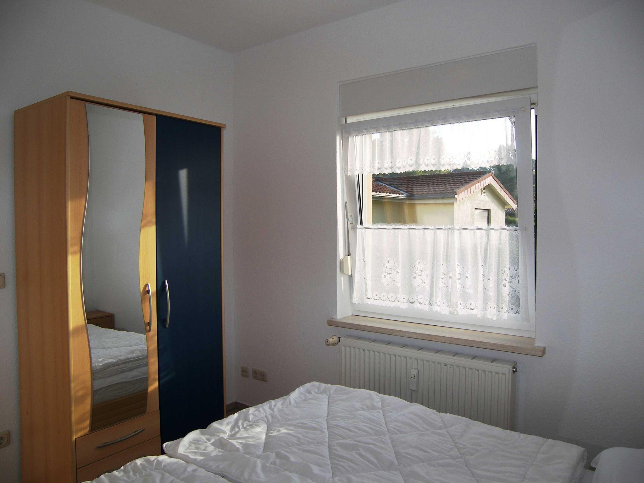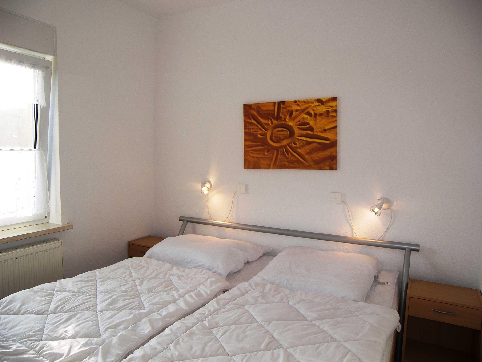 Die 50 qm große Ferienwohnung verfügt über einen separaten Eingang und eine eigene Terrasse. Der offene Wohnbereich ist mit einer zweckmäßigen Couch und einem Flat-TV, sowie mit einem Esstisch ausgestattet und schließt an die offene Küchenzeile an. Diese ist mit Backofen, Cerankochfeld, Spülmaschine, Kühlschrank, Wasserkocher, Toaster und Kaffeemaschine ausgestattet. Das größere Schlafzimmer ist mit einem Doppelbett und einem Kleiderschrank ausgestattet, das kleinere Schlafzimmer mit zwei Einzelbetten. Das Badezimmer verfügt über Dusche/WC. Bettwäsche und Handtücher können gegen Gebühr dazugebucht werden. Haustiere sind in dieser Wohnung nicht erlaubt!