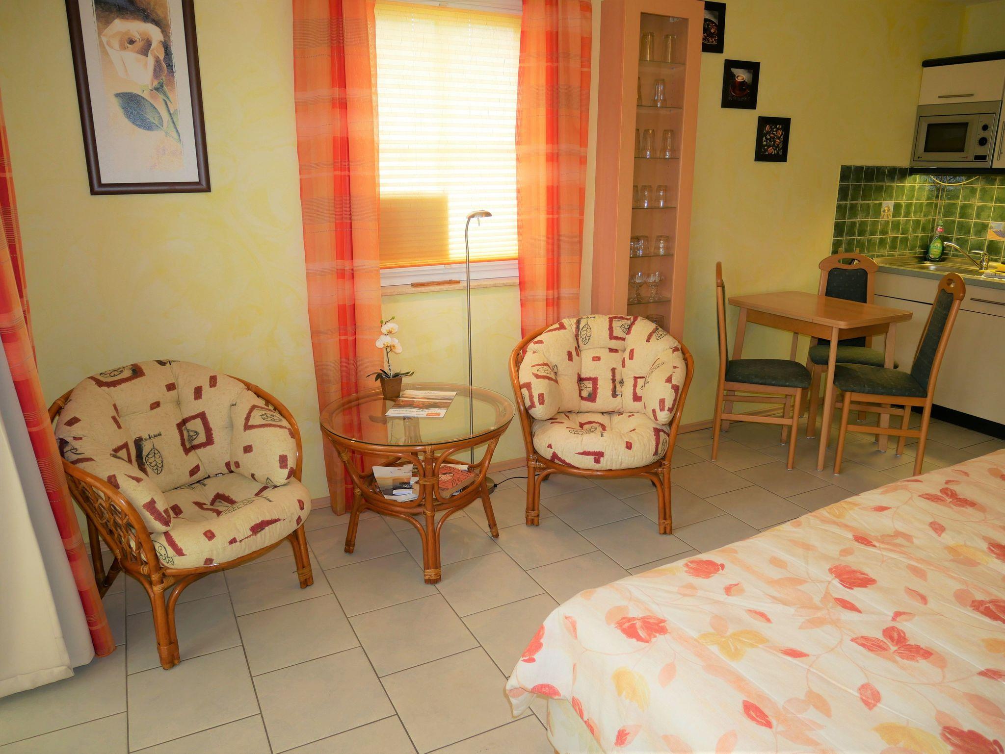 Die gemütliche Ferienwohnung ist ca. 30qm groß und für 2 Personen geeignet. Sie befindet sich im Erdgeschoss und hat einen separaten Eingang sowie eine Terrasse. Die Ferienwohnung verfügt über einen kombinierten Wohn-Schlafraum mit Doppelbett, Flat-TV, Esstisch & Mini-Küche mit 2-Plattenherd, Kühlschrank, Kaffeemaschine, Wasserkocher und Toaster. Zusätzlich gibt es ein kleines separates Zimmer mit einem Schlafsofa.