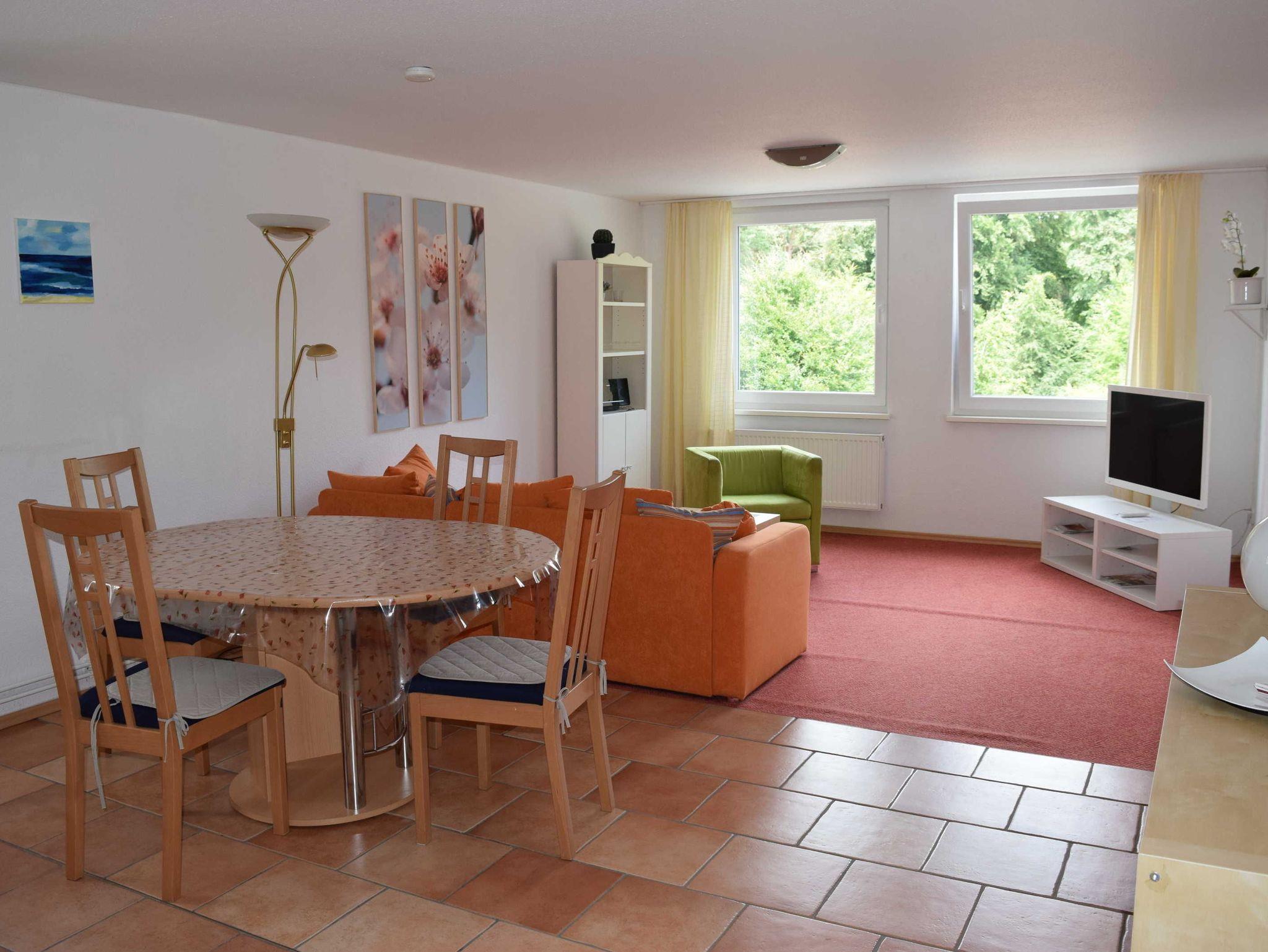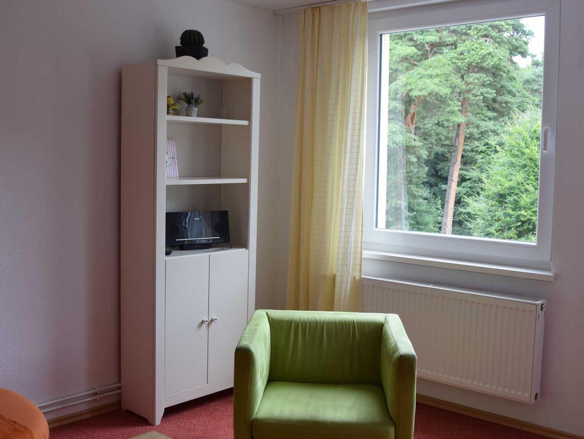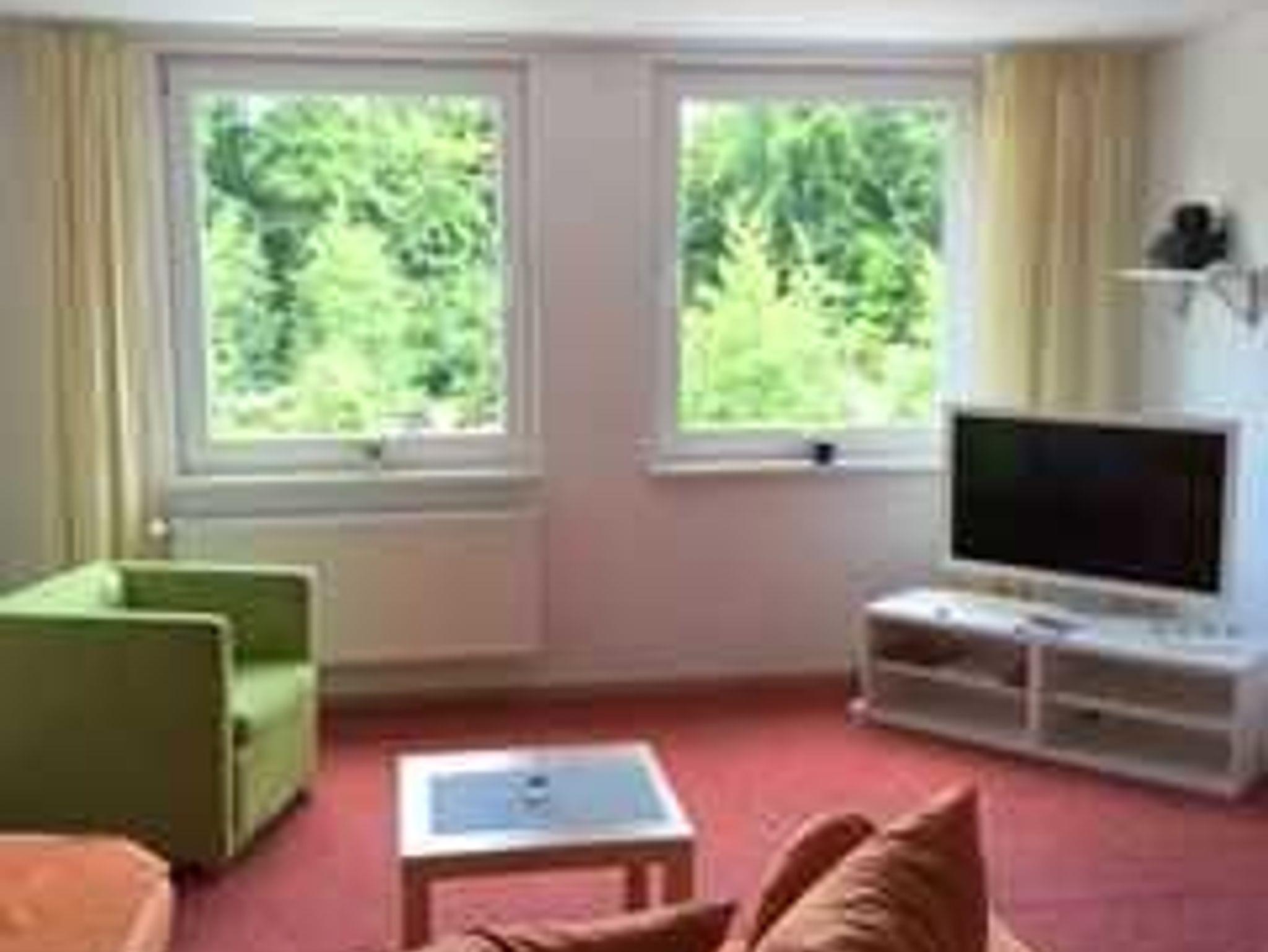 Im Wohnbereich steht Ihnen eine Sitzgruppe, ein Sessel sowie eine Leselampe für gemütliche Schmöckerstunden zur Verfügung. Natürlich hat die Wohnung auch einen Fernseher. Eine großes Fensterfront im Wohnzimmer bietet Ihnen einen Blick auf den Wald. Die Wohnung besitzt einen Südbalkon, der mit Möbeln ausgestattet ist. Hier können Sie die Sonne genießen.