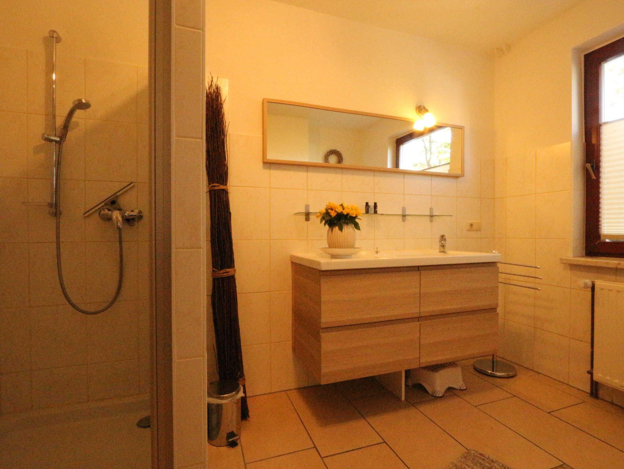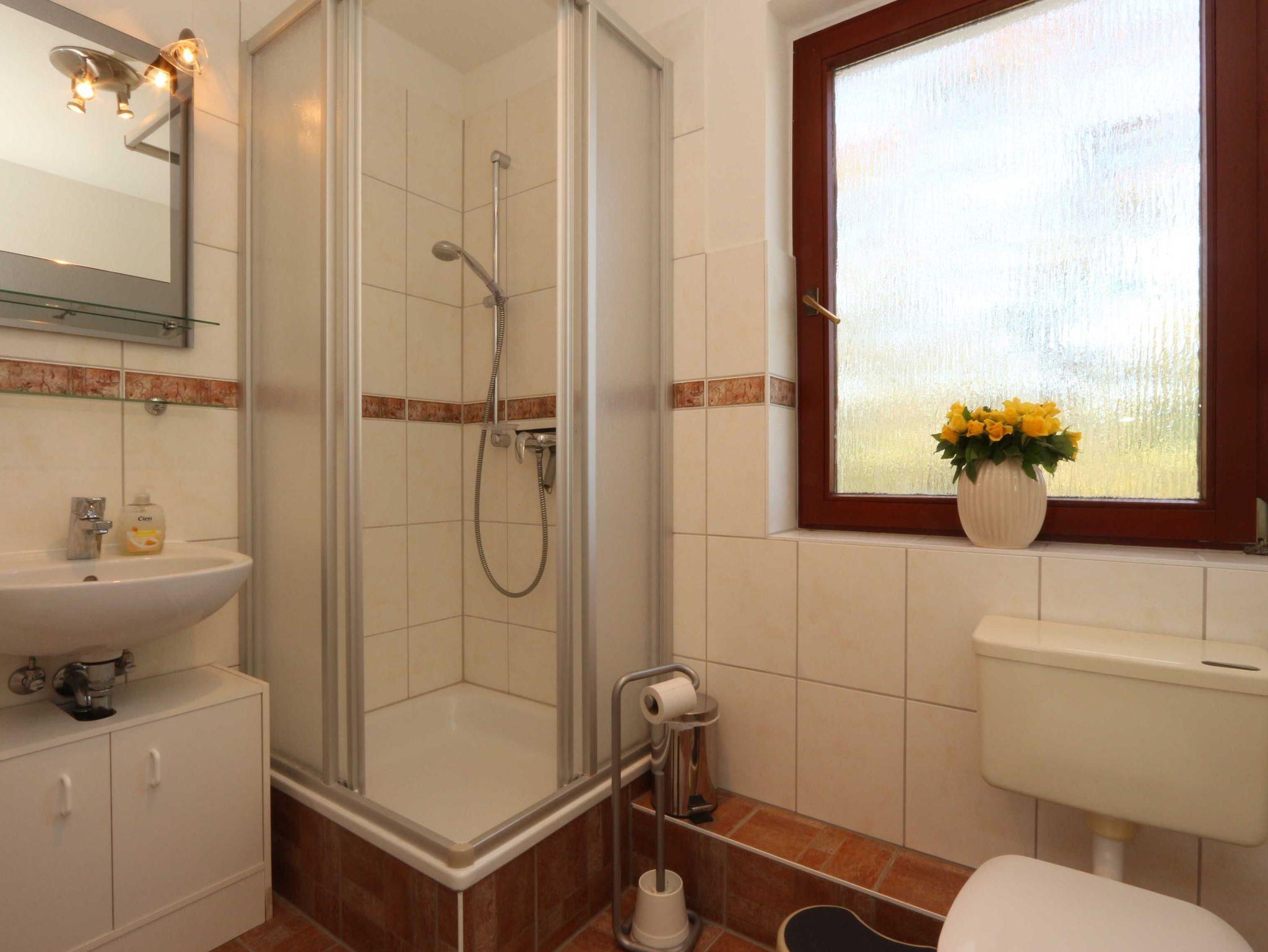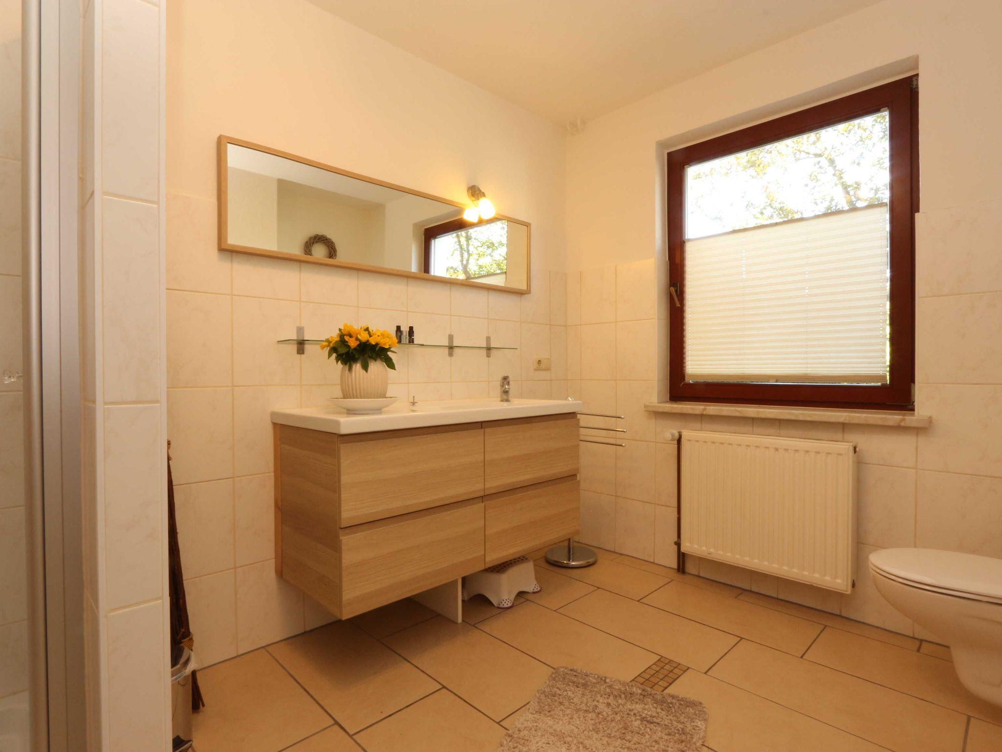 • grosses Badezimmer mit Sauna, Dusche, Fenster, Waschbecken und WC;