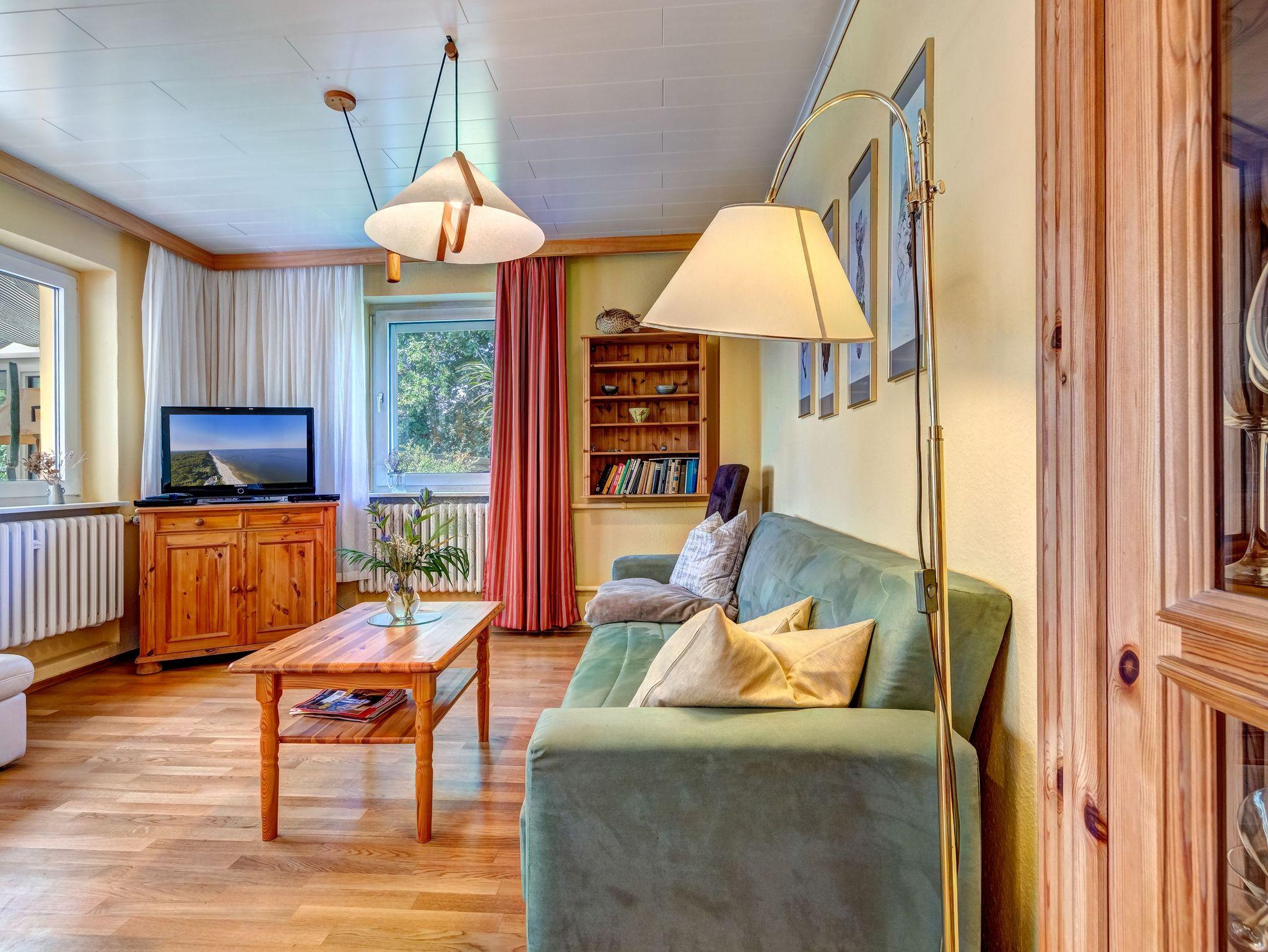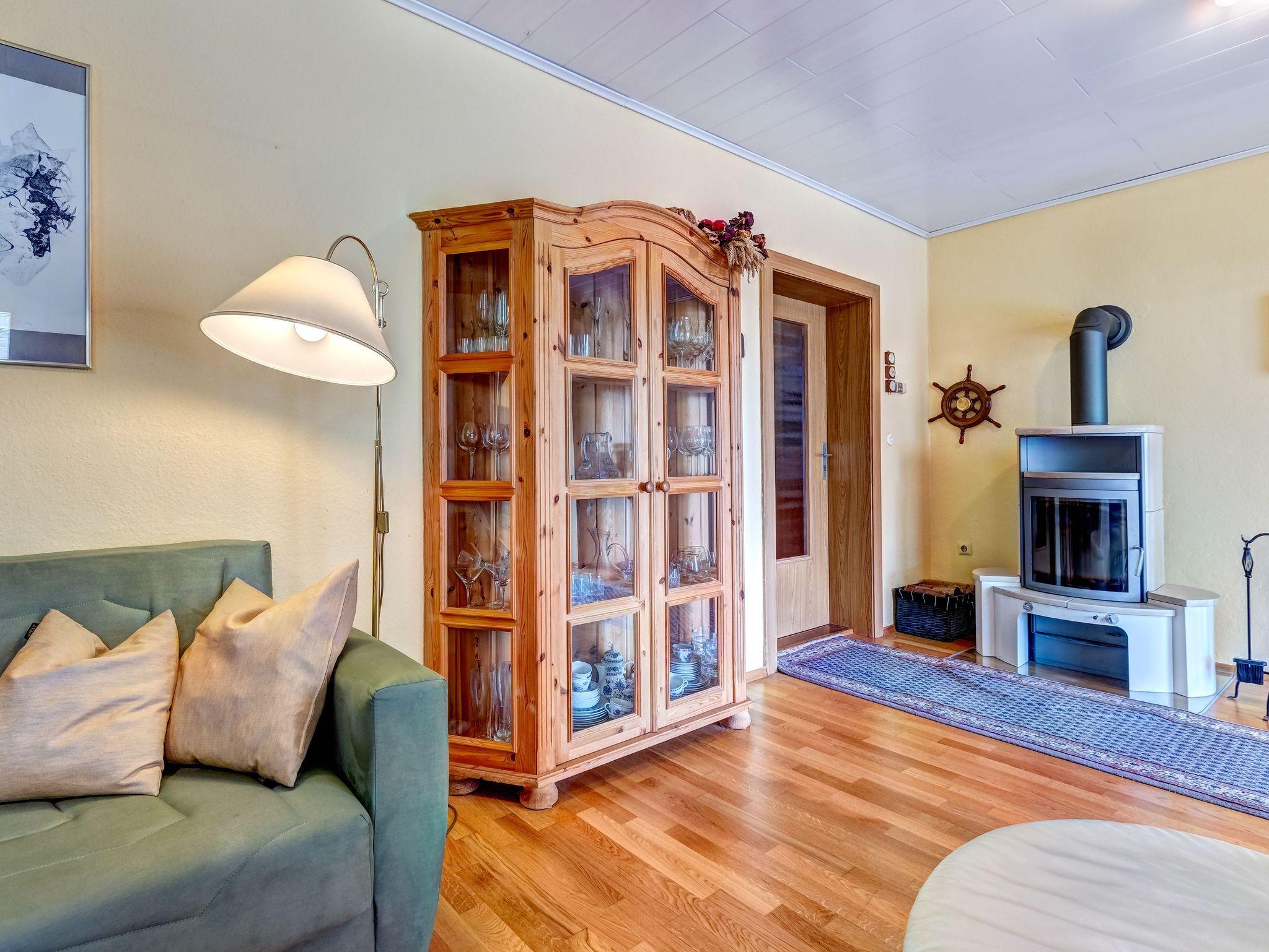 Im Wohnzimmer erwartet Sie eine einladende Sitzecke mit Couch und Sesseln, einem Fernseher und DVD-Player, perfekt für entspannte Abende vor dem Kaminofen.