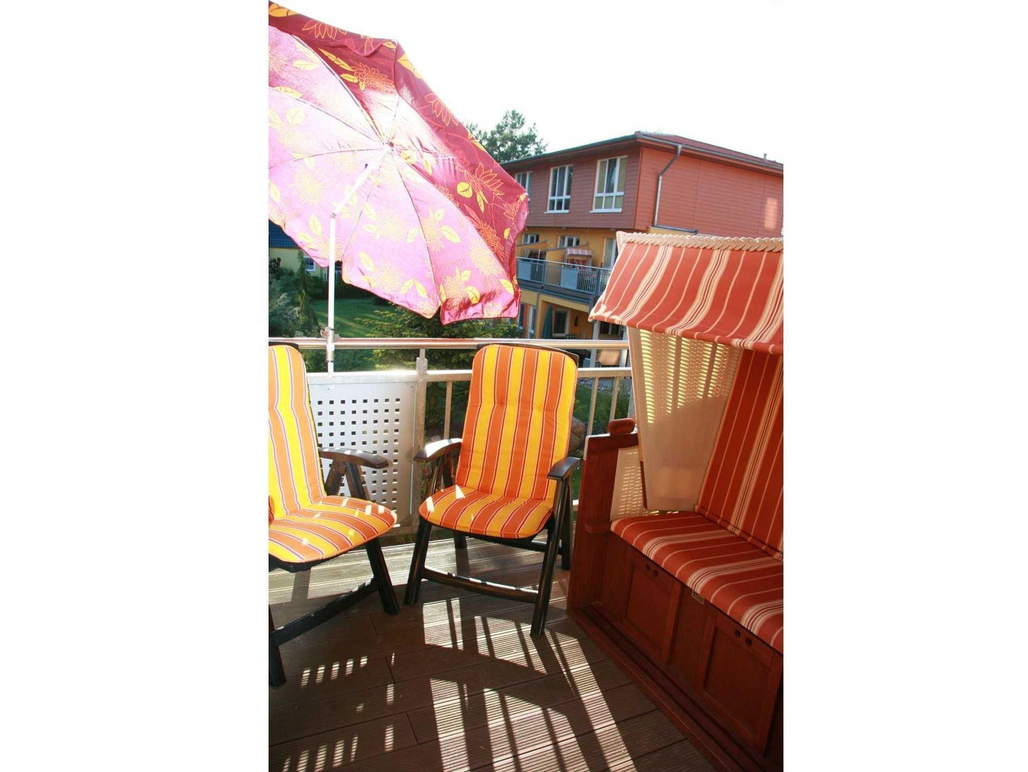 1 Balkon mit Gartenmöbeln, Sonnenschirm & Strandkorb
