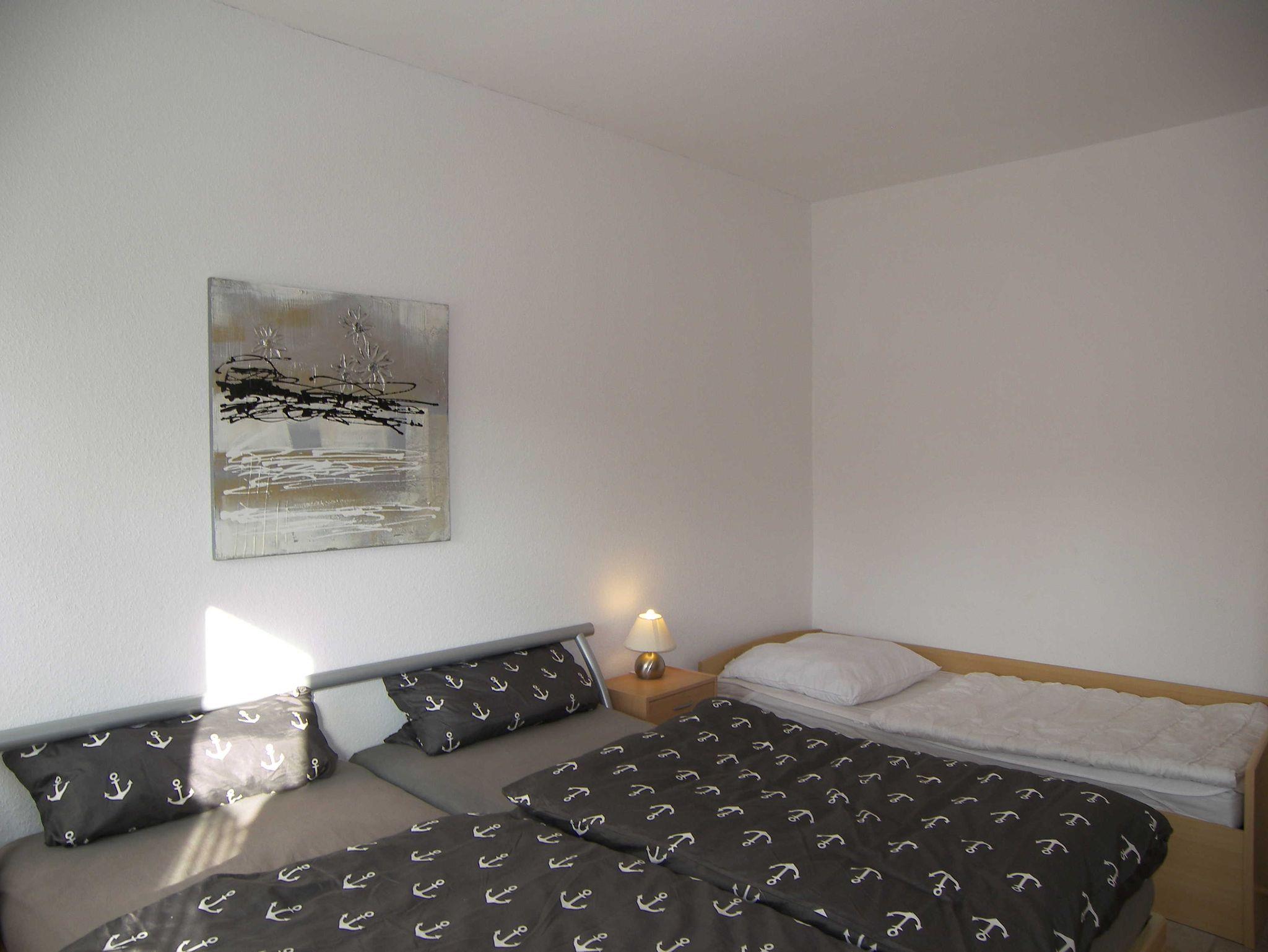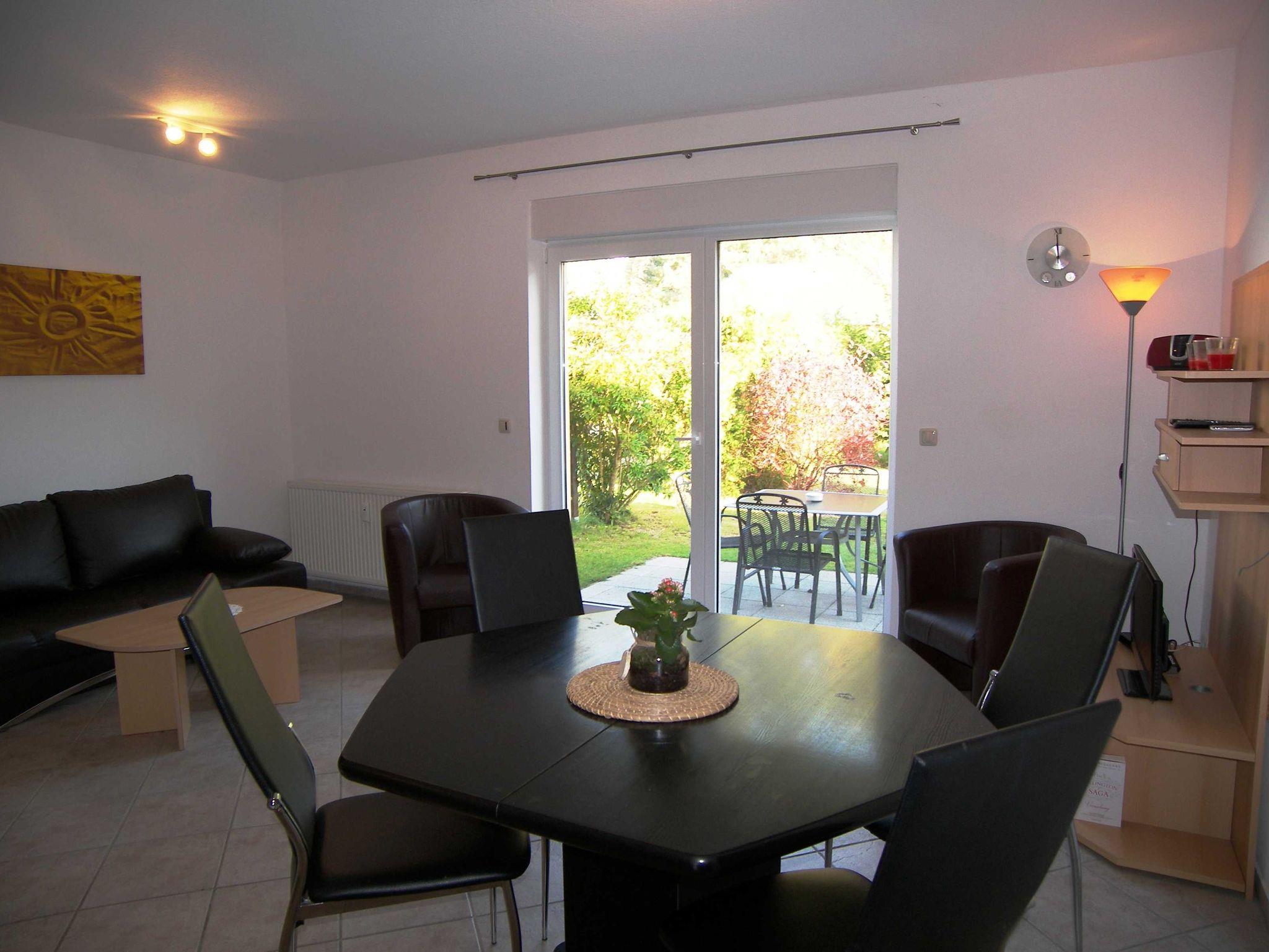 Die 50 qm große Ferienwohnung verfügt über einen separaten Eingang und eine eigene Terrasse. Der offene Wohnbereich ist mit einer zweckmäßigen Couch und einem Flat-TV sowie einem Esstisch ausgestattet und schließt an die offene Küchenzeile an. Diese ist mit Backofen, Cerankochfeld, Spülmaschine, Kühlschrank, Wasserkocher, Toaster und Kaffeemaschine ausgestattet. Das Schlafzimmer ist mit einem Doppelbett und zwei Einzelbetten ausgestattet. Das Badezimmer verfügt über Dusche/WC. Bettwäsche und Handtücher können gegen Gebühr dazugebucht werden. In dieser Wohnung sind keine Haustiere erlaubt!