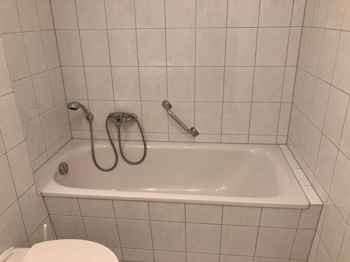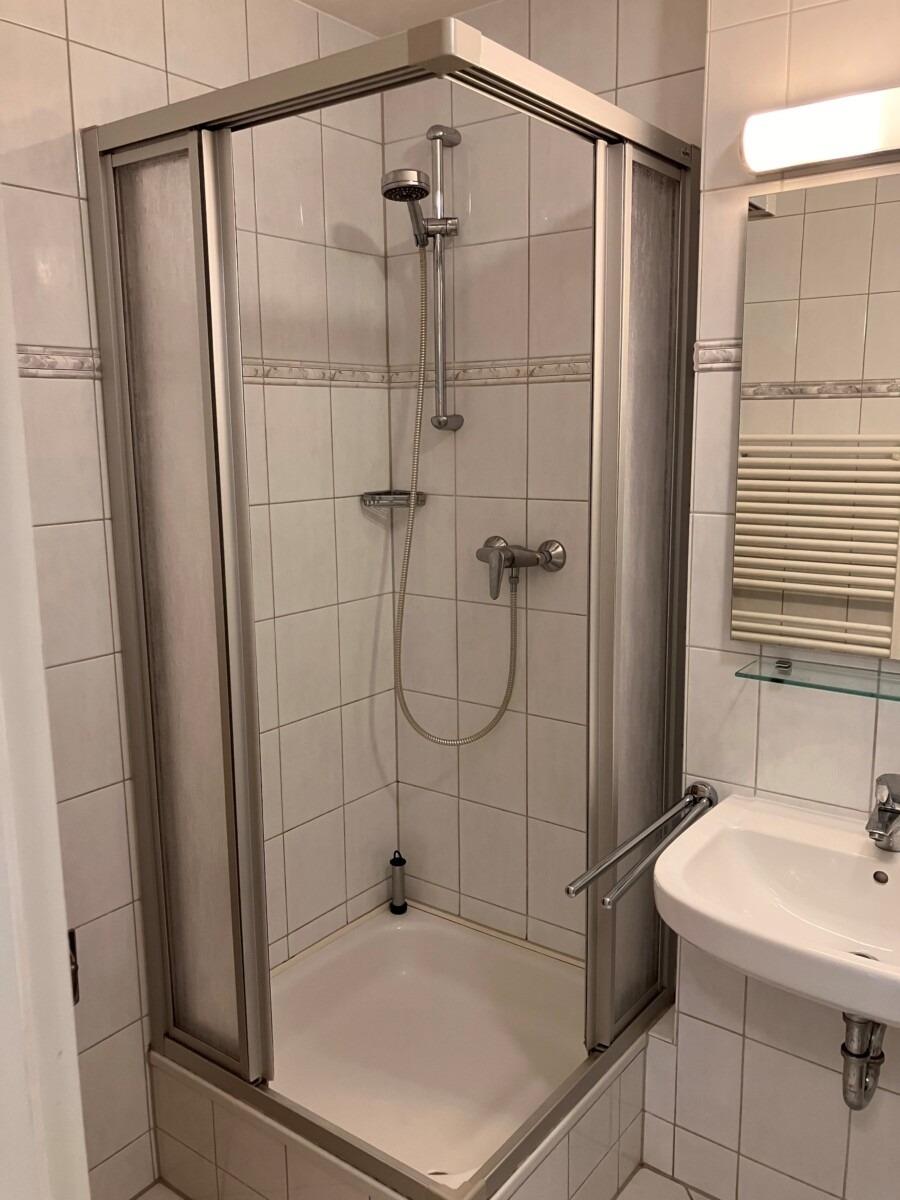 Bad mit Dusche, Badewanne, WC und Ablagemöglichkeiten