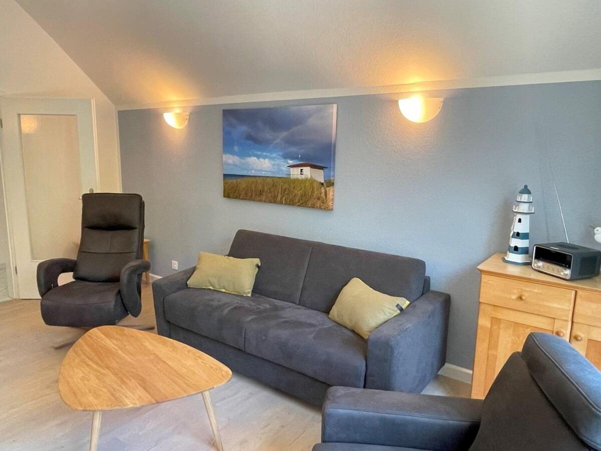 Wohnraum mit 55 Zoll-LED TV und UKW/DAB/Internet Radio, möblierter Balkon mit Blick auf die Kurpromenade in Richtung Meer, Essbereich mit massivem Holztisch und 4 Stühlen