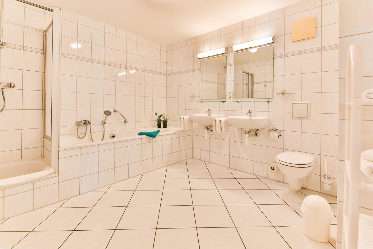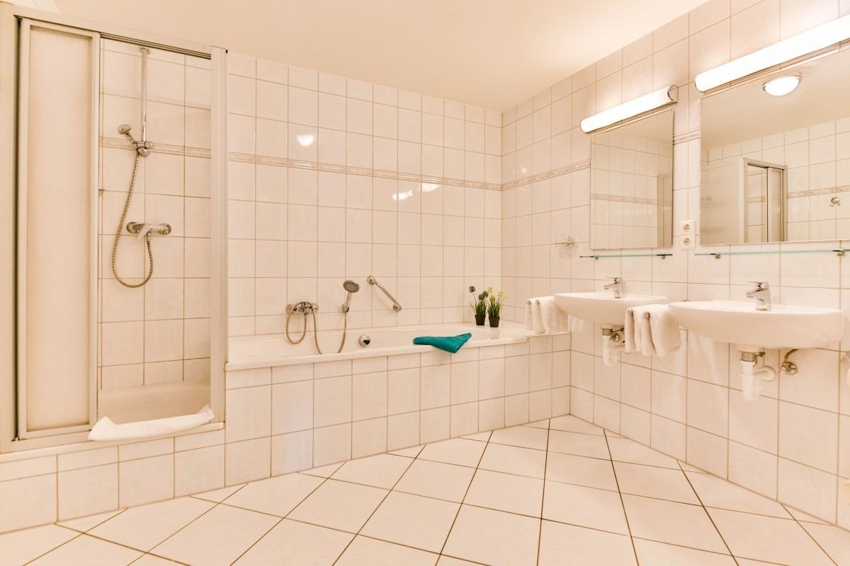 Großes Bad mit Dusche, Badewanne und Doppelwaschbecken
