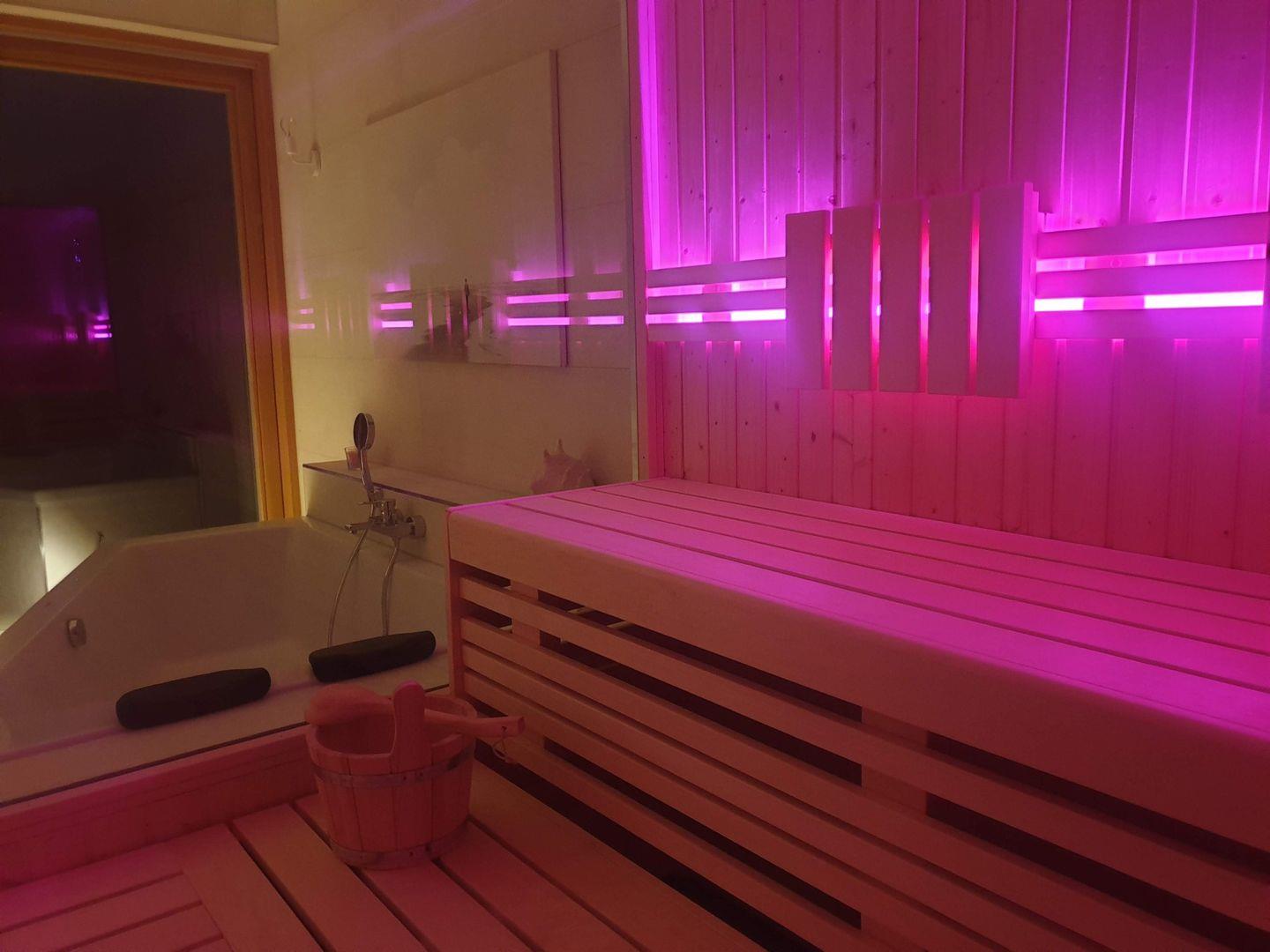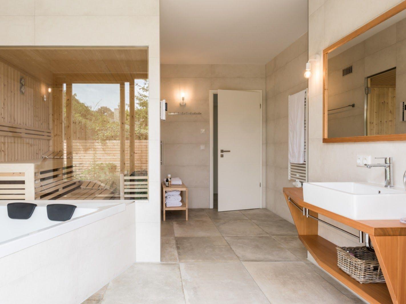 - 1 Wellnessbad: Sauna, Doppelbadewanne, Walk-in-Dusche, Zugang zur blickgeschützten Terrasse (nach dem Saunagang sehr angenehm)