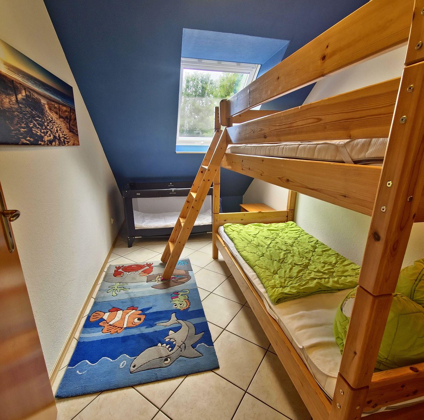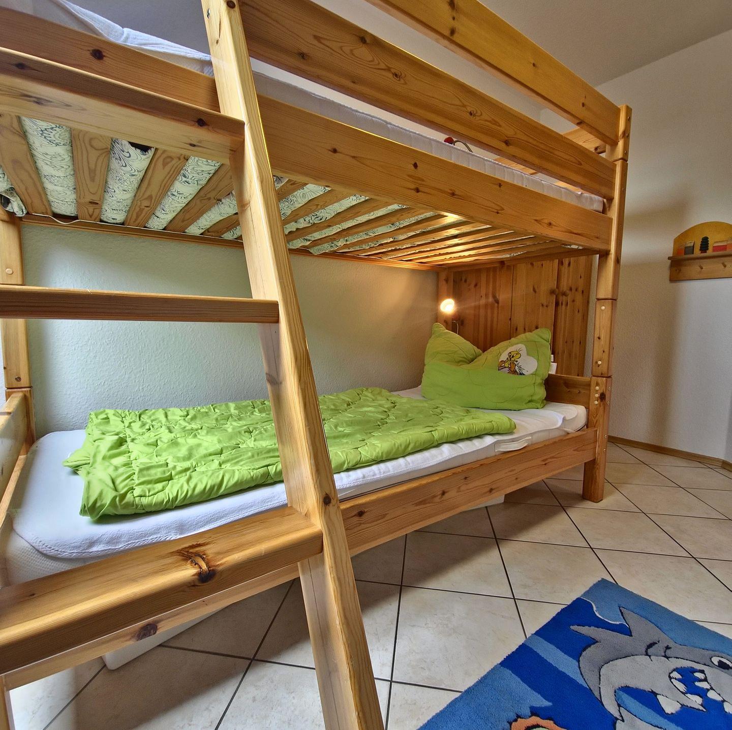 - **Schlafzimmer:** Das Schlafzimmer ist mit einem großen Bett ausgestattet, während das Kinderzimmer ein Etagenbett bietet. Für die Kleinsten steht ein Babybett zur Verfügung.