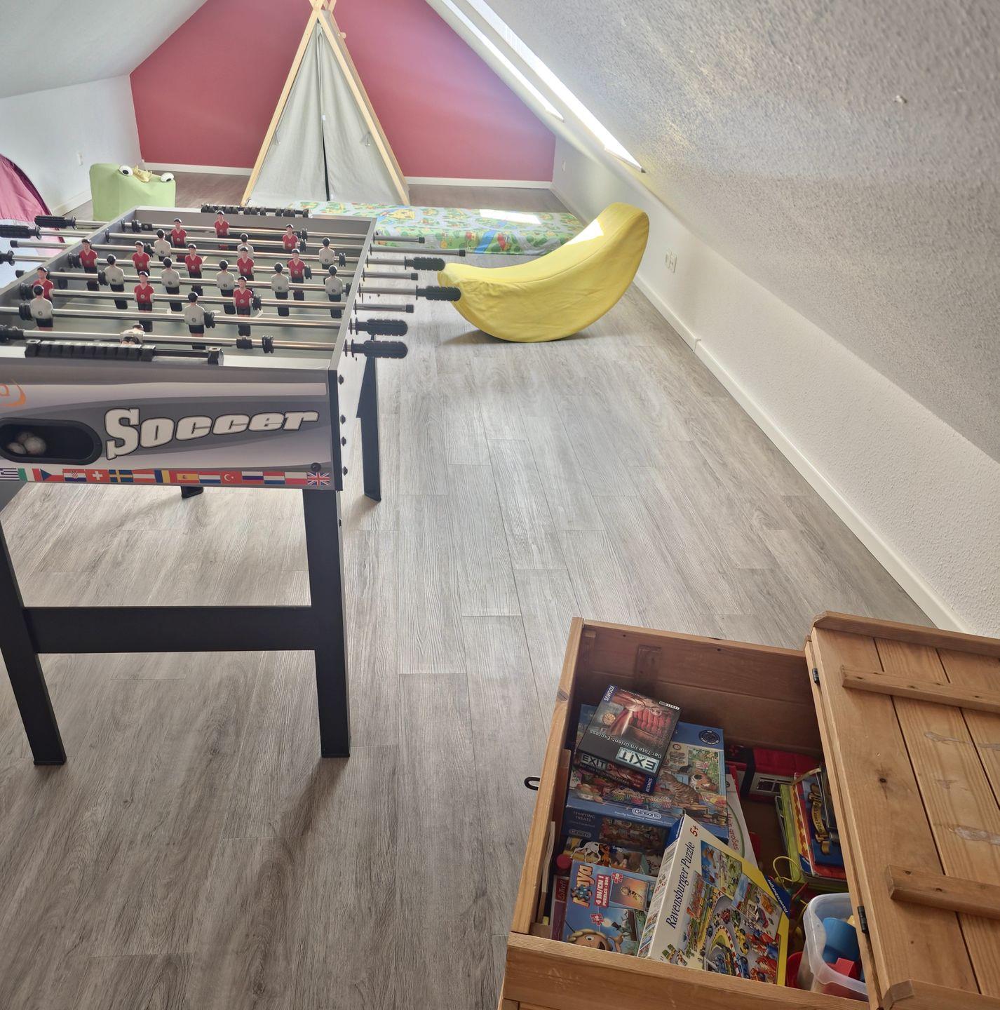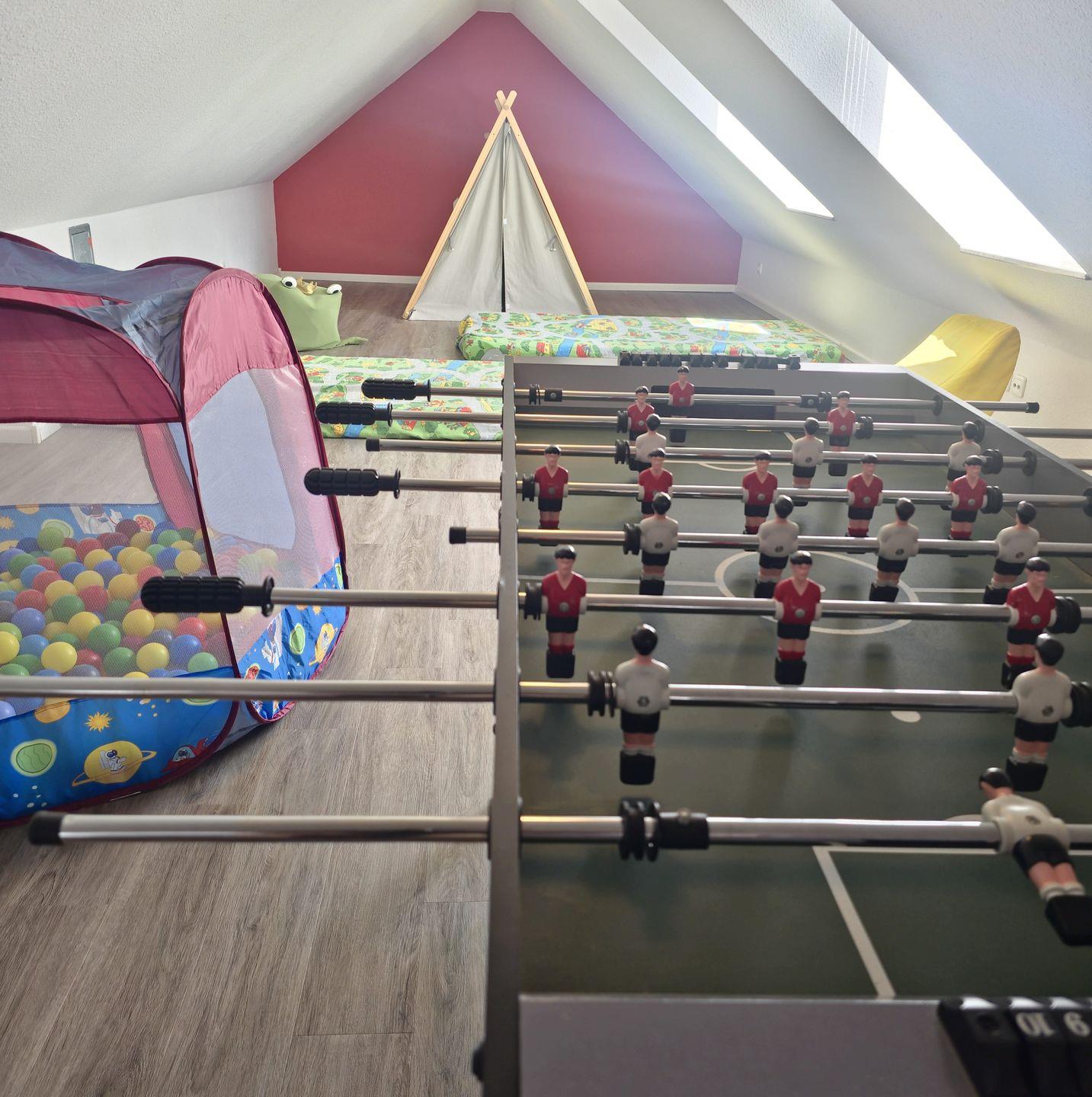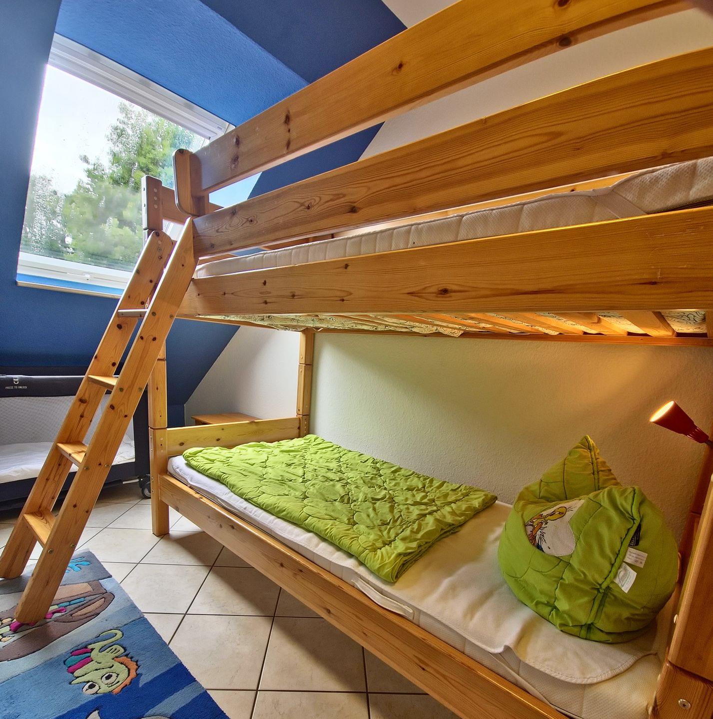 Das Schlafzimmer mit großem Bett und das Kinderzimmer mit Etagenbett sind perfekt für Familien. Im oberen Geschoss warten Spiele und Spielzeug sowie ein Kickertisch auf kleine Abenteurer.