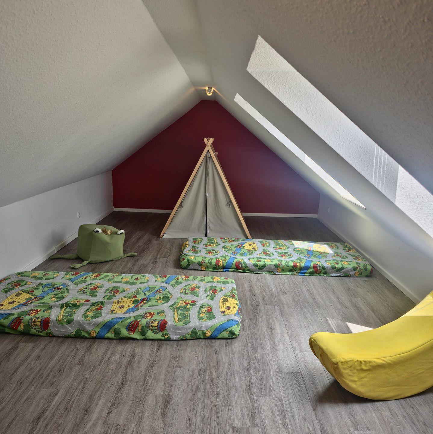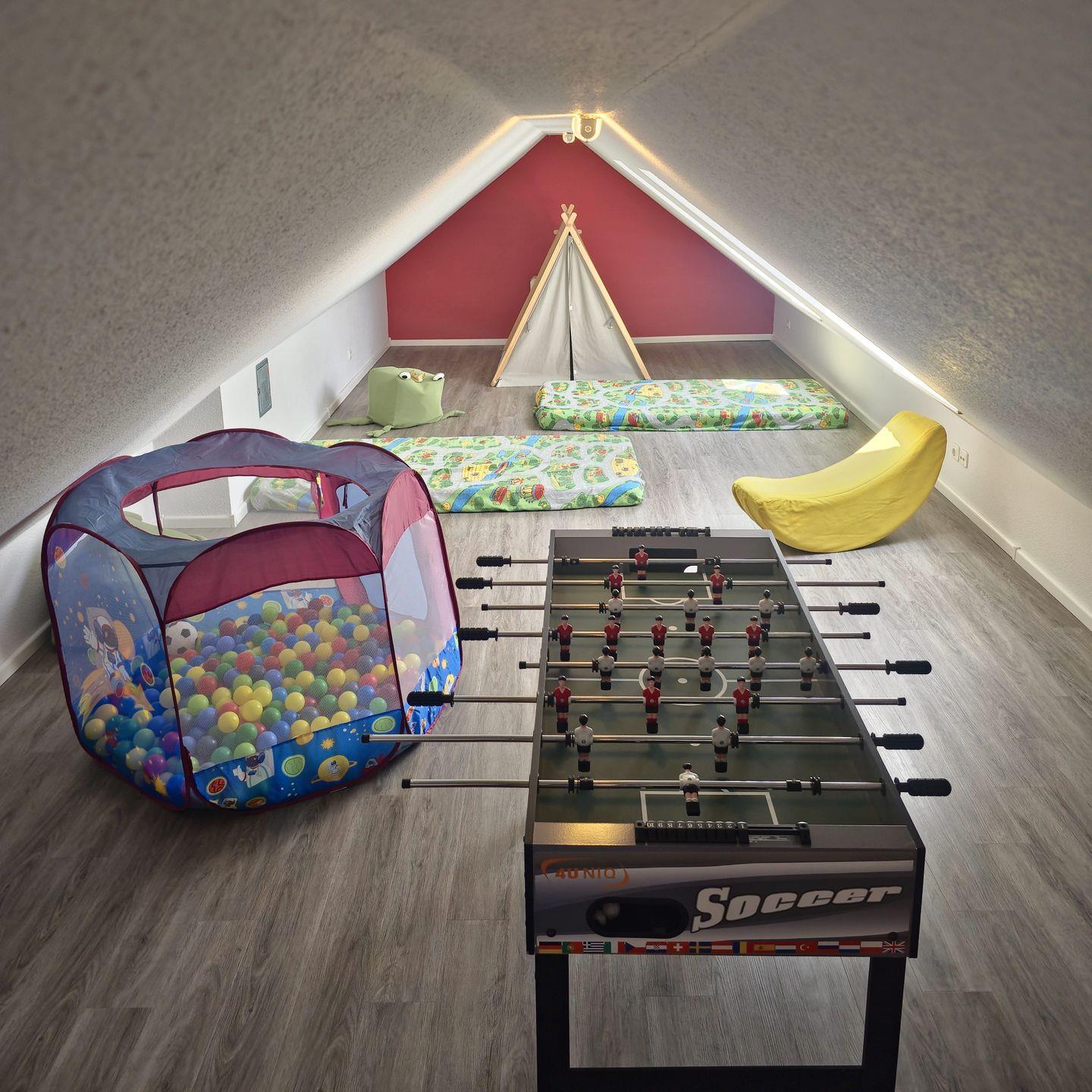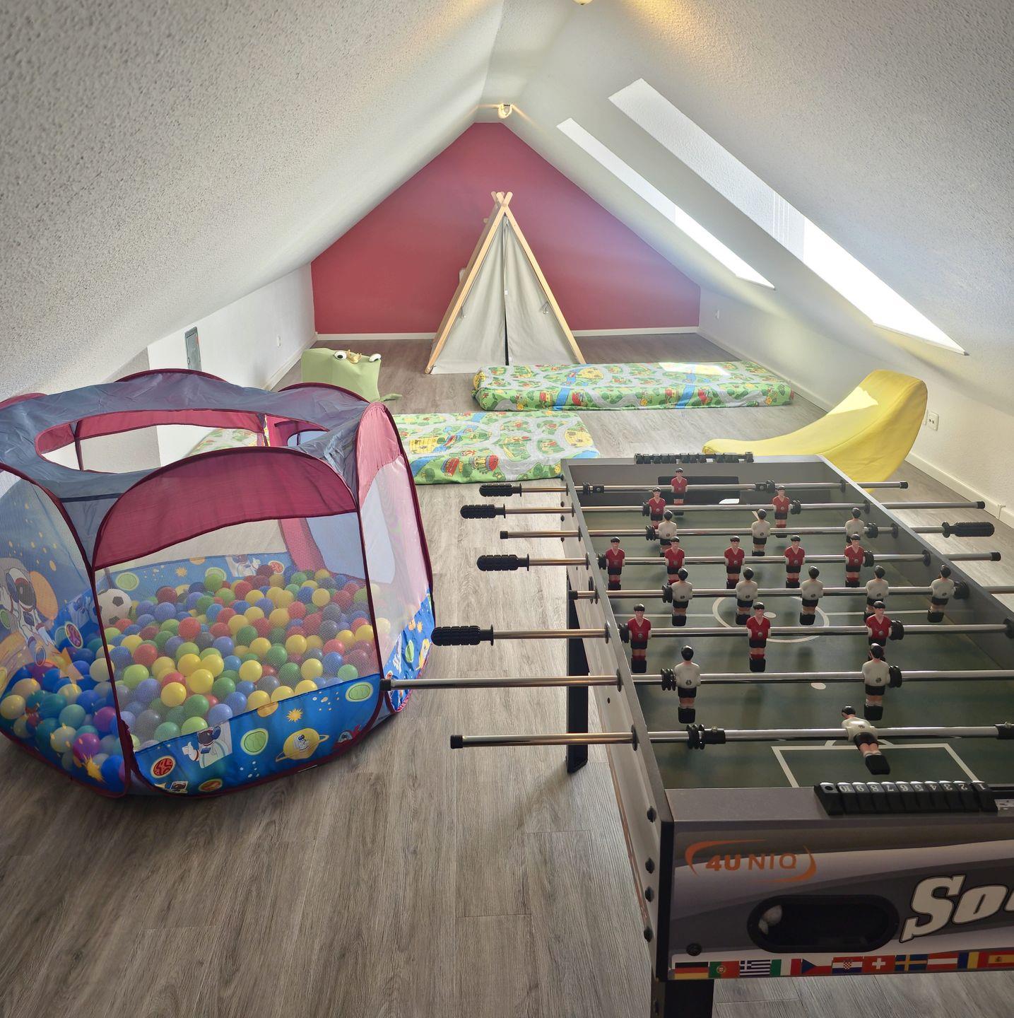 Das Schlafzimmer mit großem Bett und das Kinderzimmer mit Etagenbett sind perfekt für Familien. Im oberen Geschoss warten Spiele und Spielzeug sowie ein Kickertisch auf kleine Abenteurer.