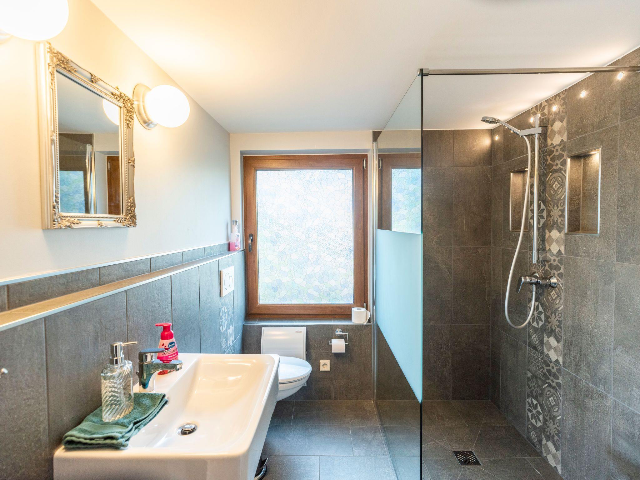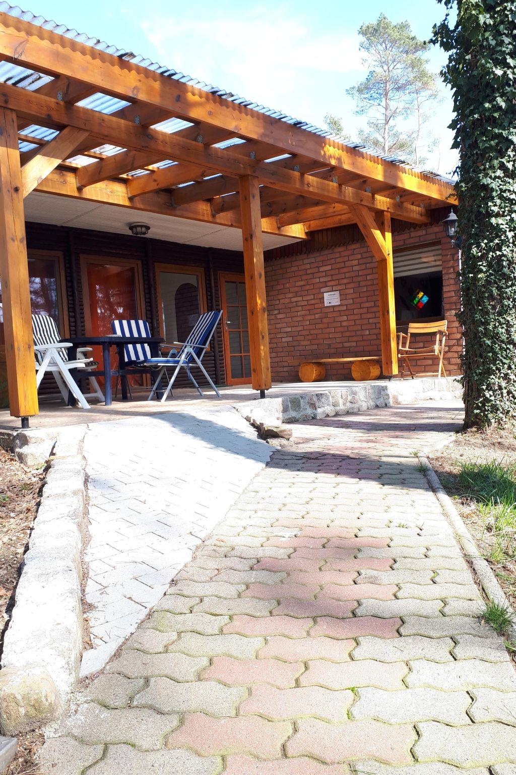 In the forest with a view of a clearing. Unfortunately, you cannot see the lake, which is approx. 150 metres away, from the house. Garitz lies on the edge of the Fläming. Ideal for cycling and hiking. The hut is barrier-free, but it is located in the forest. There are no stairs to climb. There is a tarmac path nearby. However, this does not lead directly to the house. Our property is paved from the garden door to the entrance and there is a ramp to the terrace. There is only an unpaved path in front of the garden door. This leads approx. 15 metres to the paved gravel road, which meets the asphalt road after approx. 80 metres. The doors in the house are 70 cm wide (internal dimensions) and have a small threshold of 1 - 3 cm.