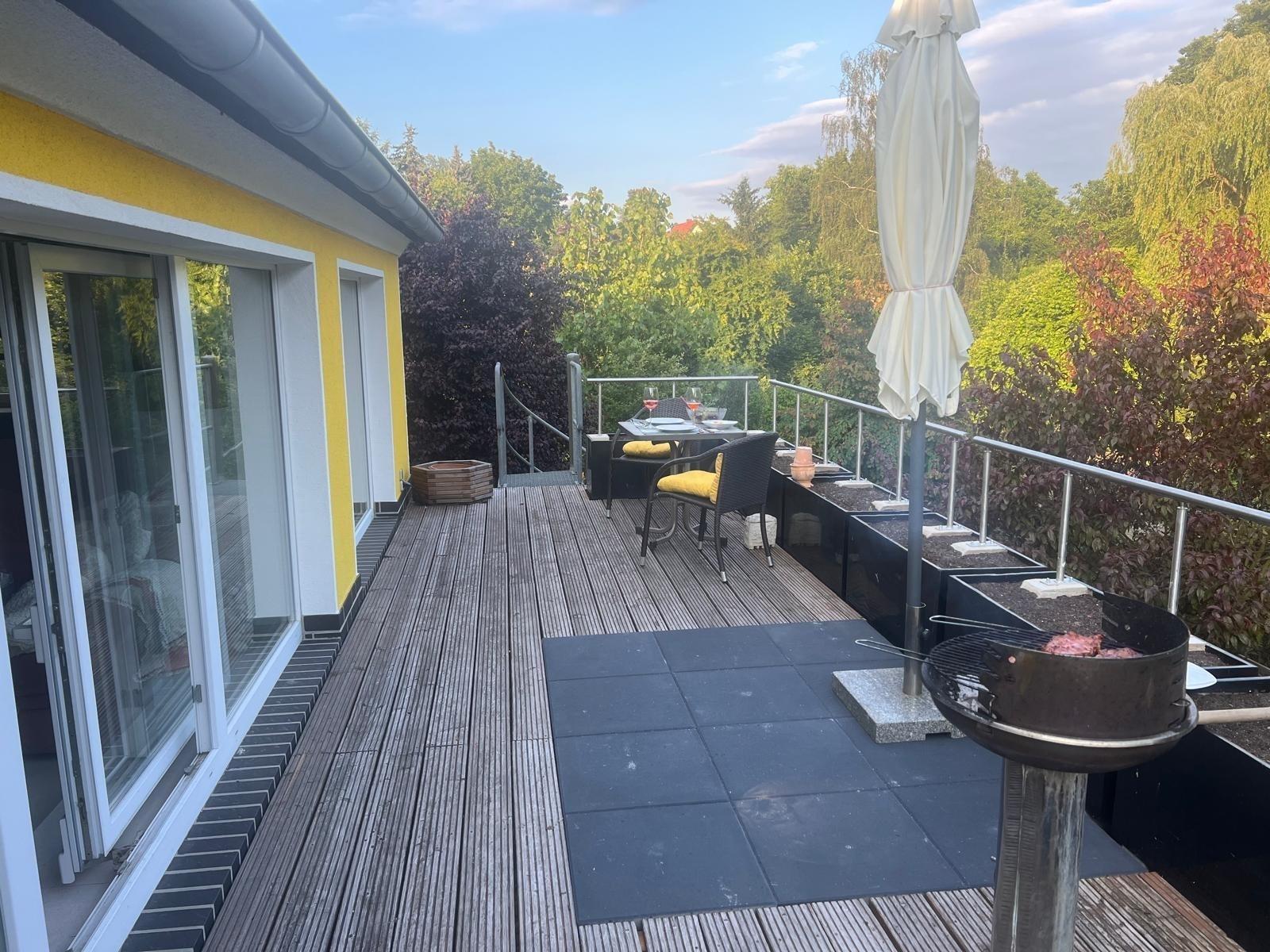 Von der Terrasse hast Du einen tollen Blick in den Garten und das anliegende Naturschutzgebiet.