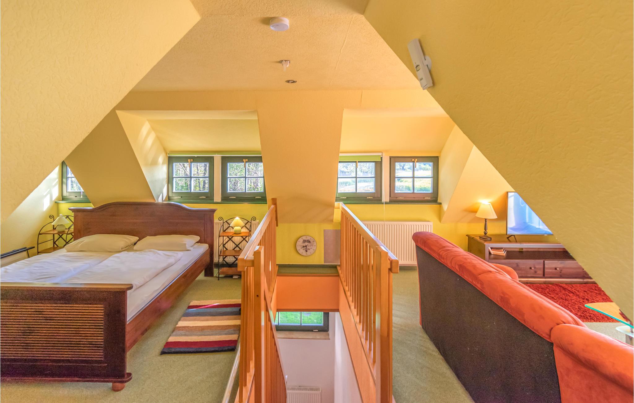 Her kan I slappe af og nyde en pause fra den travle hverdag. Med cirka 150 kvadratmeter er huset ideelt for to til seks personer. I det forreste område ligger et køkken og opholdsstue med gulv til loft-vinduer og en lille smukt anlagt terrasse. Her kan I få en afslappet morgenmad og med lidt held se rådyr og hejrer på engen overfor. Der er gode faciliteter, lige fra fjernsyn til opvaskemaskine, mikroovn, kaffemaskine og service. Badeværelset med bruser og toilet er også godt indrettet - I finder også et åbent soveværelse med dobbeltseng. I stueetagen er der endnu et soveværelse med dobbeltseng.