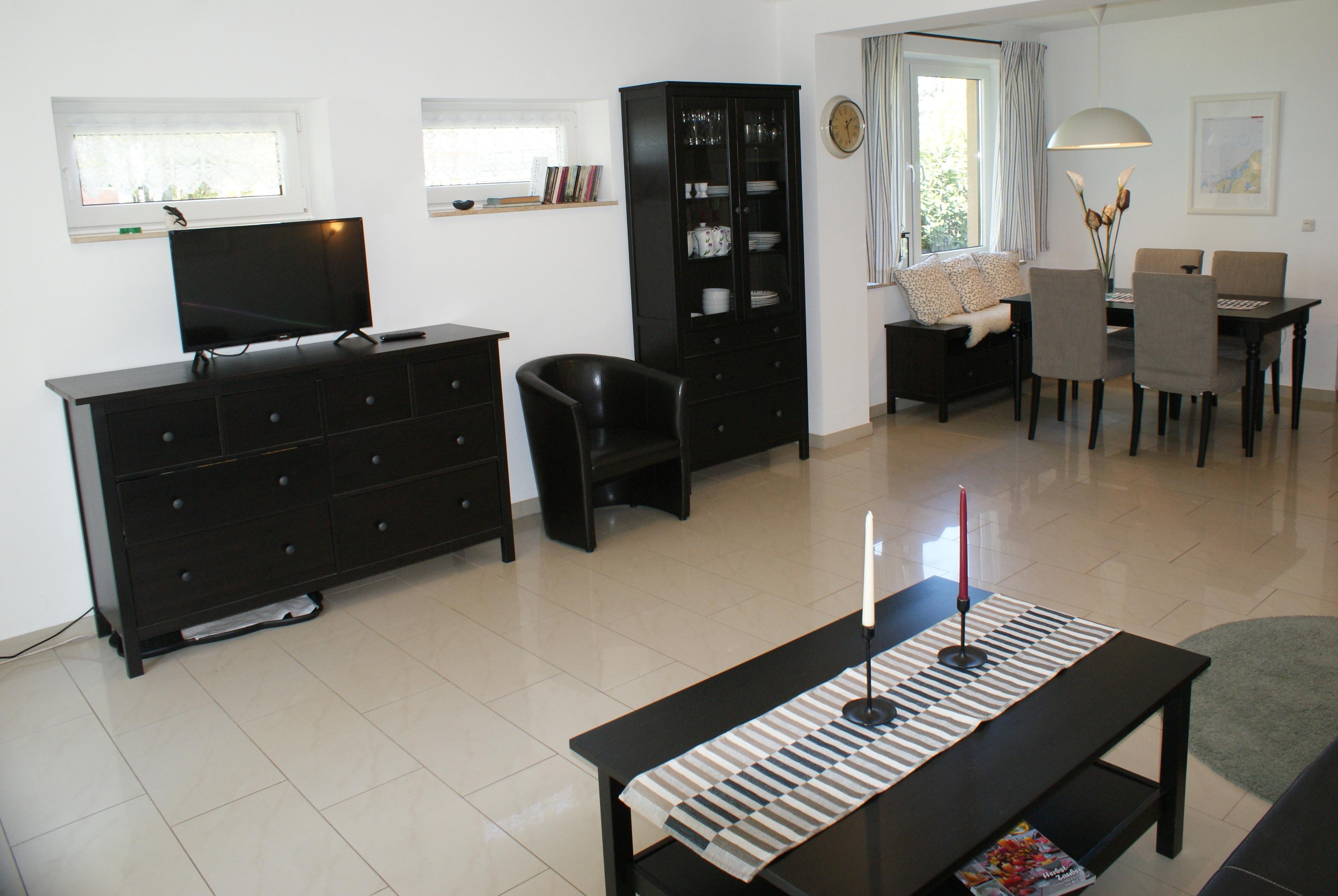 - Wohnzimmer mit Couch (mit Schlaffunktion für 2 Personen), TV, Radio, Essbereich für 4 Personen